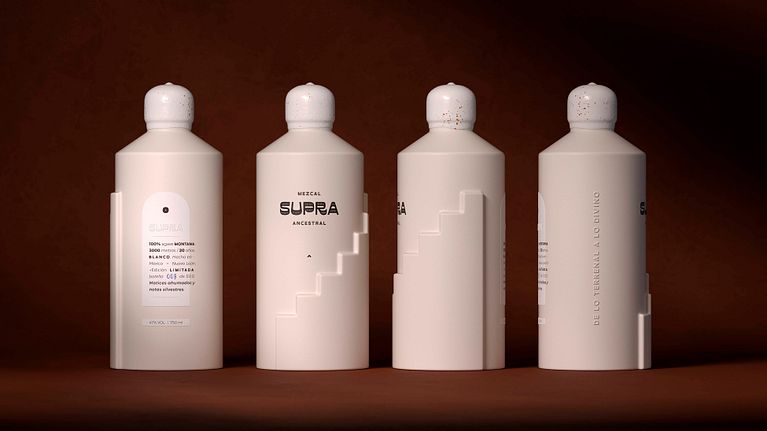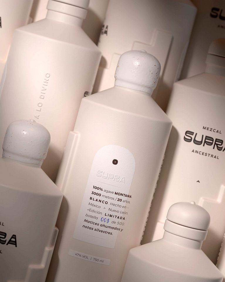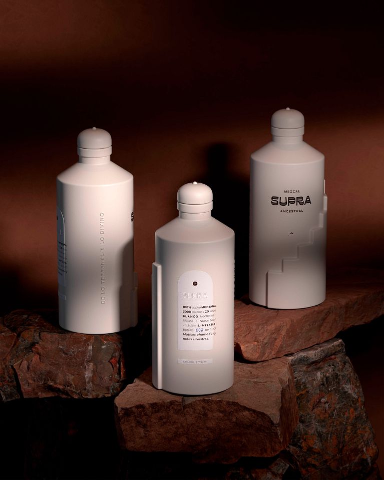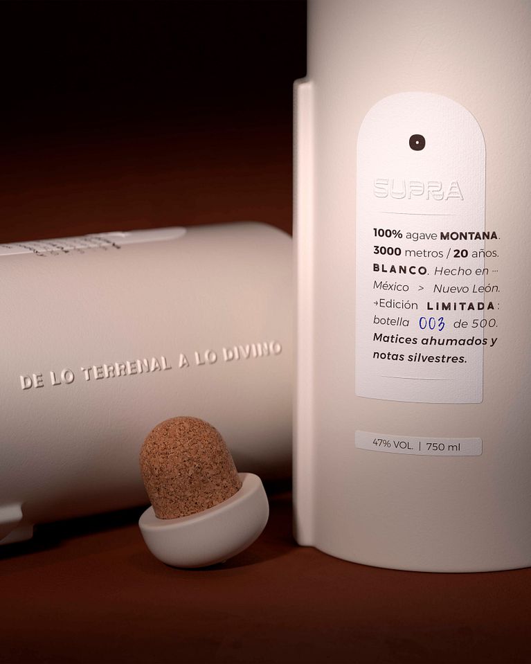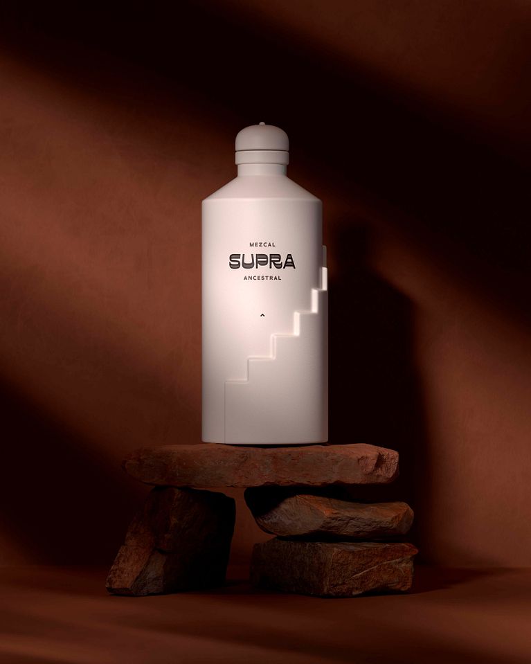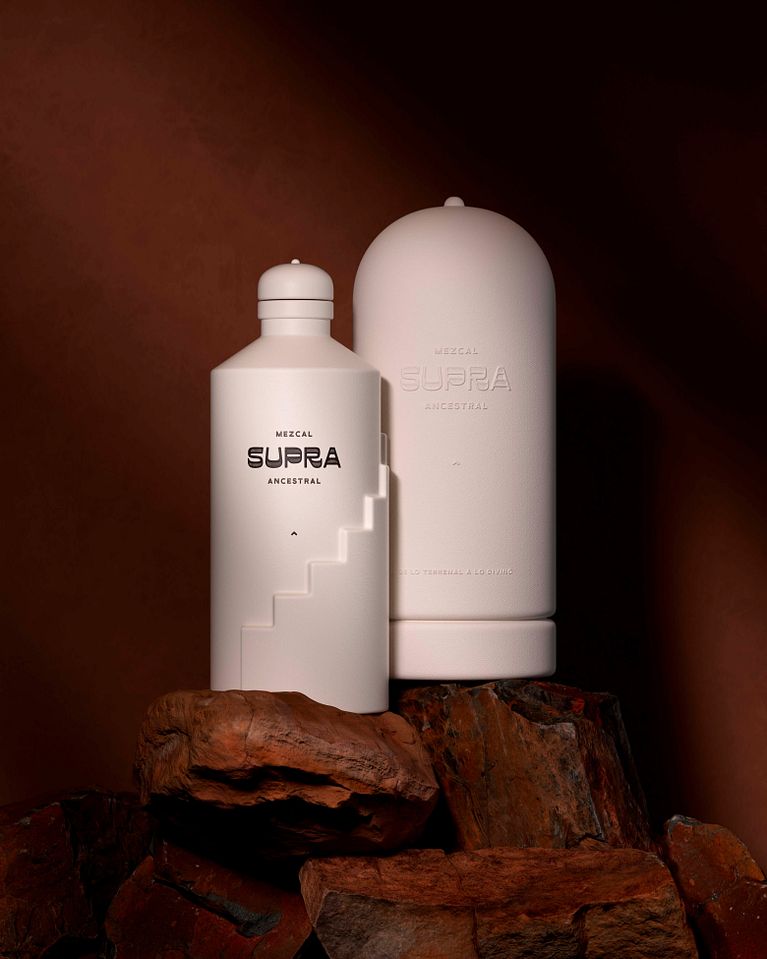 El diseño está inspirado en este contexto y en la diosa Mayáhuel, símbolo de fertilidad y abundancia, protectora de la planta del agave. “Supra” significa “arriba” en latín, evoca la elevación espiritual que propone el mezcal, una experiencia conectada con los dioses.