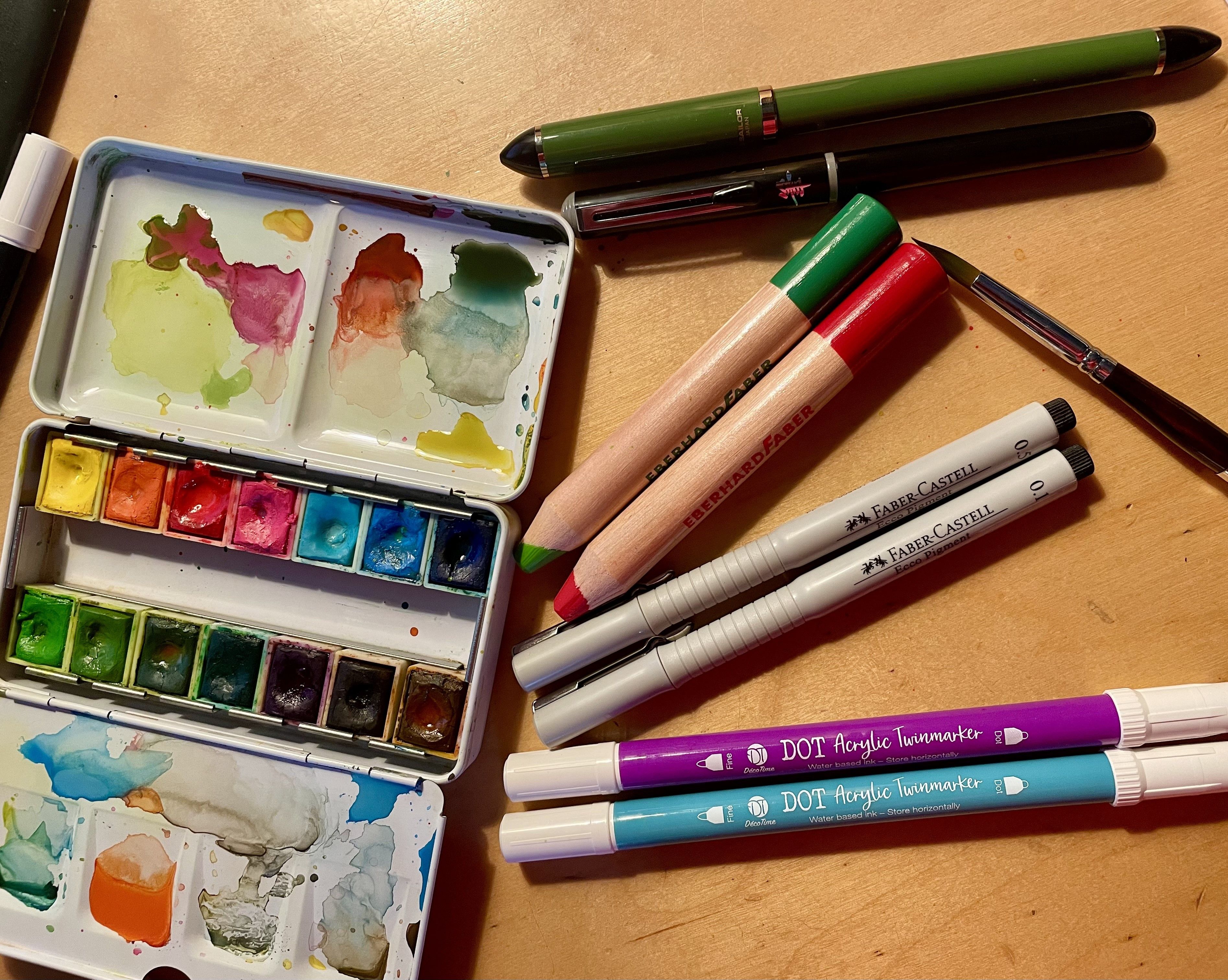 Einmal querbeet: Aquarellfarben, Tinte, Fineliner, Acrylstifte und Wachsmalstifte.