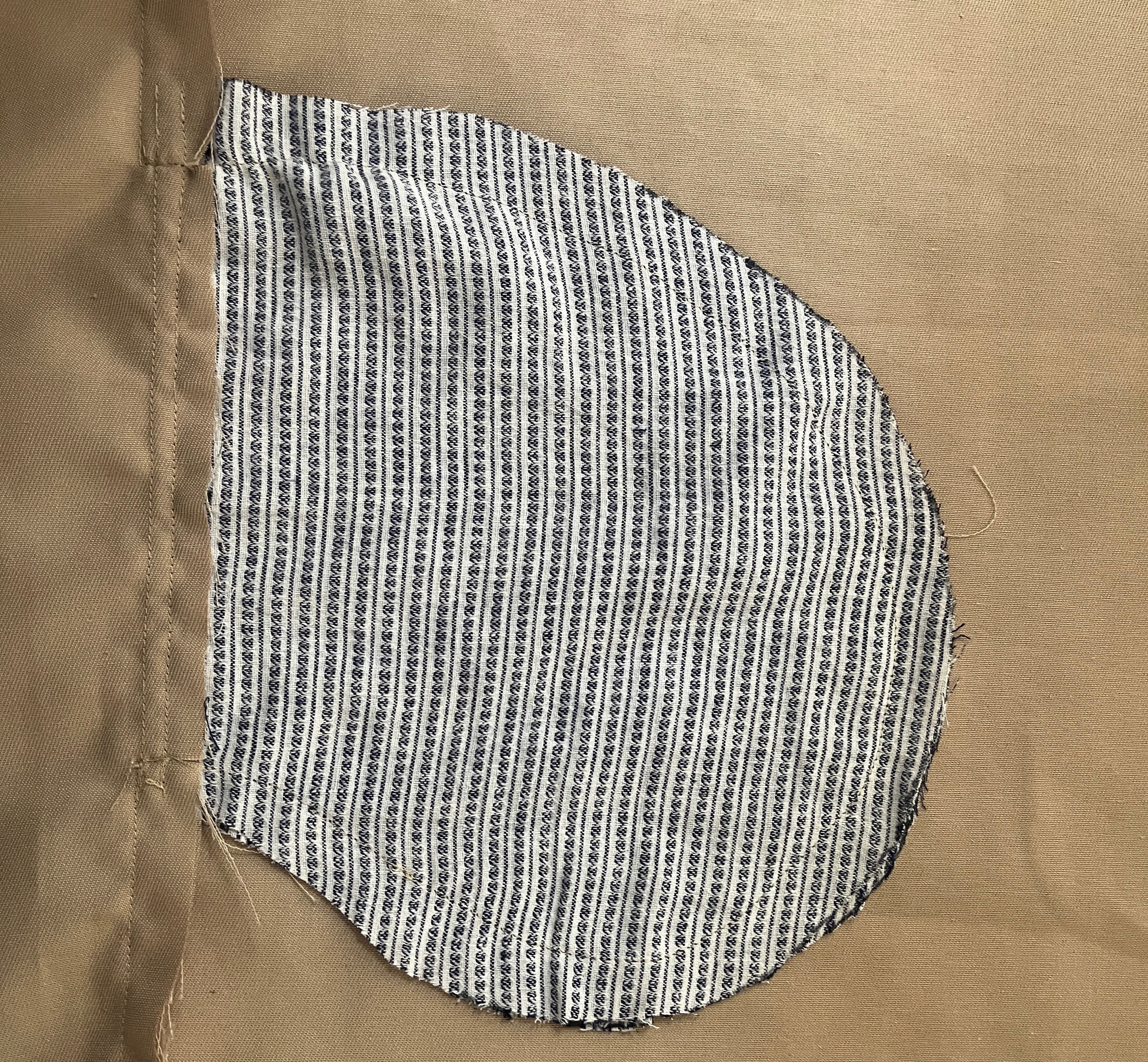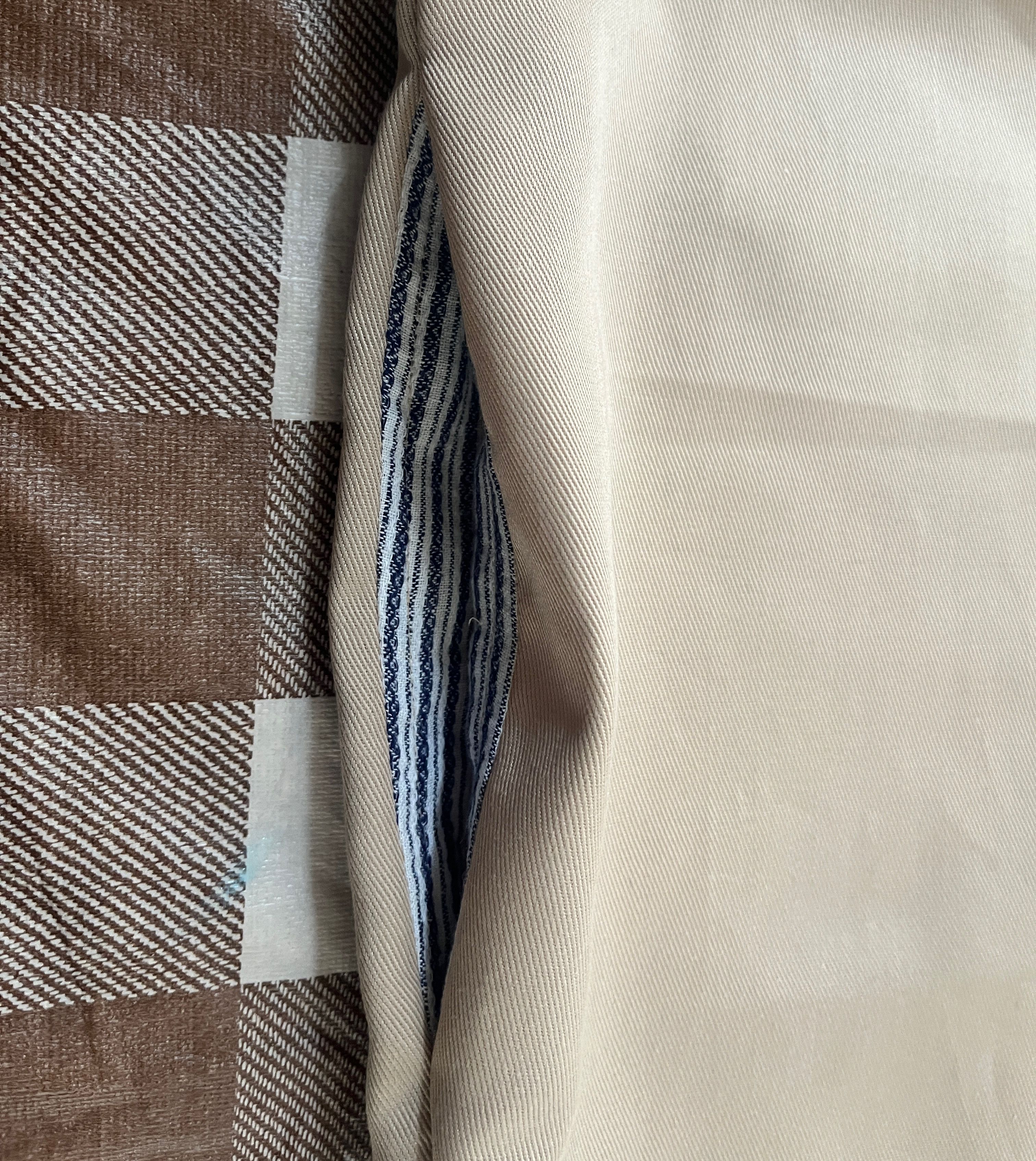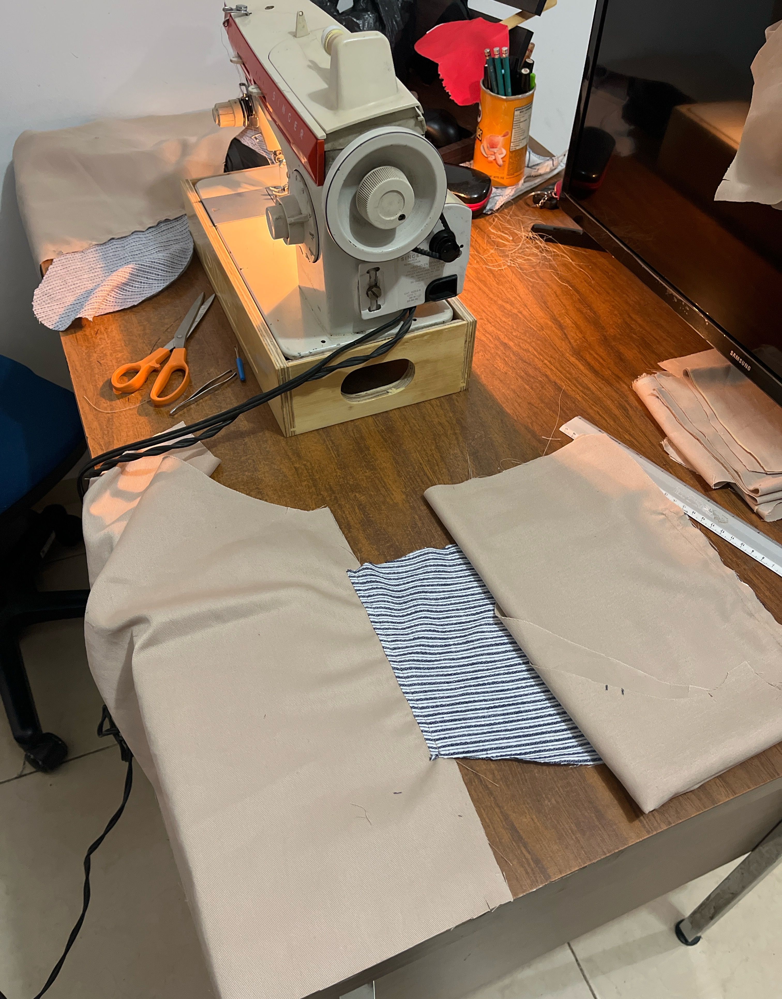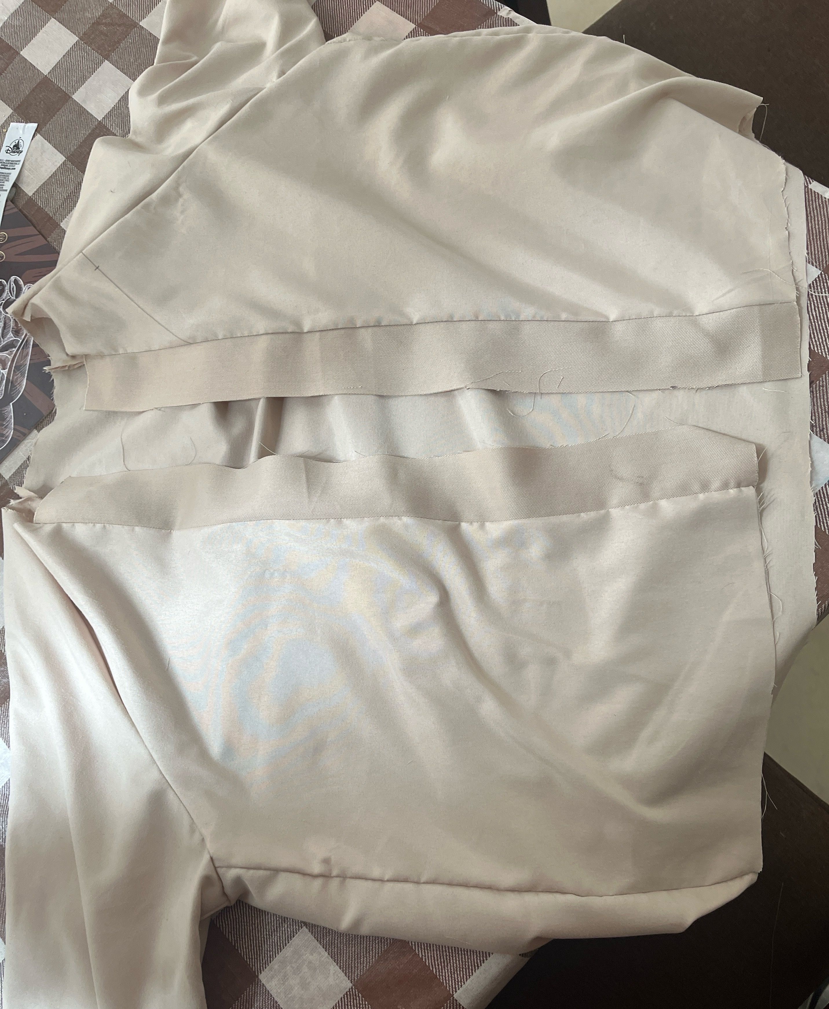 El material que decidí usar para la tela principal es un twill de algodón en color arena o beige el forro de la misma es un popelina de poliéster del mismo tono ligeramente más claro y el rib es color capuchino que como dato curioso lo recicle de un suéter de mi armario el cual ya no usaba debido a que en mi ciudad no encontré esta tela, mi opción era comprarlo en línea pero decidí reutilizar el suerte y el resultado fue genial, para los bolsillos también reciclé la tela de una camisa que ya no me quedaba que es una tela de algodón ligera.