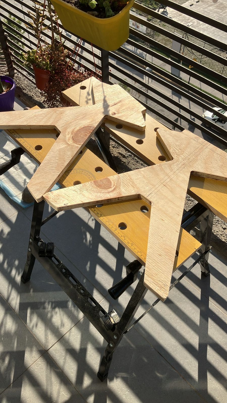 Terciado estructural 18mm, barniz marino y cola fría. Aparte de todas las herramientas.