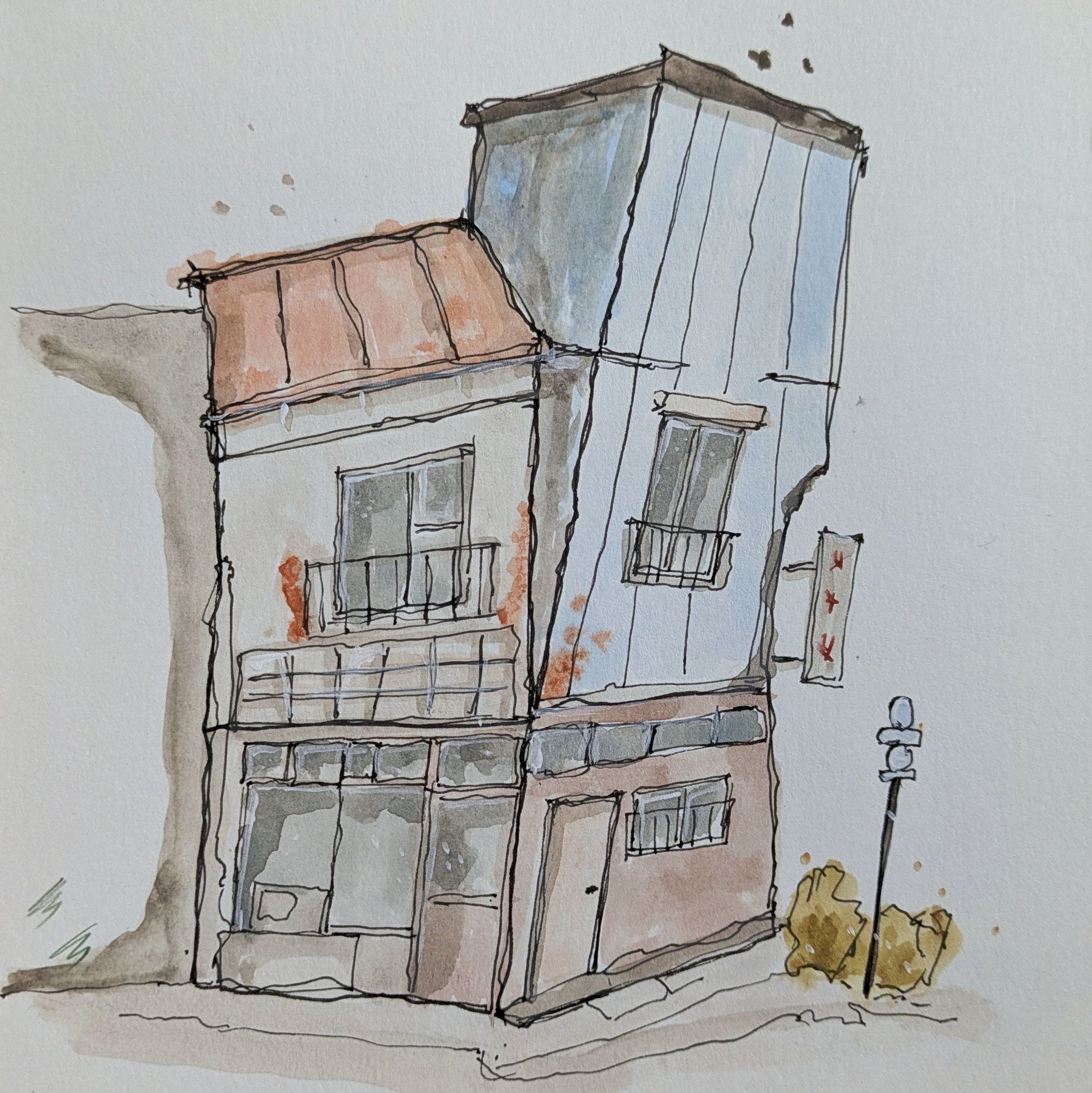 I made a very rough sketch of the house at first, just to practice to "write" the lines and test the colour palette. I already liked this one a lot, even though the house does not make any sense.