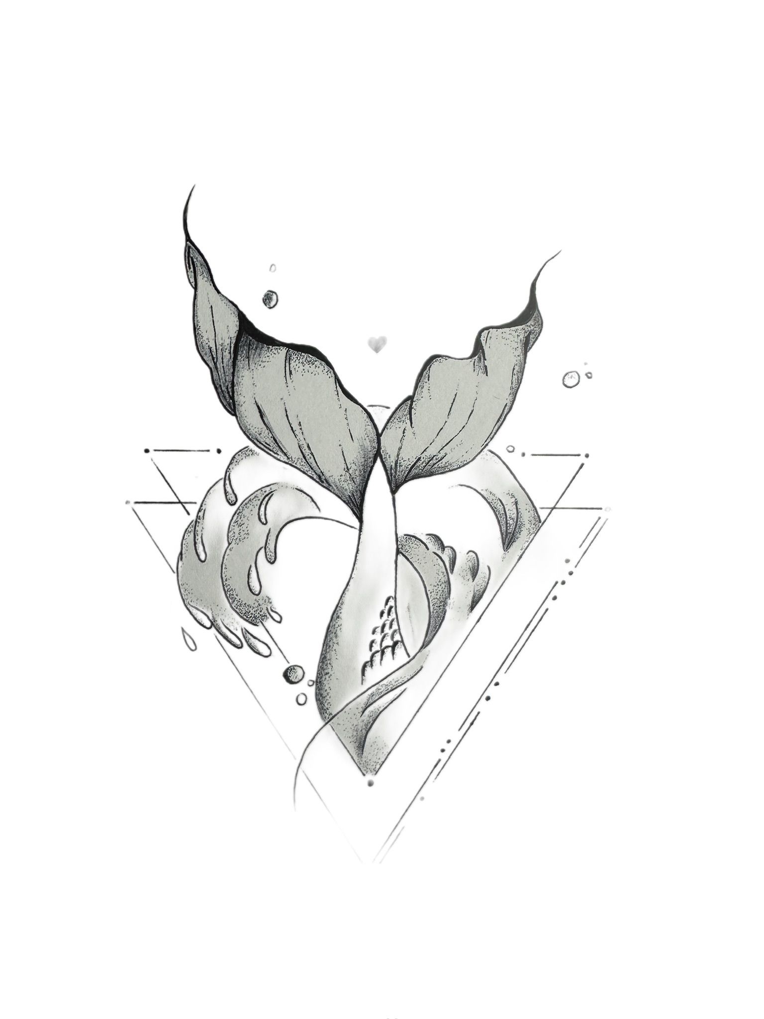 La coda di sirena rappresenta la forza del mito, il richiamo al mistero e all’inconscio profondo legato all’elemento acqua. Gli schizzi e le onde simboleggiano il movimento vitale e la capacità di trasformazione.