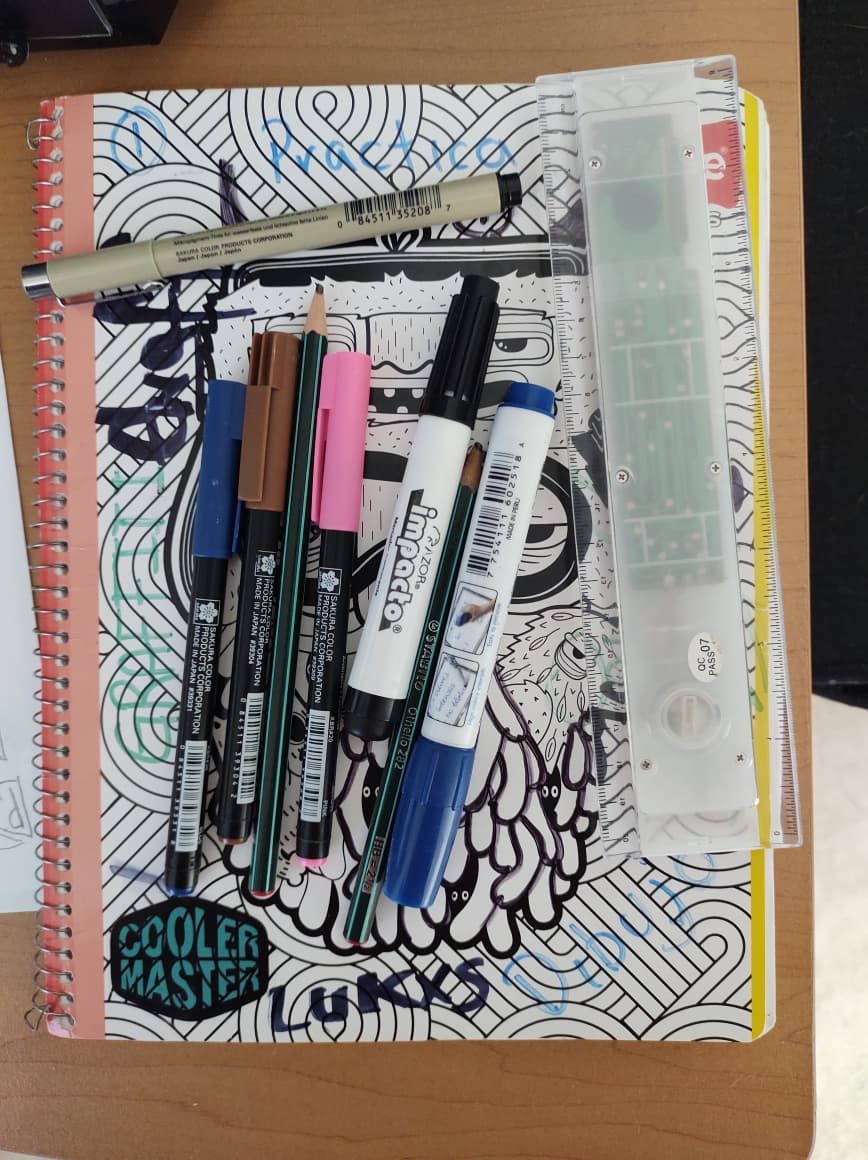 Libreta de bocetos, computadora con Adobe Suite, brochas y pintura acrilica