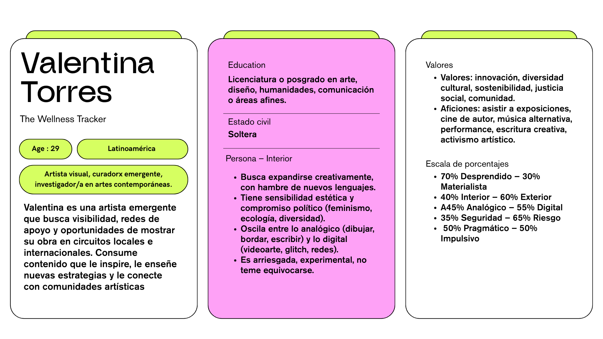 Define el perfil de mi audiencia ideal bajo el nombre arquetípico Valentina Torres: artista visual latinoamericana que busca visibilidad y redes de apoyo. Aquí se especifican datos demográficos, valores, aficiones y porcentajes de personalidad (desprendida, experimental, digital, arriesgada). Este perfil es el punto de partida para orientar mi estrategia de comunicación.
