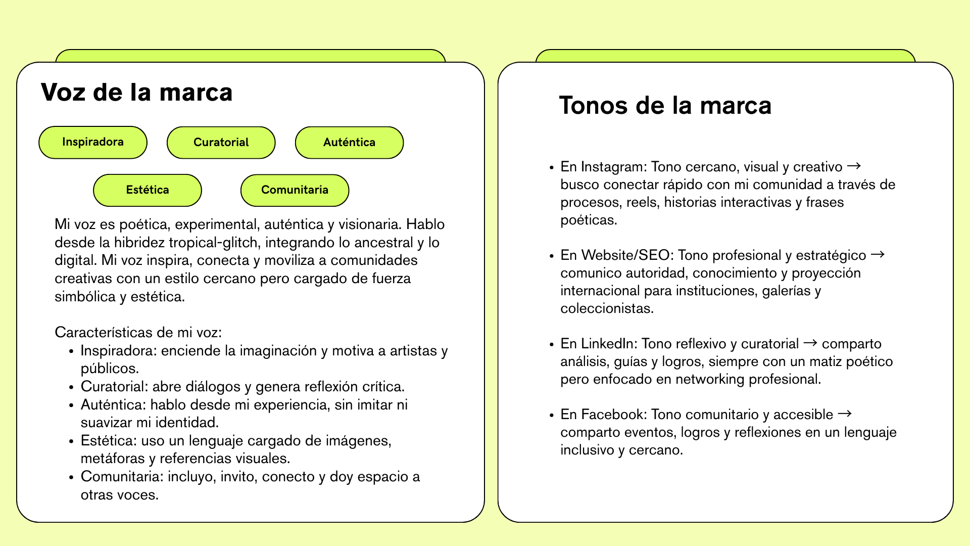 Explica la voz de mi marca personal: poética, experimental, auténtica, estética y comunitaria. A su vez, define cómo adapto el tono según la plataforma: cercano y visual en Instagram, estratégico en mi Website, reflexivo en LinkedIn y comunitario en Facebook.