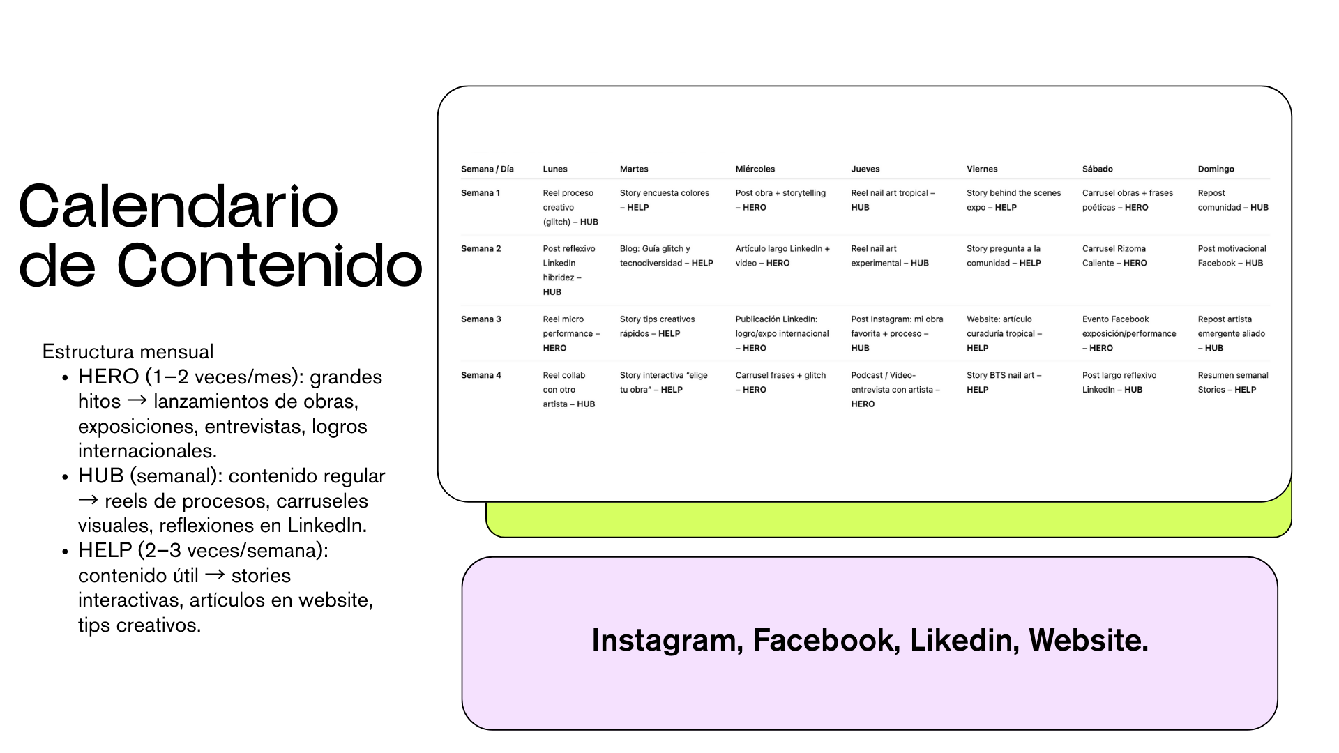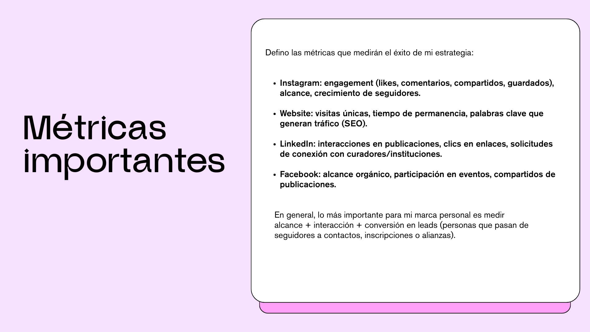 En general, lo más importante para mi marca personal es medir tres grandes pilares: alcance, interacción y conversión en leads. Alcanzar nuevas audiencias, generar conversaciones y, finalmente, transformar ese interés en contactos, inscripciones o colaboraciones, es lo que asegura la sostenibilidad y expansión de mi proyecto artístico y curatorial.