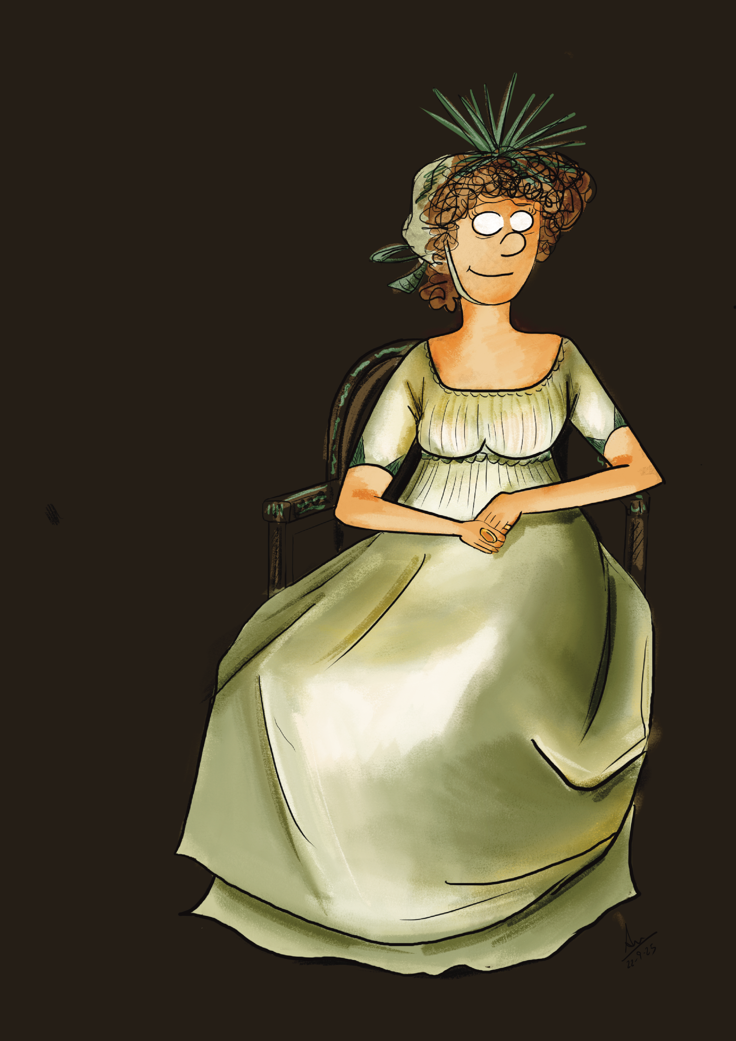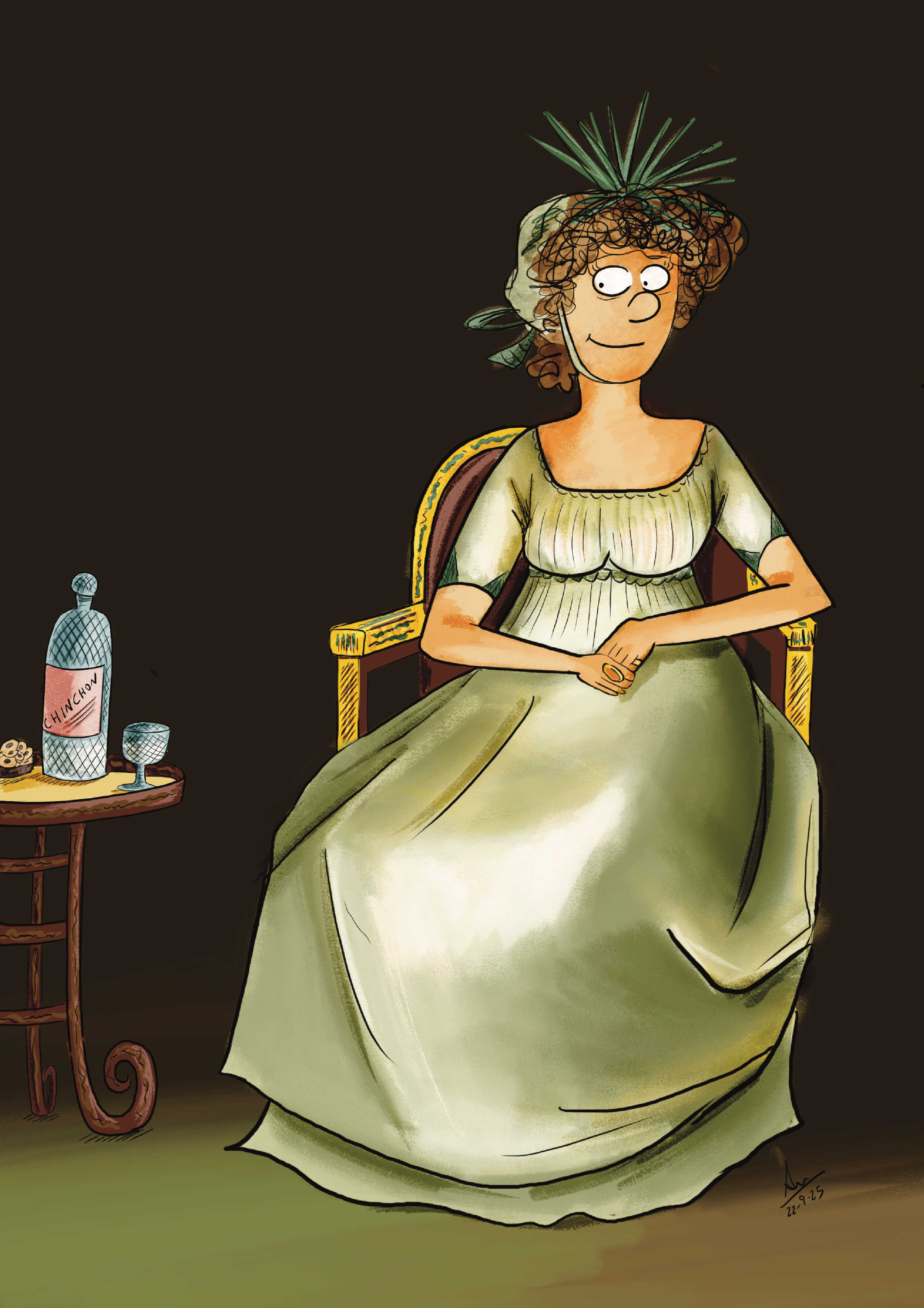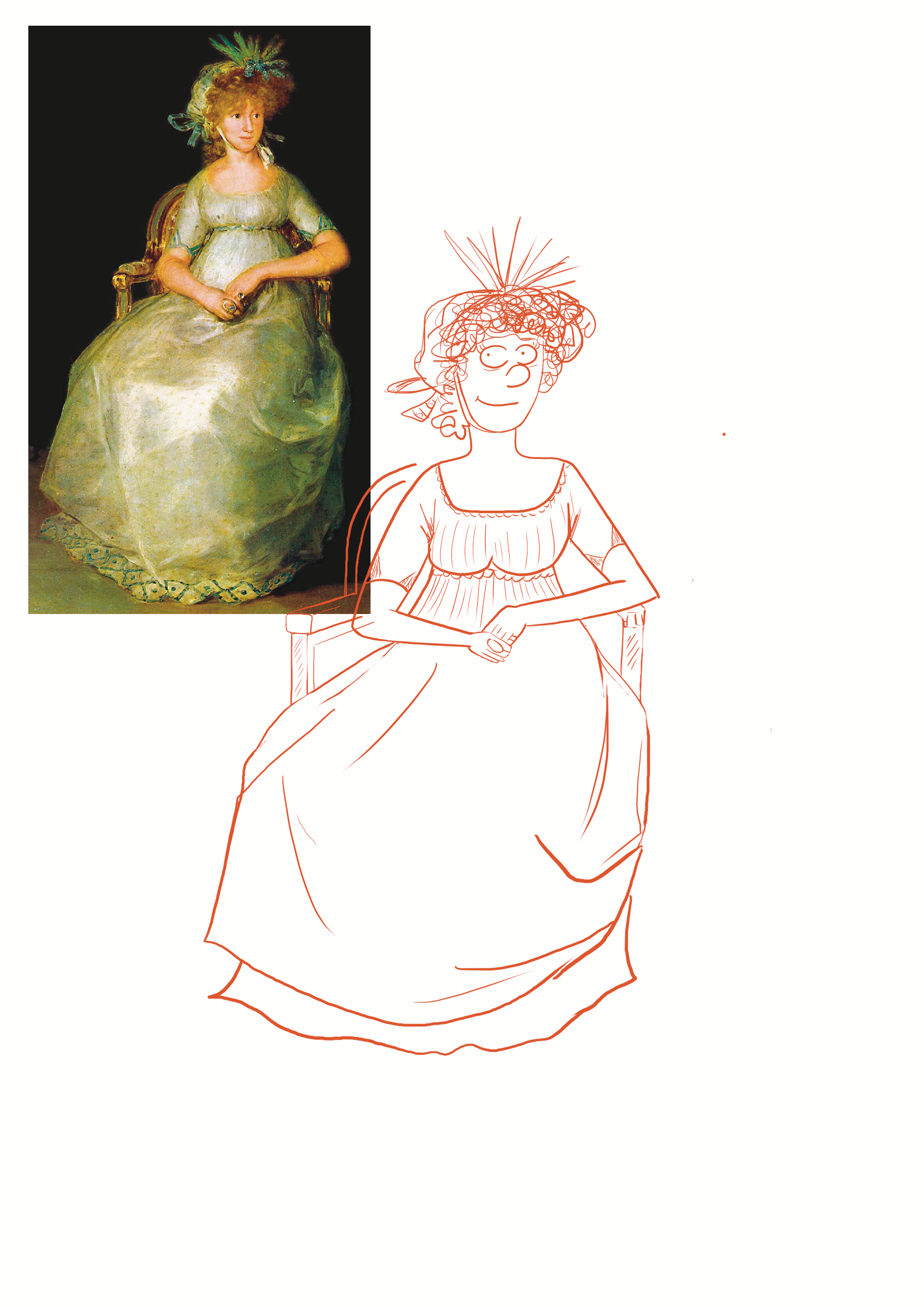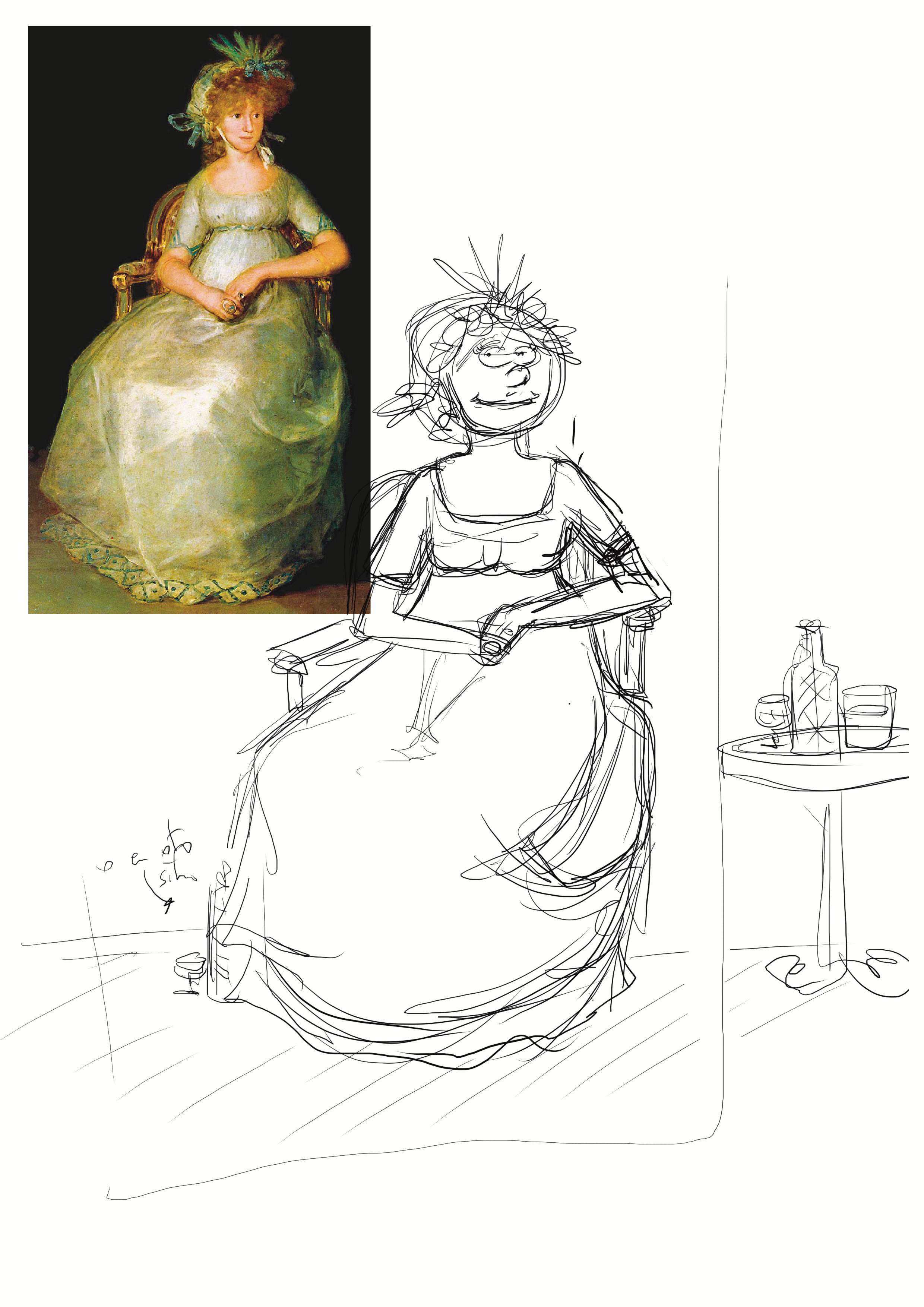 ¡La condesa no tiene pupilas!, si, es que hay que ver lo que está mirando…. Se le añade el suelo, color a la silla y la mesita, todo en otras capas, sin intento de realismo, claro, que para eso ya estaba Goya….