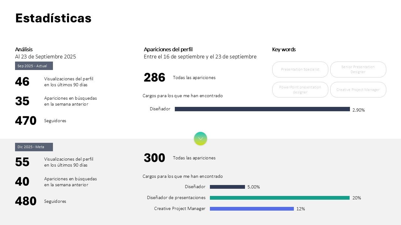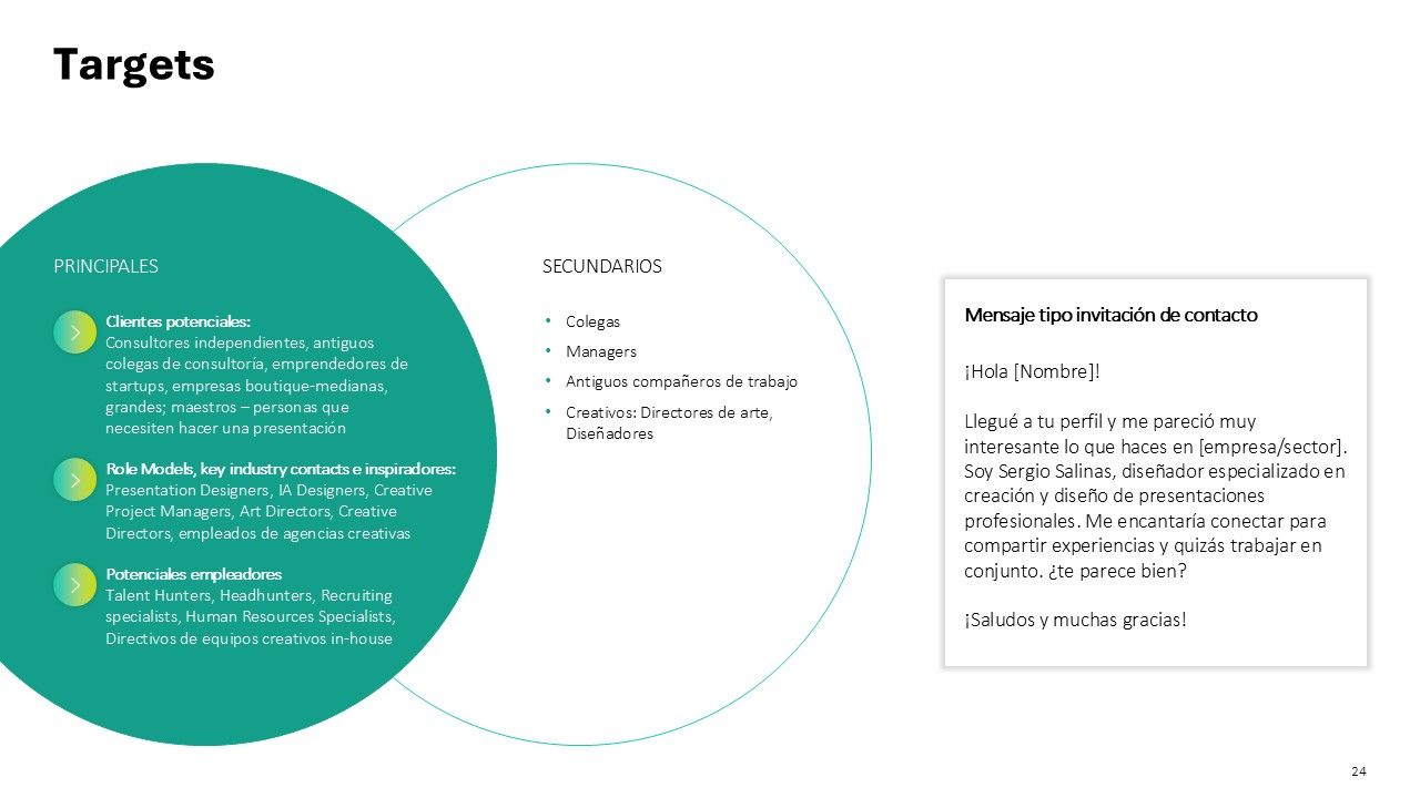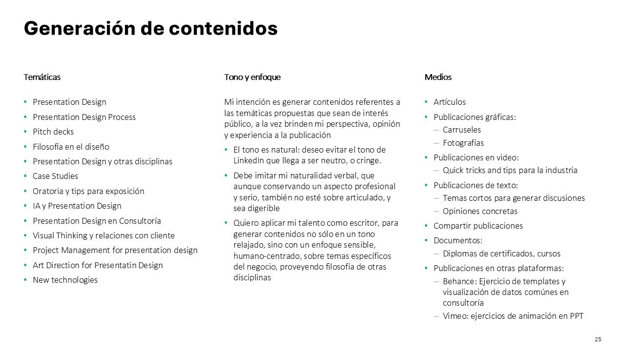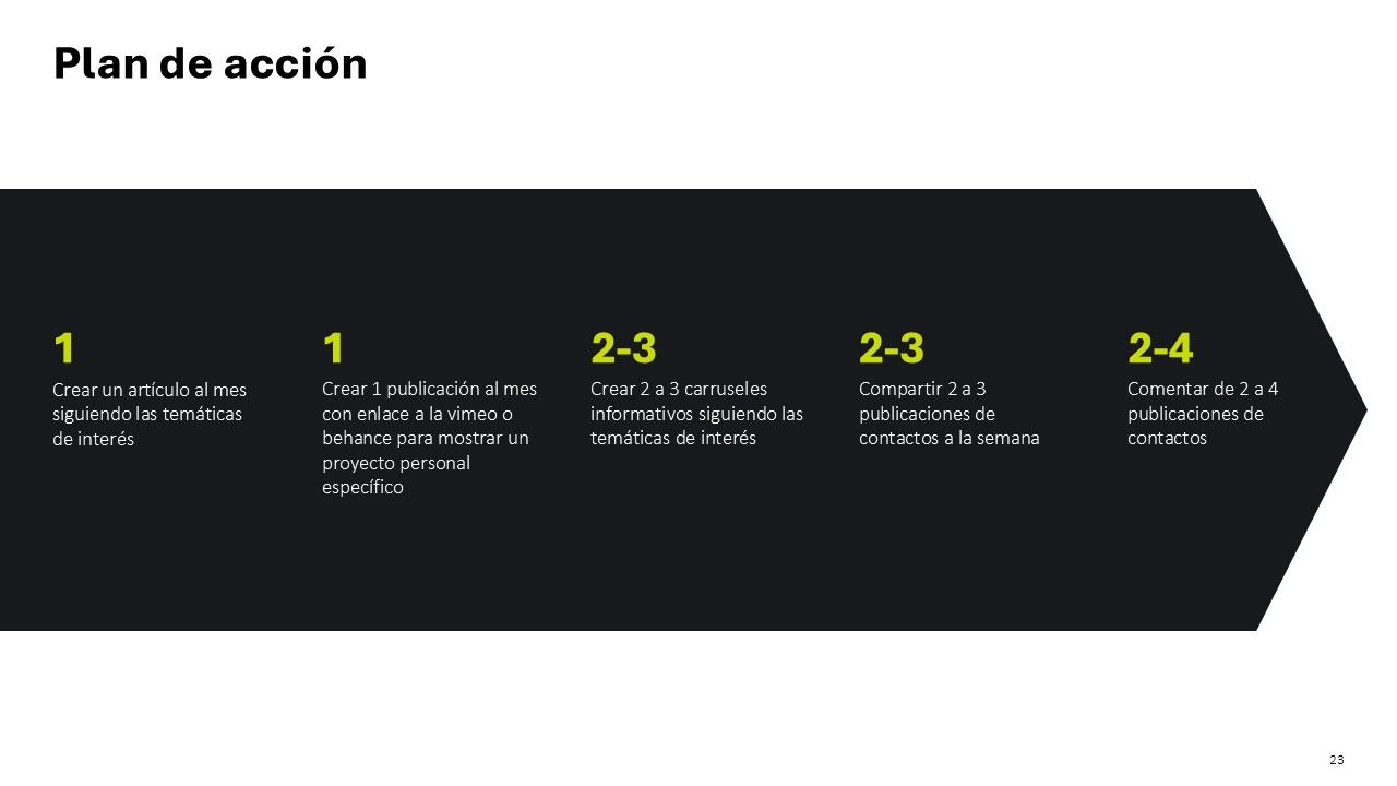 A partir de los contenidos guiados por Nuria en este curso, comencé la construcción de mi marca personal como diseñador de presentaciones PowerPoint, y para plasmar mi proyecto, decidí hacer una presentación con todos los puntos de desarrollo del curso, y estableciendo un plan de crecimiento y monitoreo en LinkedIn, con el fin que conseguir clientes o un nuevo empleo.