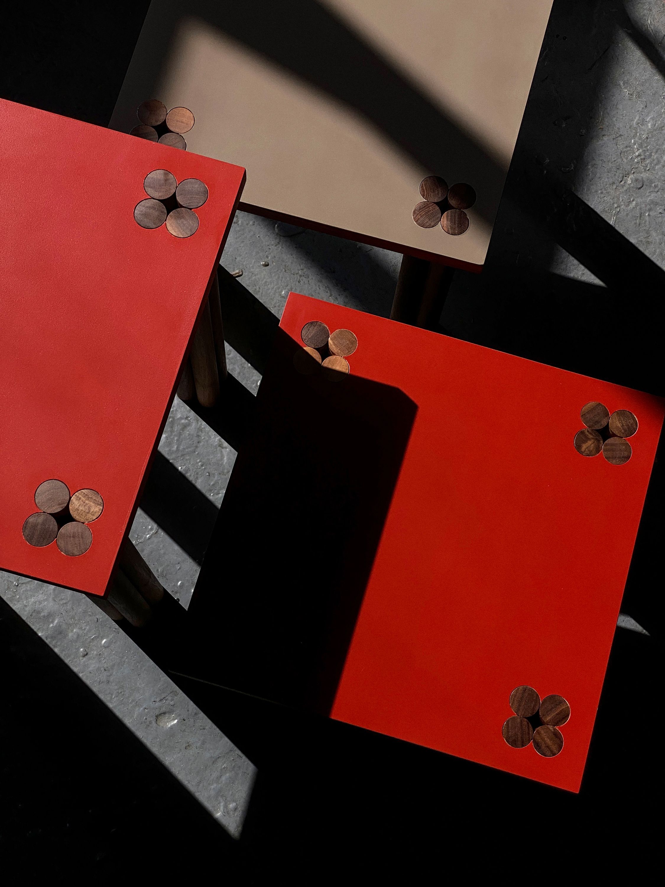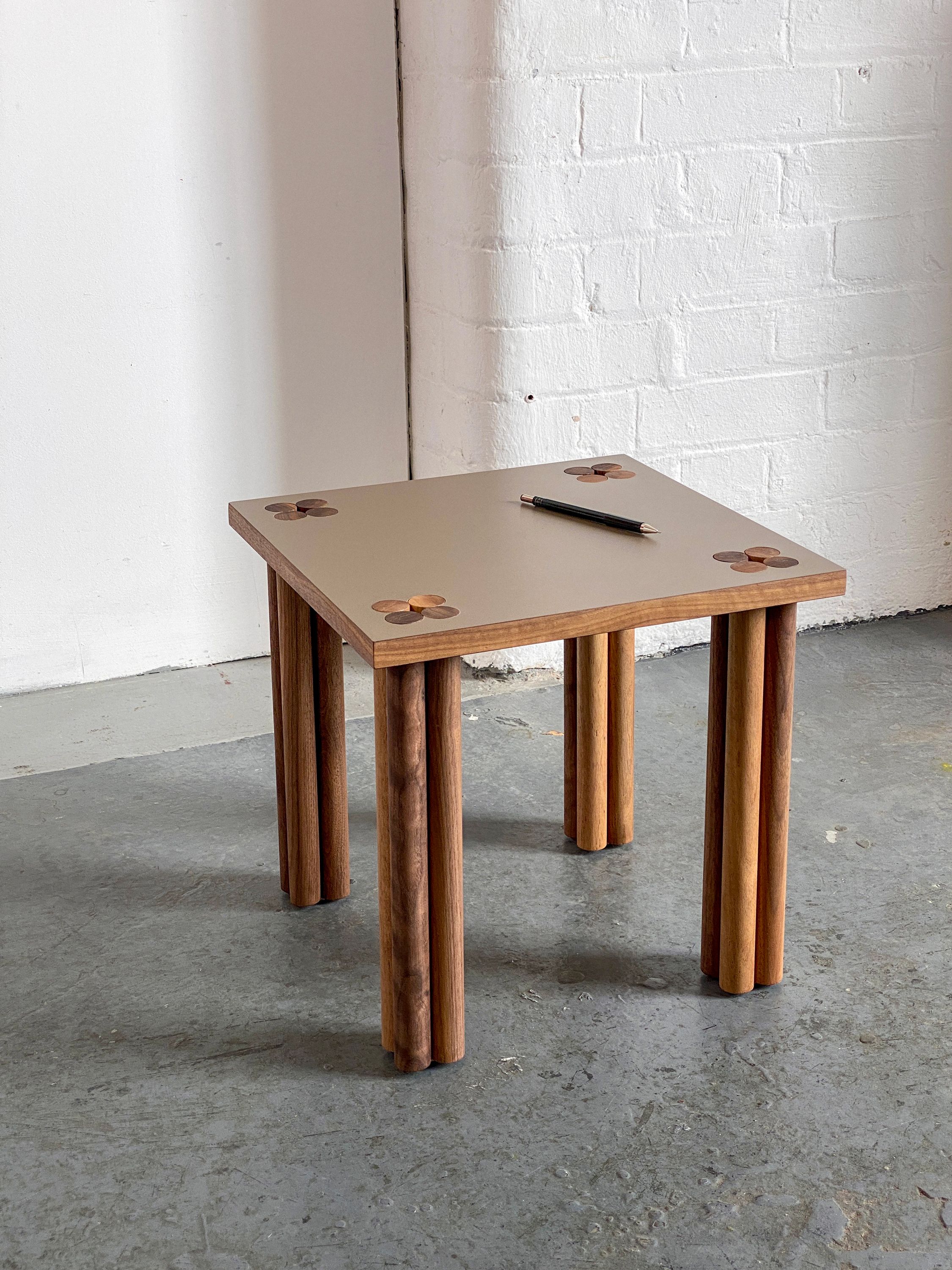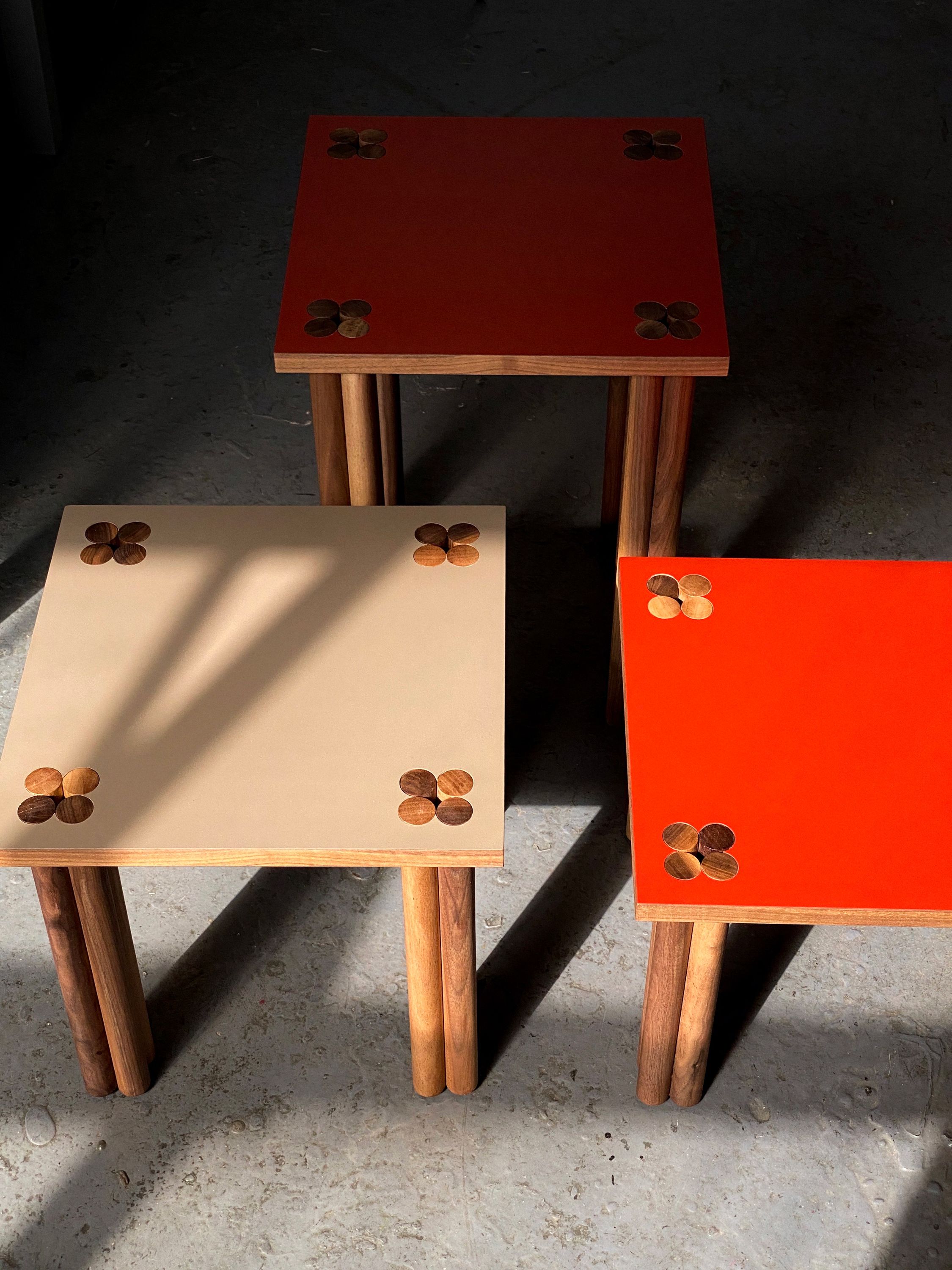 Hana is Japanese and means flower - it is a collection of side tables and a sideboard. The name stands for the pattern created by the four wooden dowels piercing through the surface and simple Japanese carpentry as a point of inspiration. The project was created during lockdown when friends and family members asked me to design and produce furniture for their homes and was first realised in oiled oak with denim blue Formica and oiled walnut with a sunflower yellow laminate.