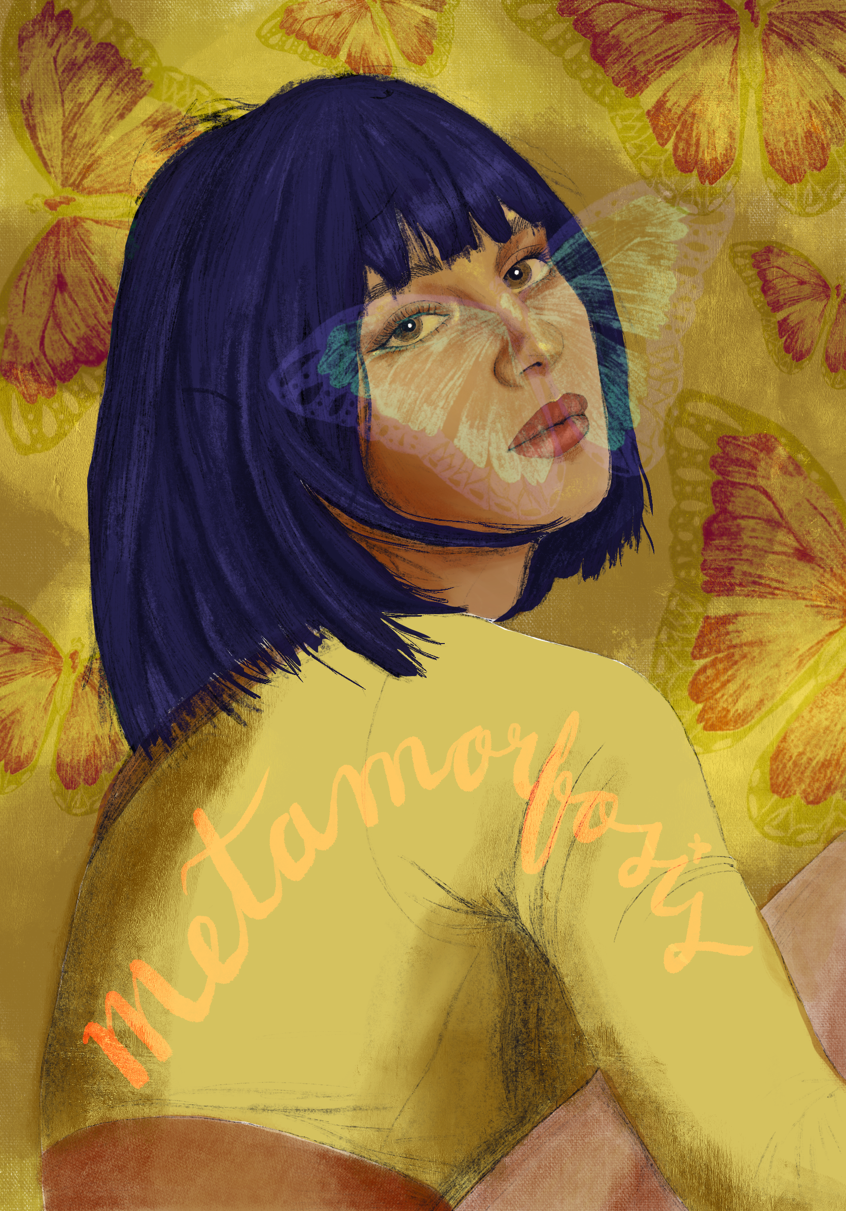Para este proyecto decidí crear un retrato con algunos elementos que le dieran potencia como la paleta de colores y el fondo con mariposas, me divertí mucho en el proceso y fue muy valioso para mí tomar este curso.