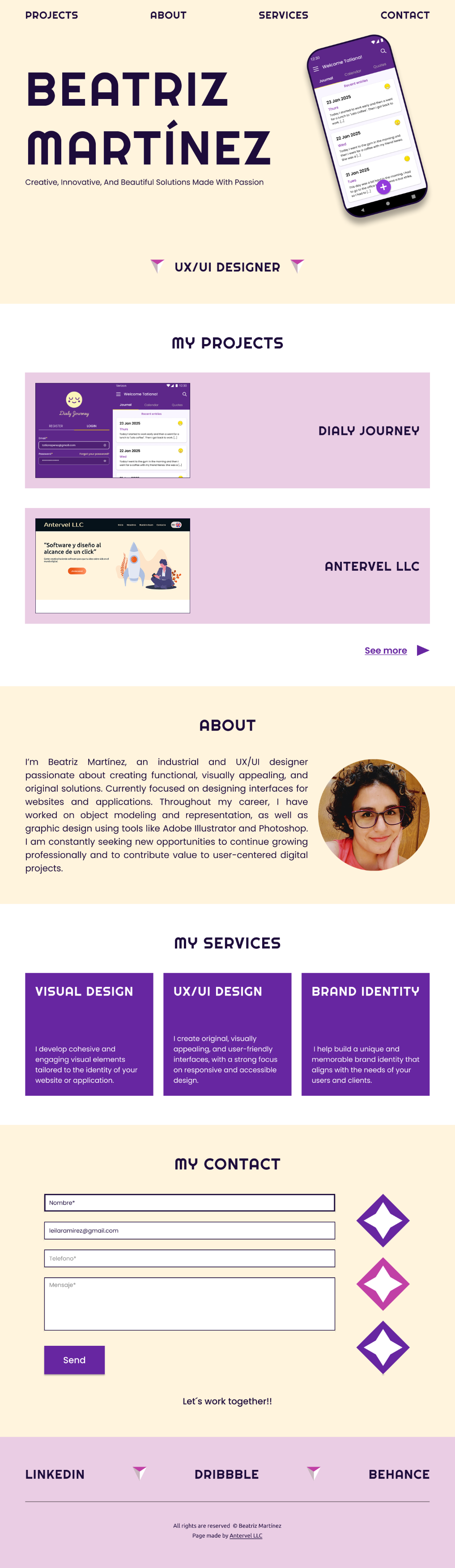 Finalmente decidí hacer una página de tonalidades púrpuras, amarillo-anaranjado y guinda. Elegí estos colores porque me parece que representaban muy bien la línea de tonos con las que había venido trabajando en mis proyectos. Además, si bien usé una letra Ubuntu para la mayor parte del texto, quise conservar la fuente ''Righteous'' para los títulos y subtítulos. Esto, para reflejar en parte mi inspiración de la Bauhaus.