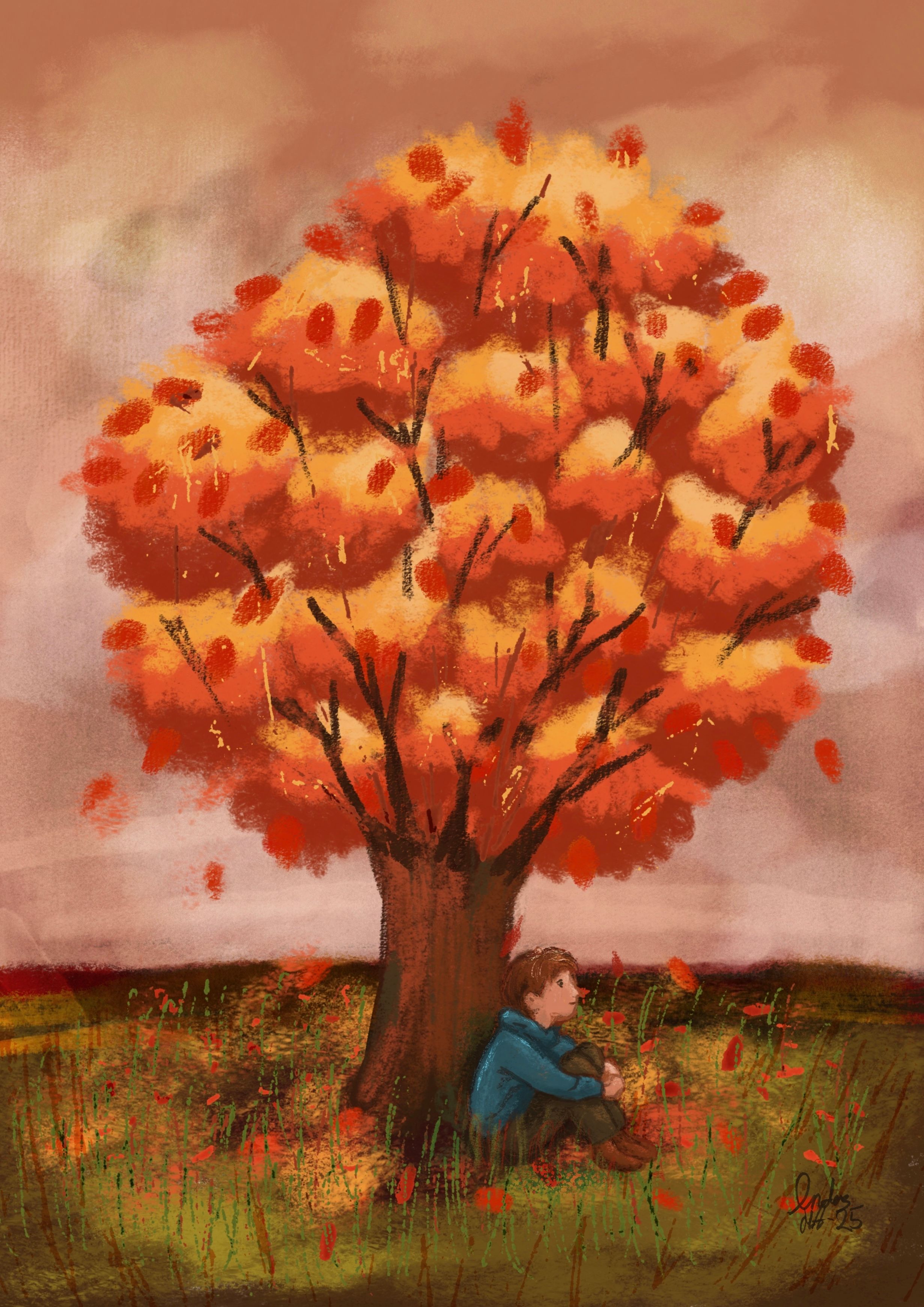 This piece began with a TikTok tutorial that inspired me to paint the tree. From there, I created the boy myself, using a few reference photos I found online. The background is entirely my own idea, drawn freely as I imagined the scene coming together.