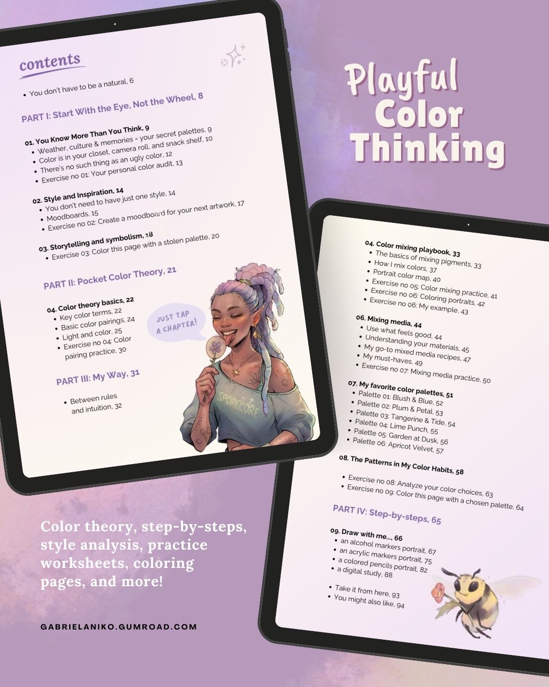 Inside, I share how I personally think about color — with clear explanations, visual examples, step-by-step breakdowns, and playful exercises to help you explore color in your own way.