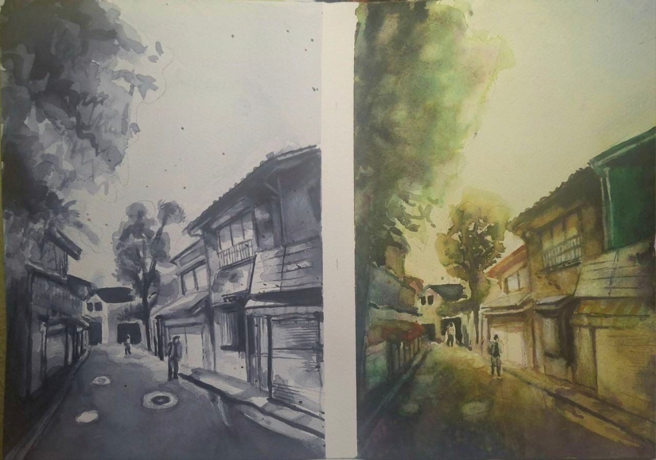 Esbozo blanco y negro, hecho con gris de payne, esbozo en color con la mezcla de 3 colores secundarios: naranja de cadmio, verde permanente y violeta de manganeso