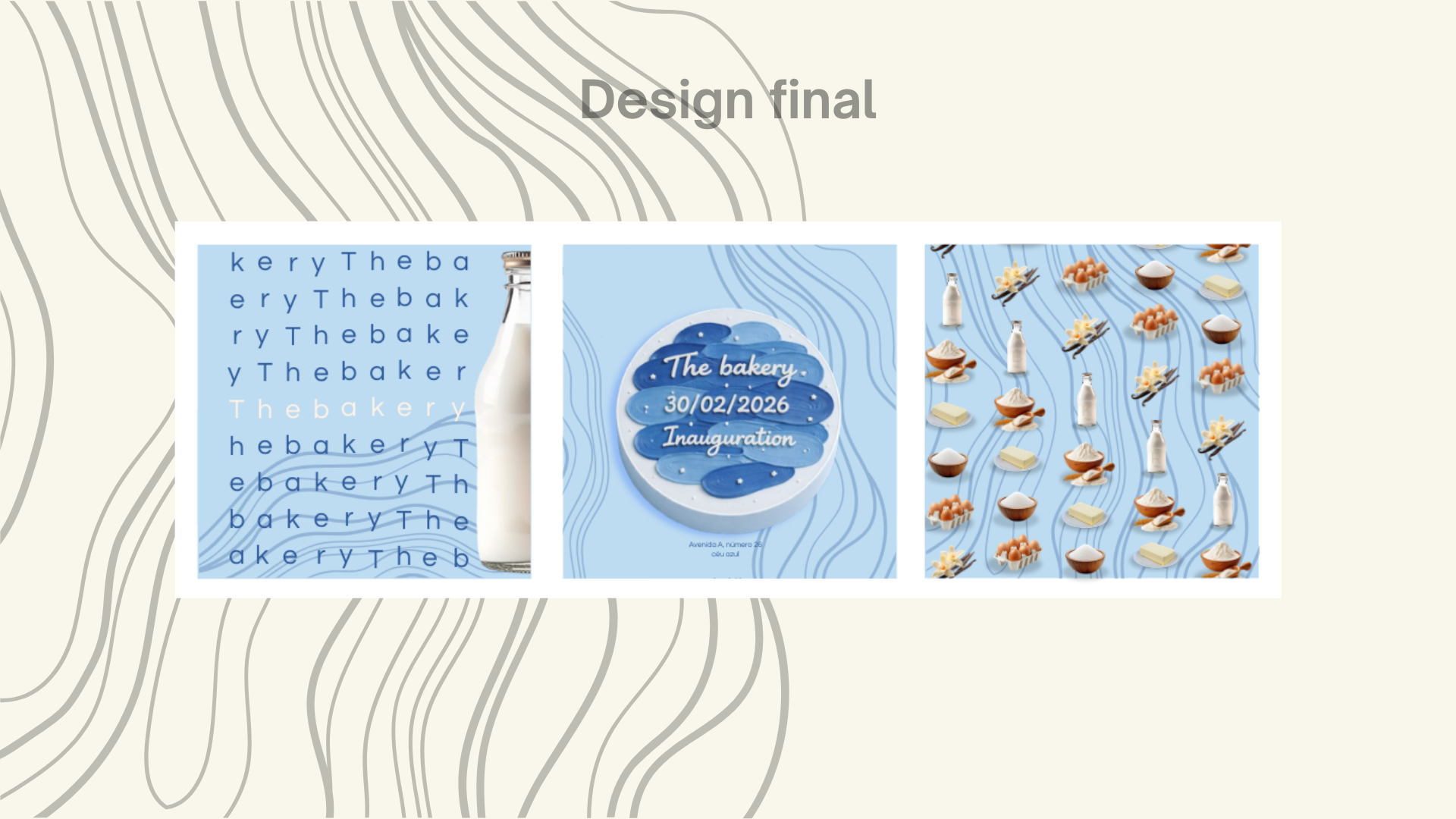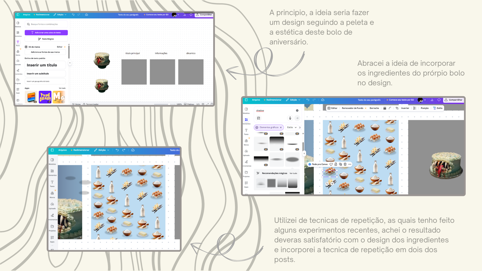 A ideia original do trabalho surge a partir do conceito de uma padaria ficticia focada na criação e produção de bolos, utilizando como elemento gráfico, seus ingredientes.