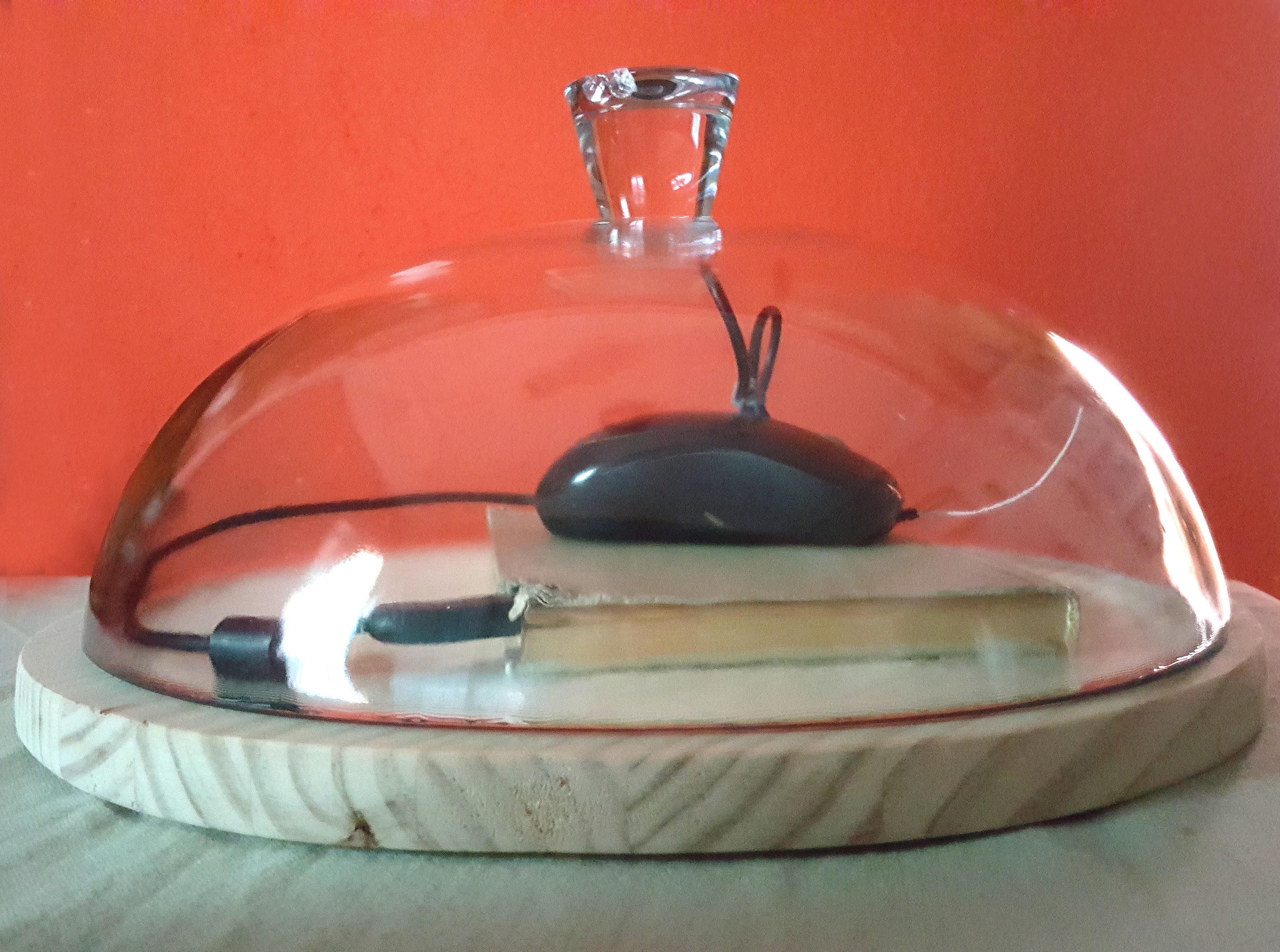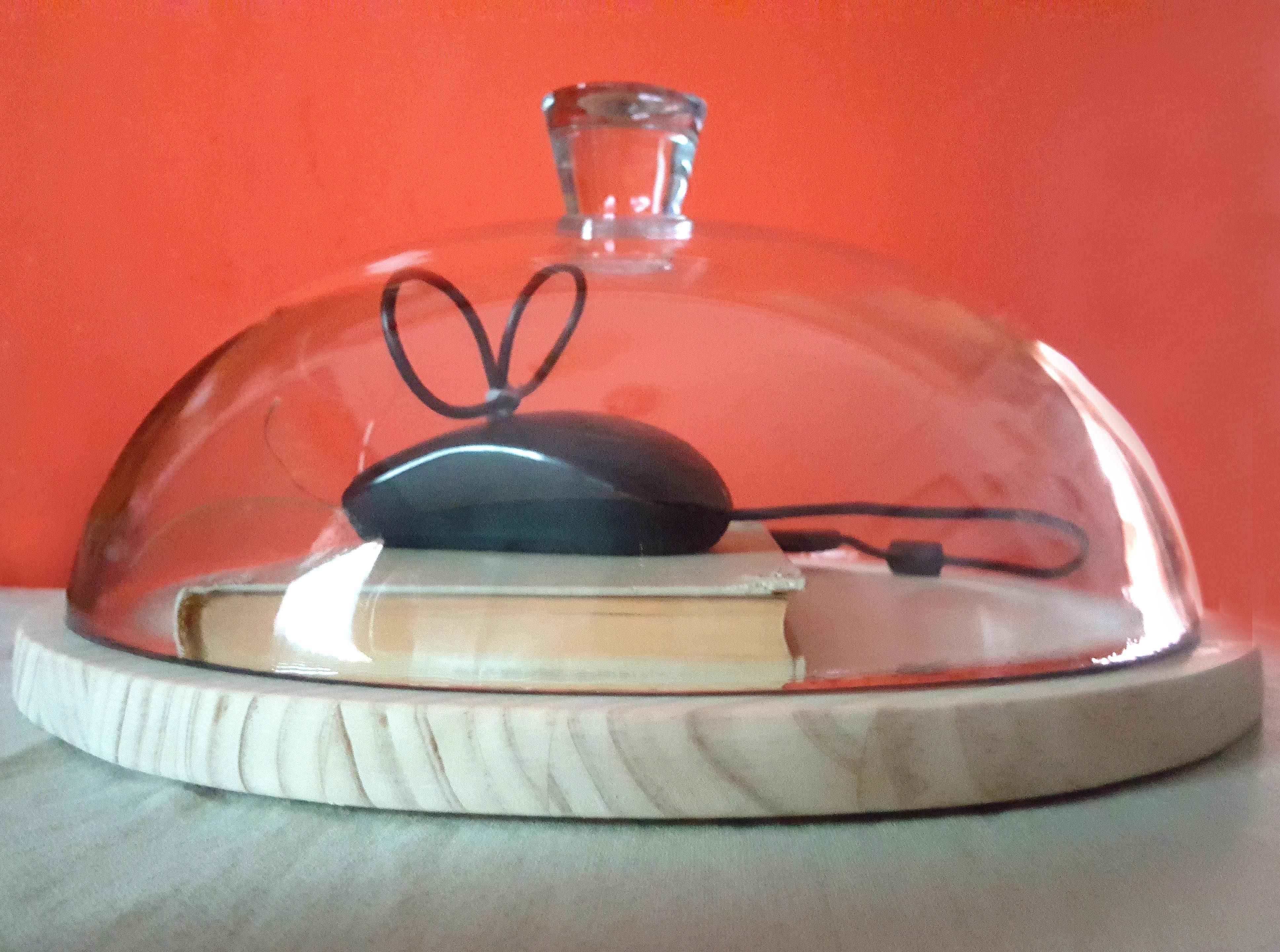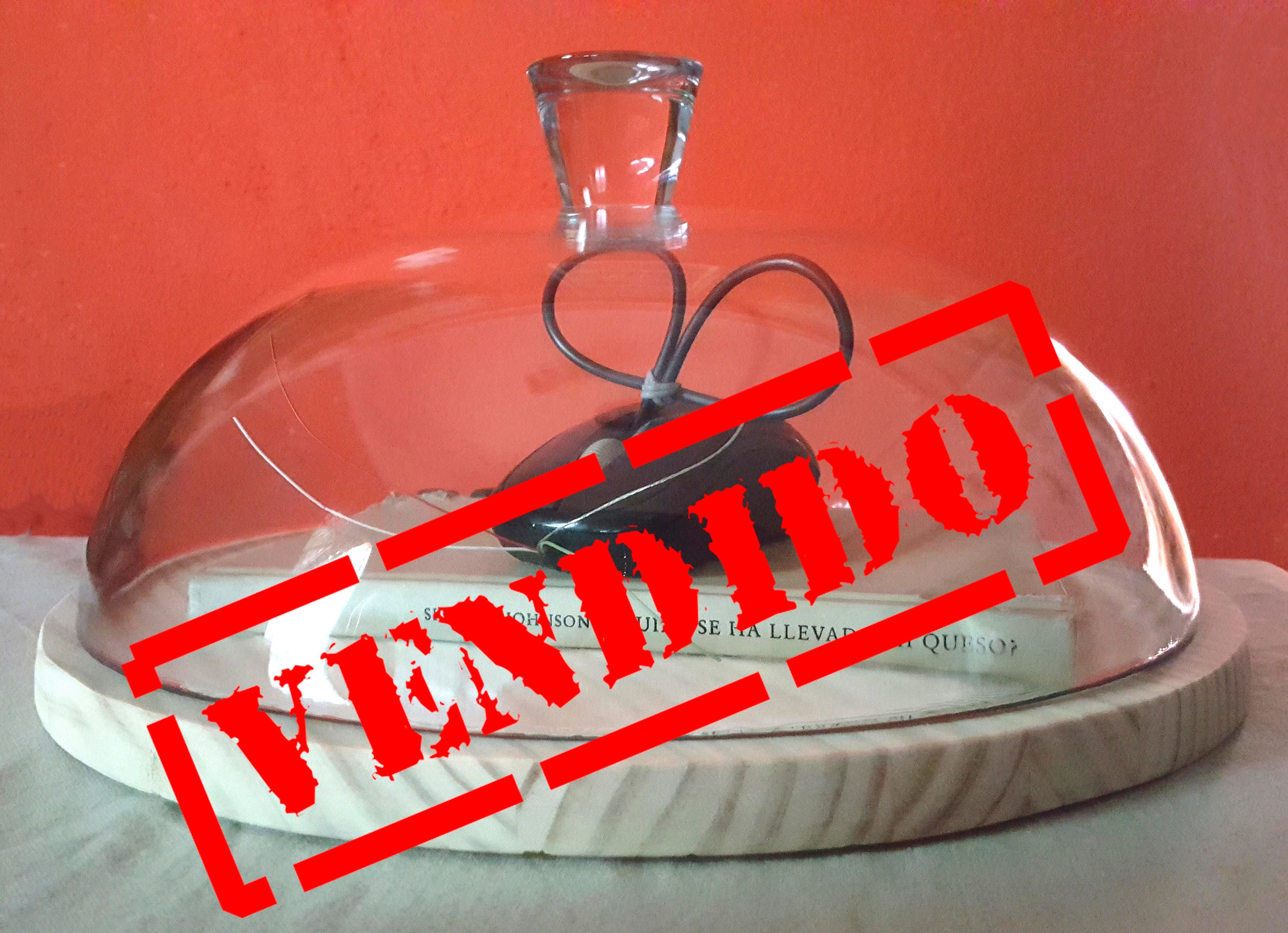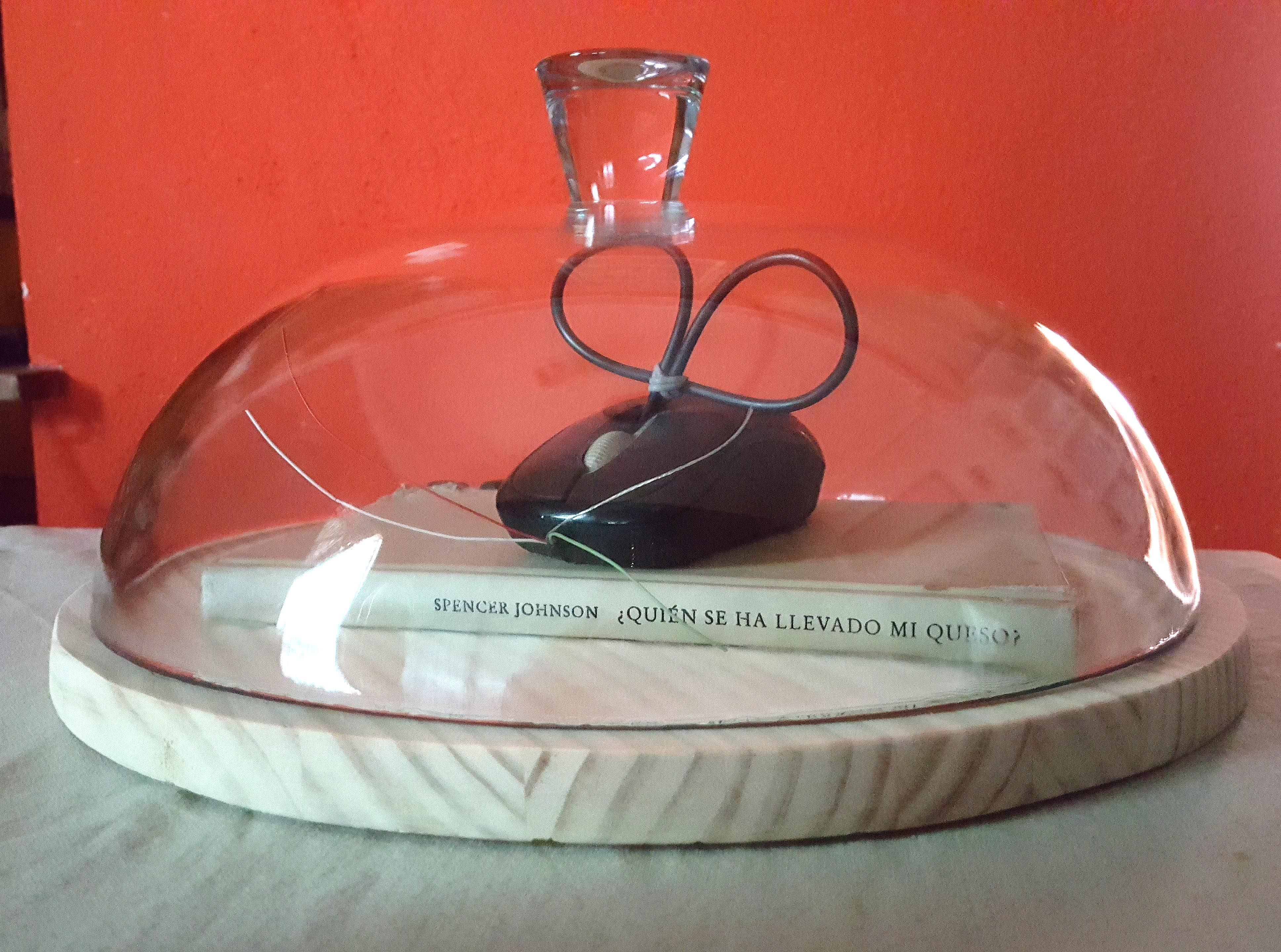 Materiales: Libro encontrado "¿Quién se ha llevado mi queso?" + ratón de ordenador intervenido + madera + campana de cristal.