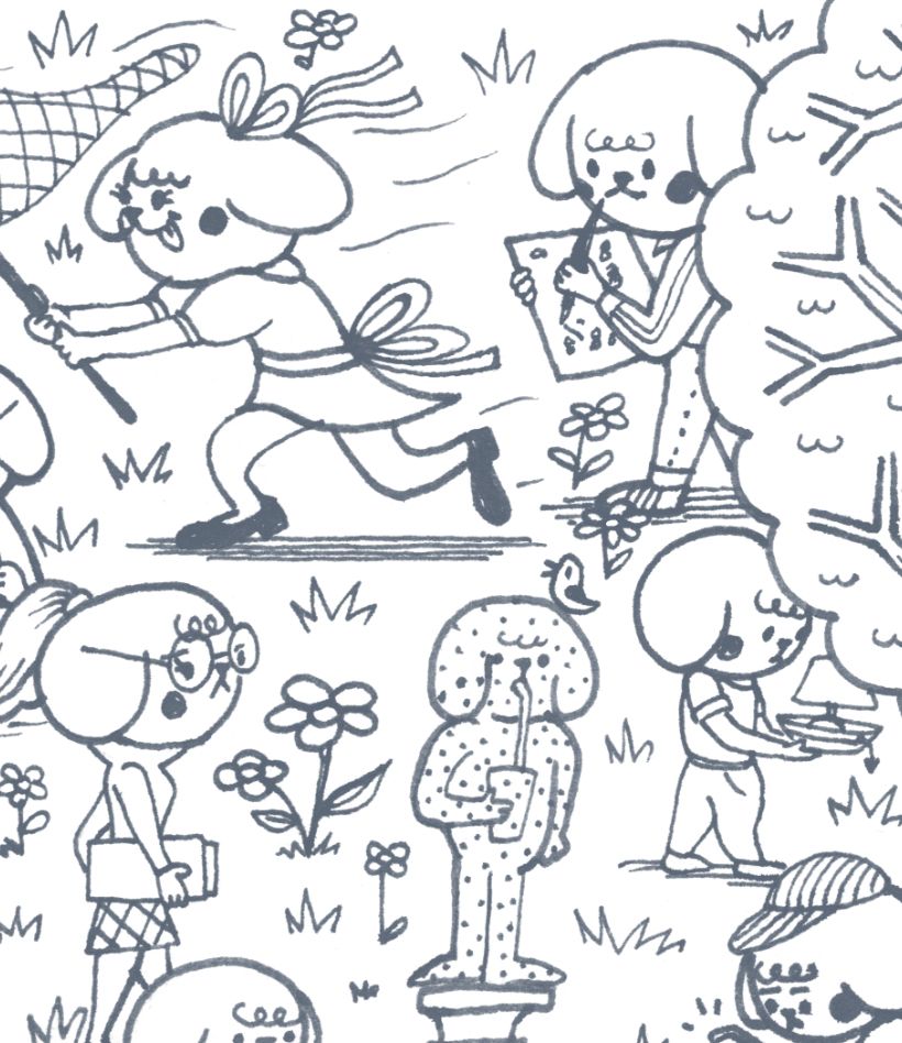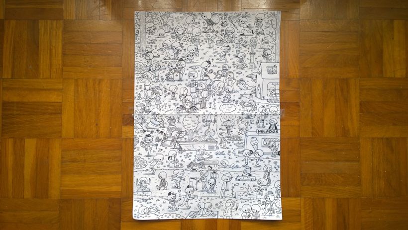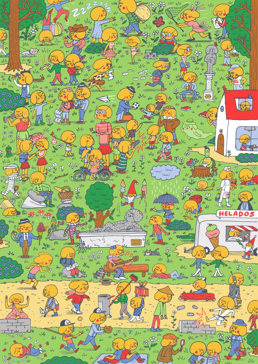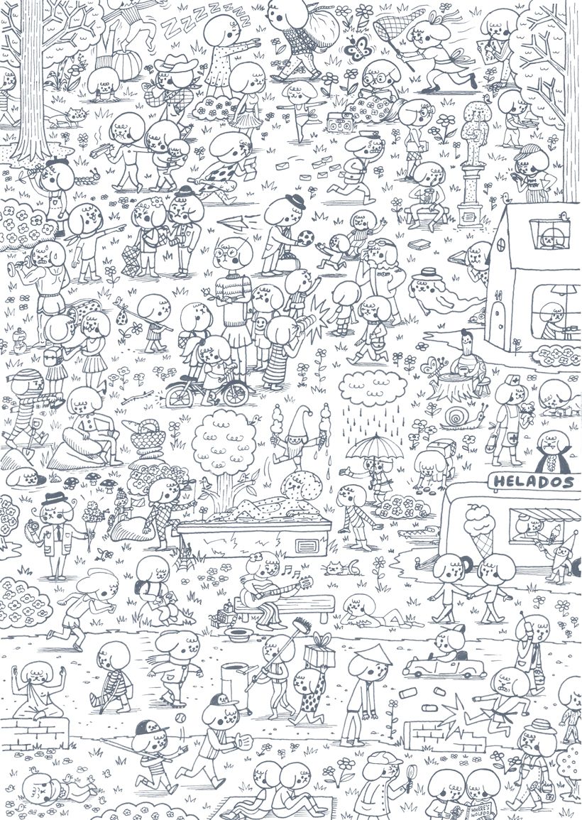 Después de entregar mi segundo libro de Churro, el conejo terminado a la editorial empiezo ya a planear otro libro más, en este caso un libro de buscar y encontrar. Este es un primer adelanto del trabajo que estoy realizando con estos perritos llamados Gococos. Aparecen casi 100 Gococos por página, el objetivo es llegar a tener 1000 Gococos en el libro.