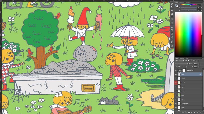 Trabajé con pocos colores pintando toda la información de cada color en capas separadas.