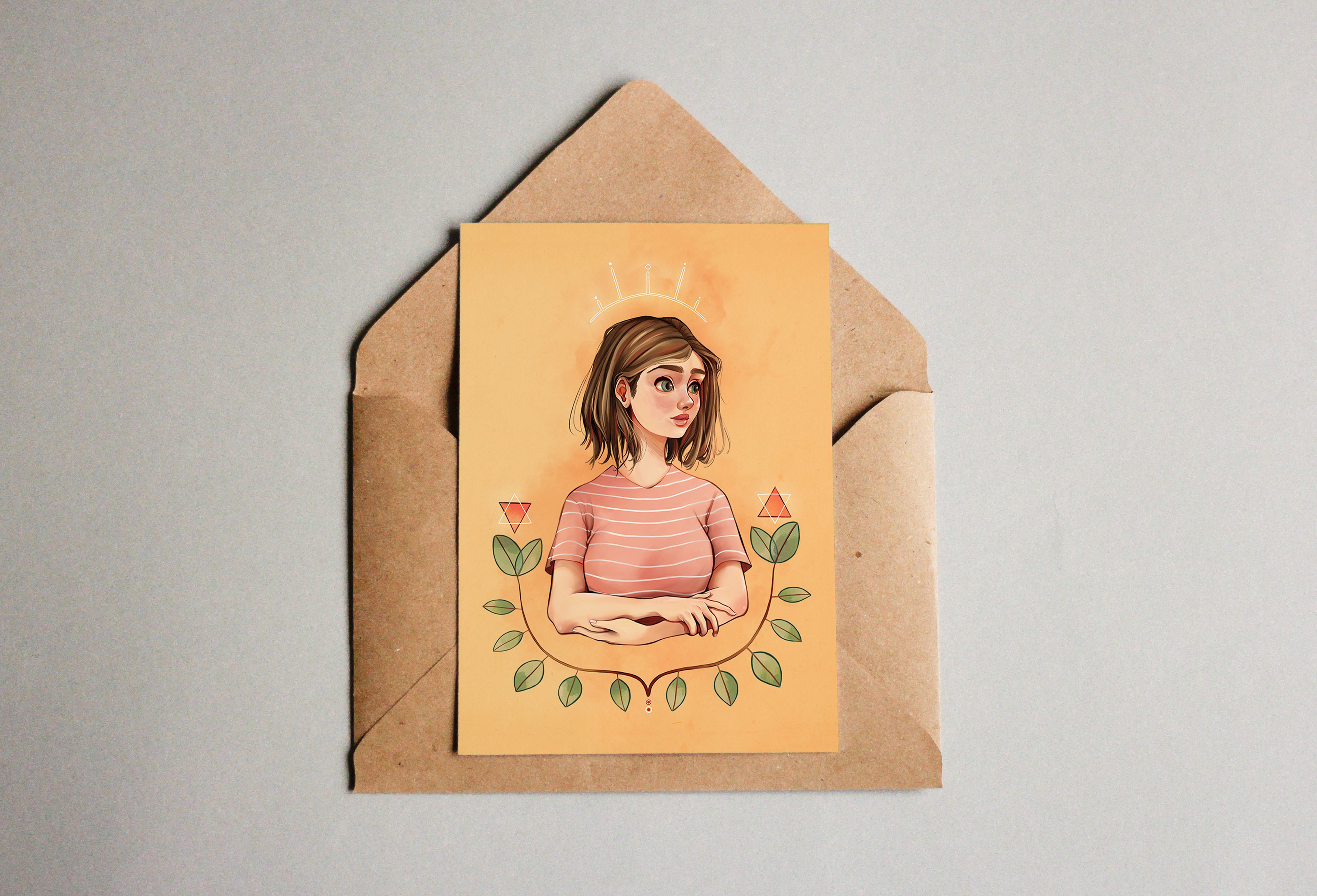La idea del proyecto era realizar una ilustración en la que el personaje fuese lo principal, así que me inspiré en las estampitas religiosas antiguas.