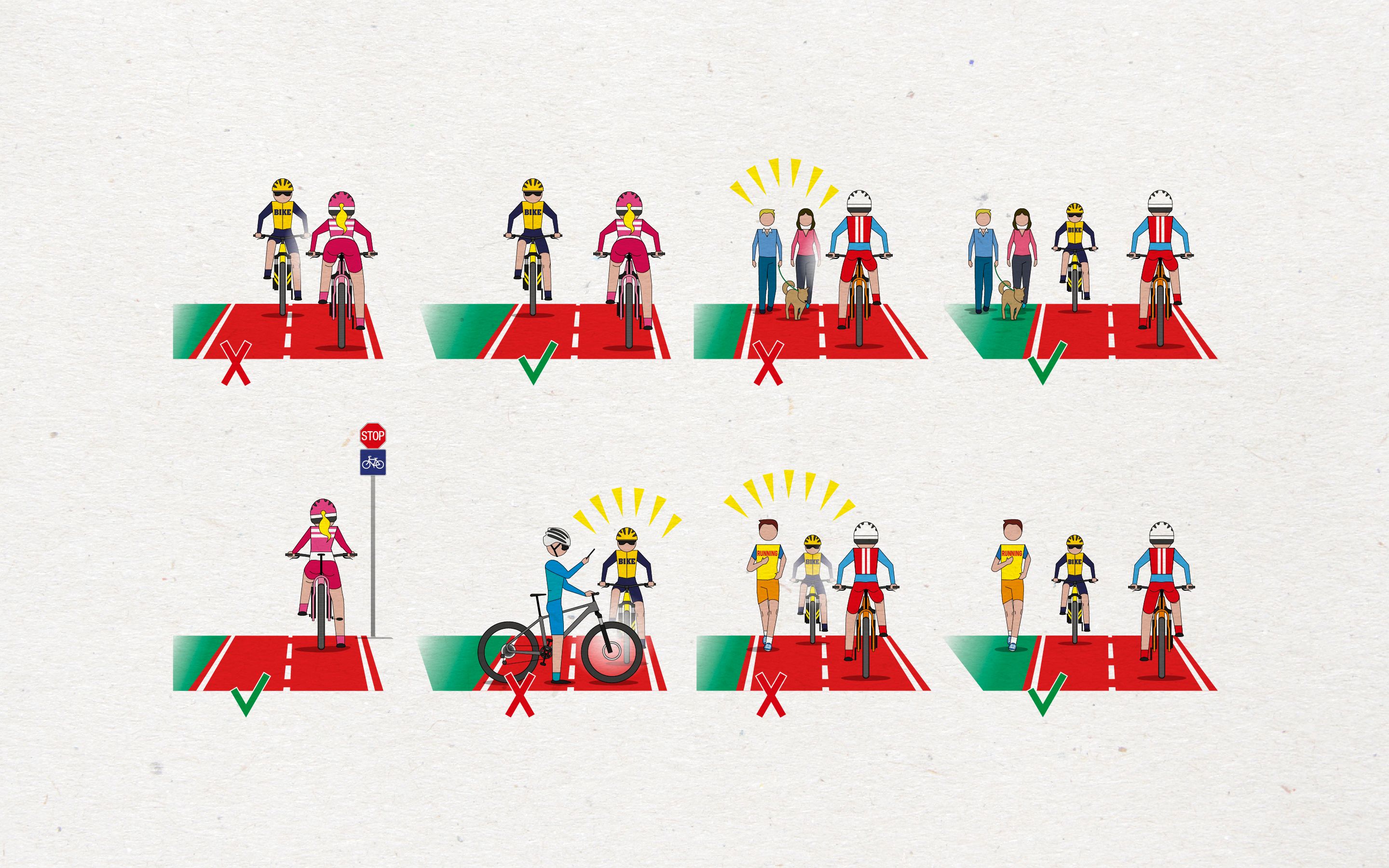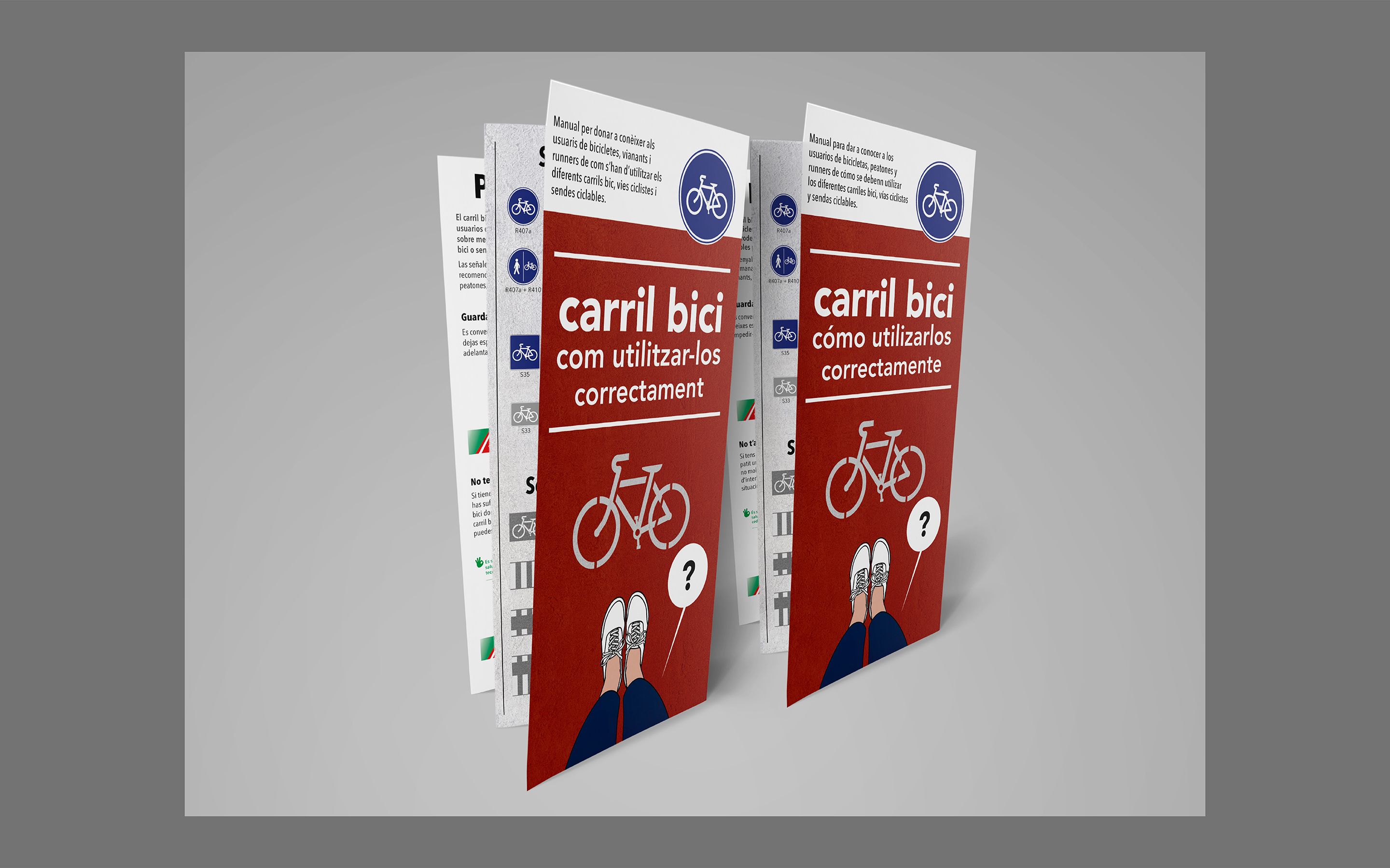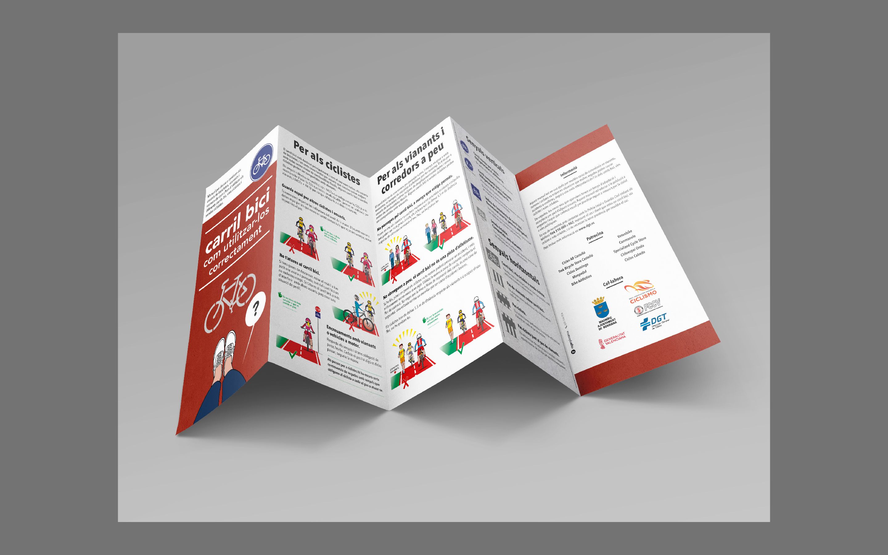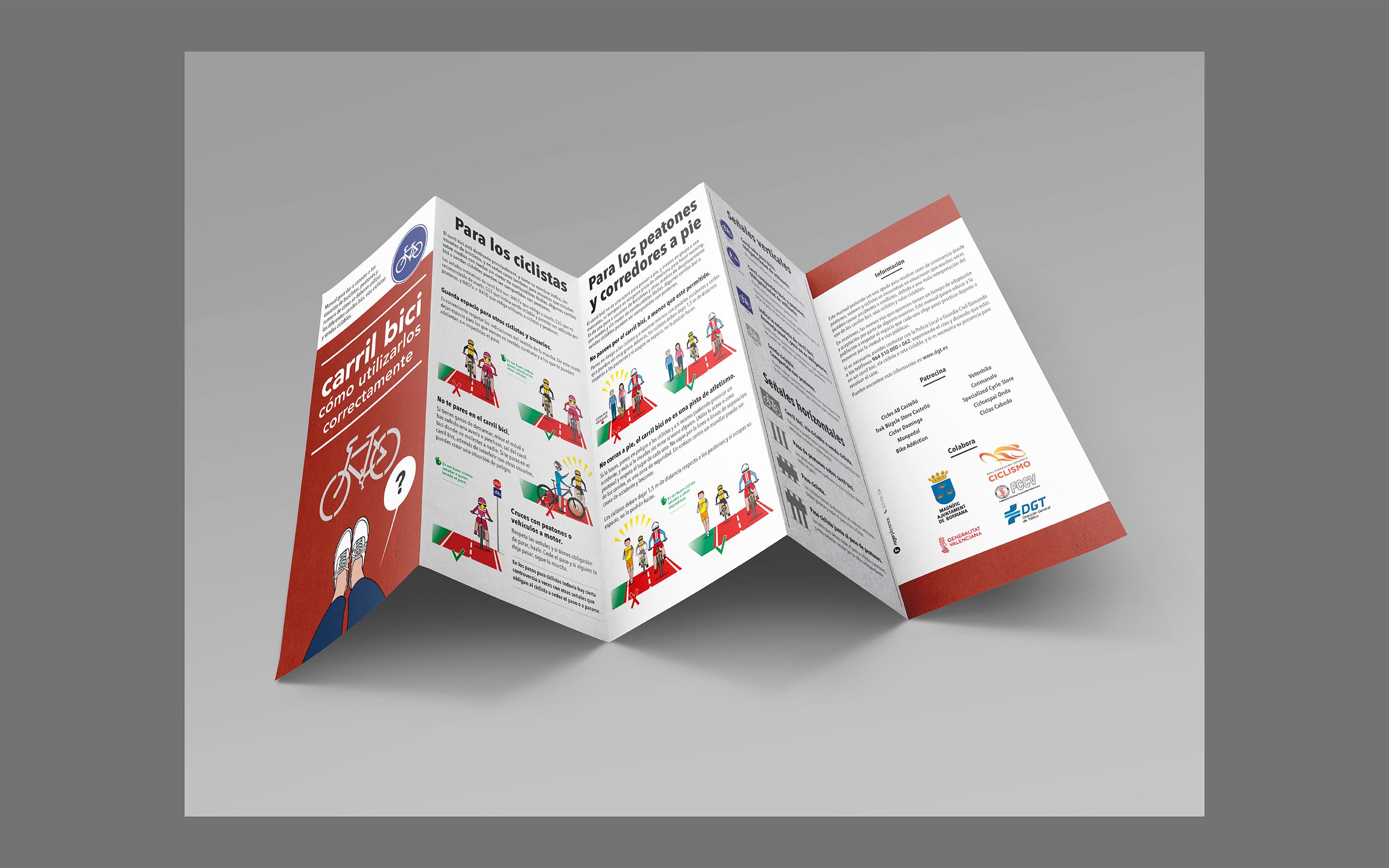 Diseño e ilustración de pictogramas y folleto plegable quintríptico informativo para un correcto uso del carril bici. Todas las ilustraciones están realizadas con Adobe Illustrator.