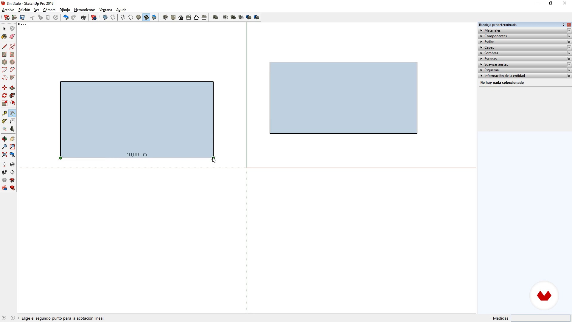 “SCHETS CURSUS 2 LES 2 Het gereedschap Rechthoek Hier zullen we het gereedschap Rechthoek zien, waarmee ik gezichten kan genereren zonder ze lijn voor lijn te hoeven tekenen. Laten we eens kijken. Om het te gebruiken kan ik op het gereedschapspictogram klikken? of druk op de R-toets op het toetsenbord. Op de een of andere manier wordt deze tool dan geactiveerd. Net als het gereedschap Lijn, dat we in eerdere lessen hebben gezien, We kunnen grafisch tekenen of door maten in te voeren. Grafisch is het heel eenvoudig, we klikken gewoon overal, we bewegen de muis op het scherm en waar we deze re...”