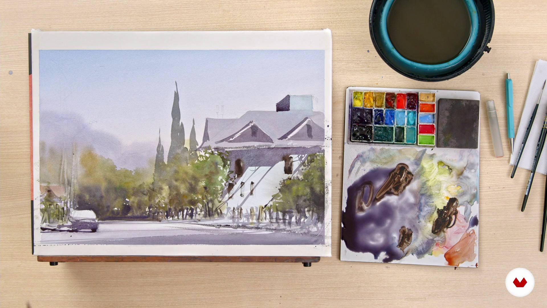 “In deze les zal ik de uiteindelijke aquarel schilderen met behulp van de schetsboekreferentie. ”