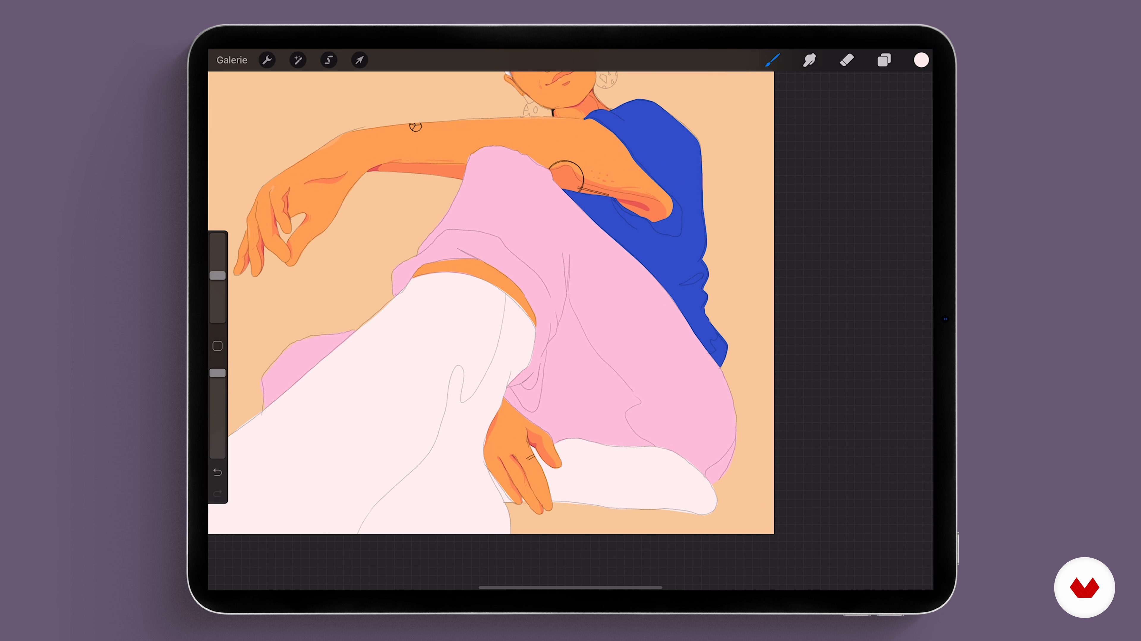 “Voor deze les blijven we in Procreate werken om kleur aan je schets toe te voegen. Laat me je uitleggen hoe je diepte en levendigheid aan een illustratie kunt geven door de juiste kleur te kiezen.”