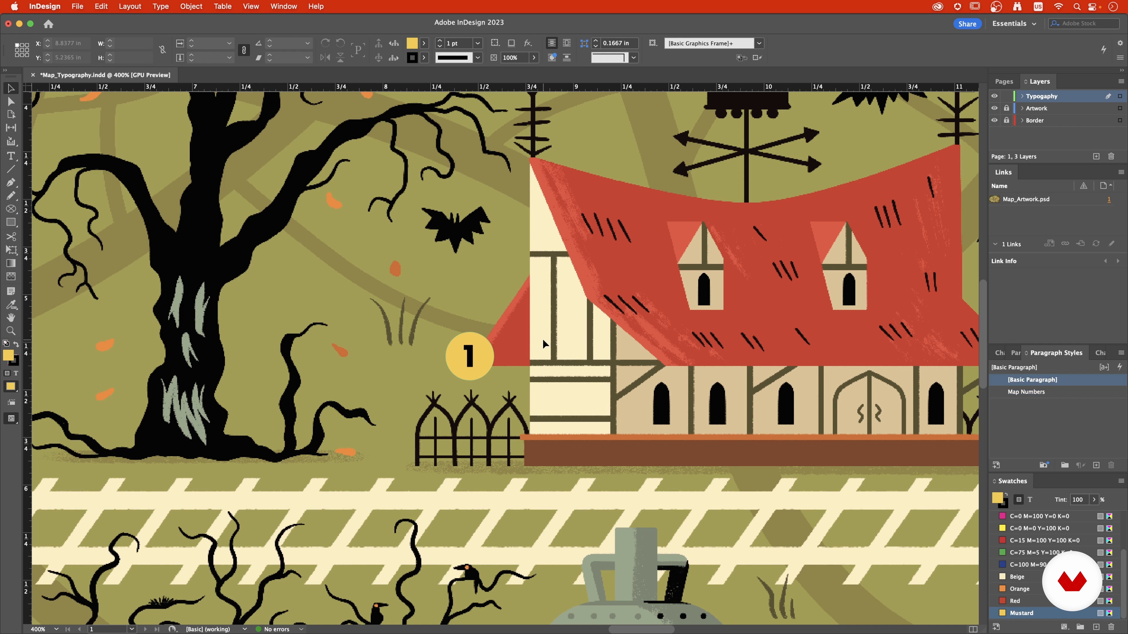 “Typografie In deze les concentreren we ons op typografie, zo brengen we het allemaal samen. Om deze kaart zo bruikbaar mogelijk te maken, wil ik hem een naam geven, dan zullen we ook enkele van de belangrijkste oriëntatiepunten identificeren zodat het een functionele, bruikbare kaart kan zijn. Terwijl ik InDesign zal gebruiken, je bent meer dan welkom om Photoshop of Illustrator te gebruiken, of als je het allemaal met de hand doet, plaats dan de typografie met de hand. Met ons laatste kunstwerk, Ik wil wat kleurstalen trekken en wat aantekeningen maken. Op die manier als ik in InDesign sta...”