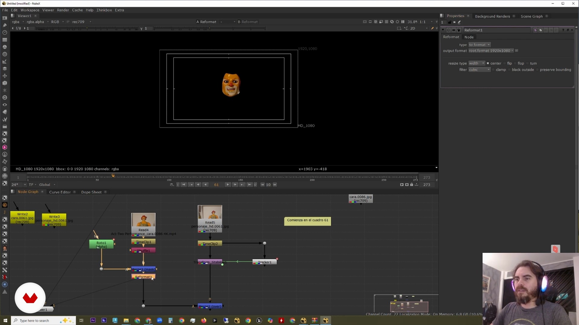 “Dus hier zijn we nu. Onze clip en we hebben ons gezicht. En daar zijn we. Wat gaan we doen? Wat we hebben besproken. Eerst stabiliseren we dit. net als bij After. Laten we naar onze afbeelding 61 gaan. En hier. hoe stabiliseren we in Nuke? Met de Tracker-tool. Oké? We tracken. We verbinden het. Hoe het? Met deze knop hier maken we onze tracker. We plaatsen hier een tracker. Dit is net als alle trackingprogramma's. Het midden is jouw midden. dit is het beeld dat je trackt en dit is het zoekgebied waar hij het zoekt. We vergroten het een beetje omdat het later beweegt. ja. dat is zeker zo... ...”