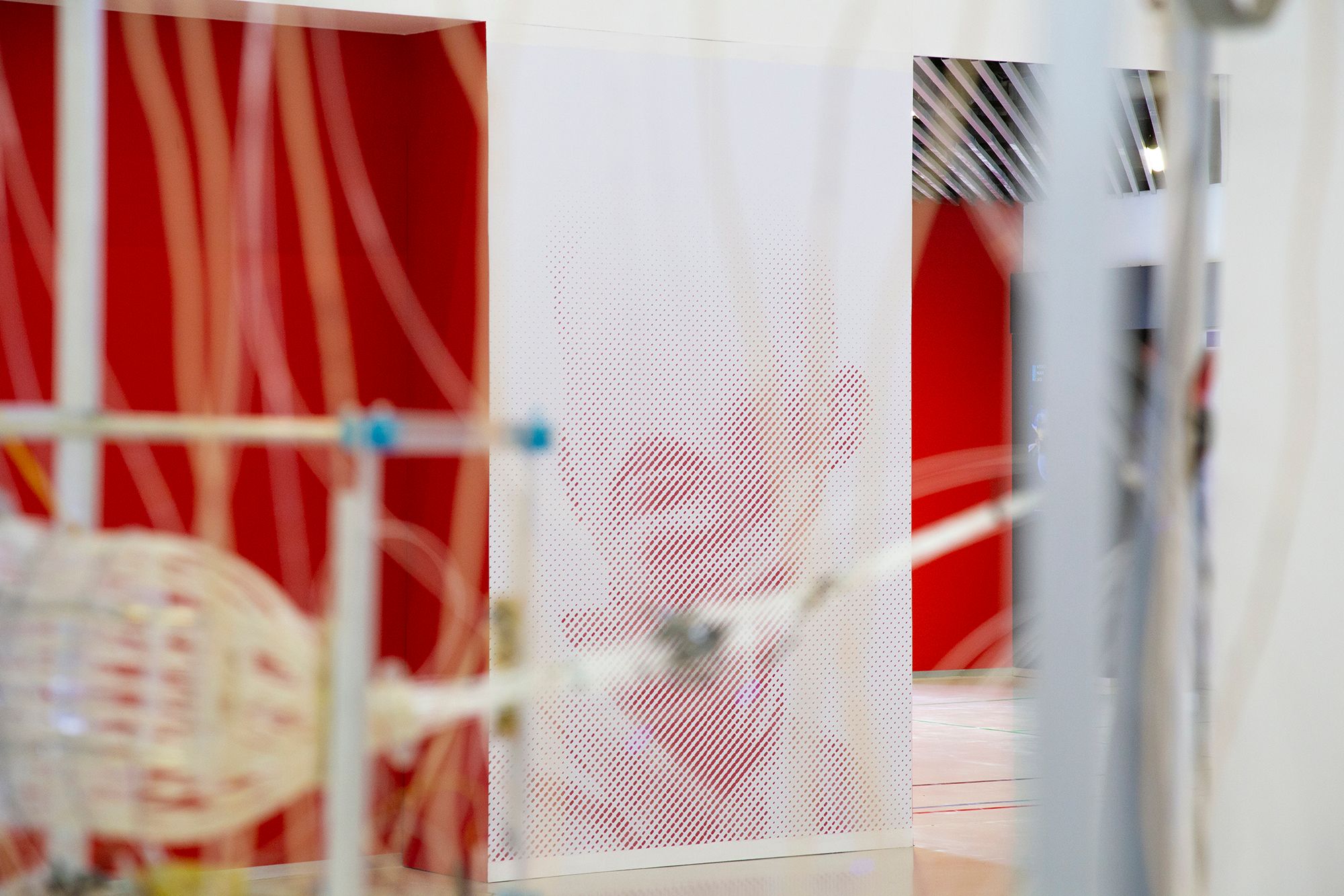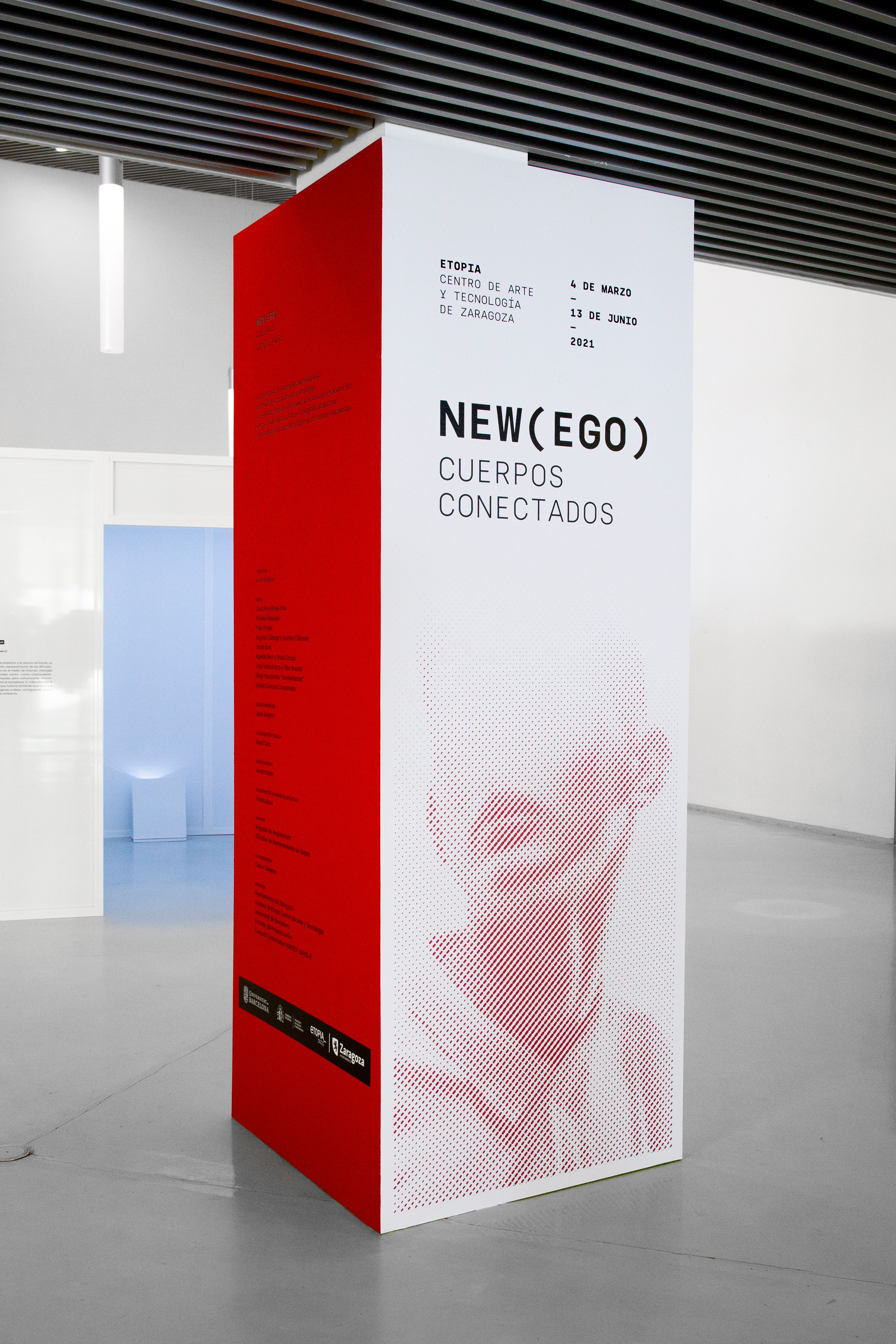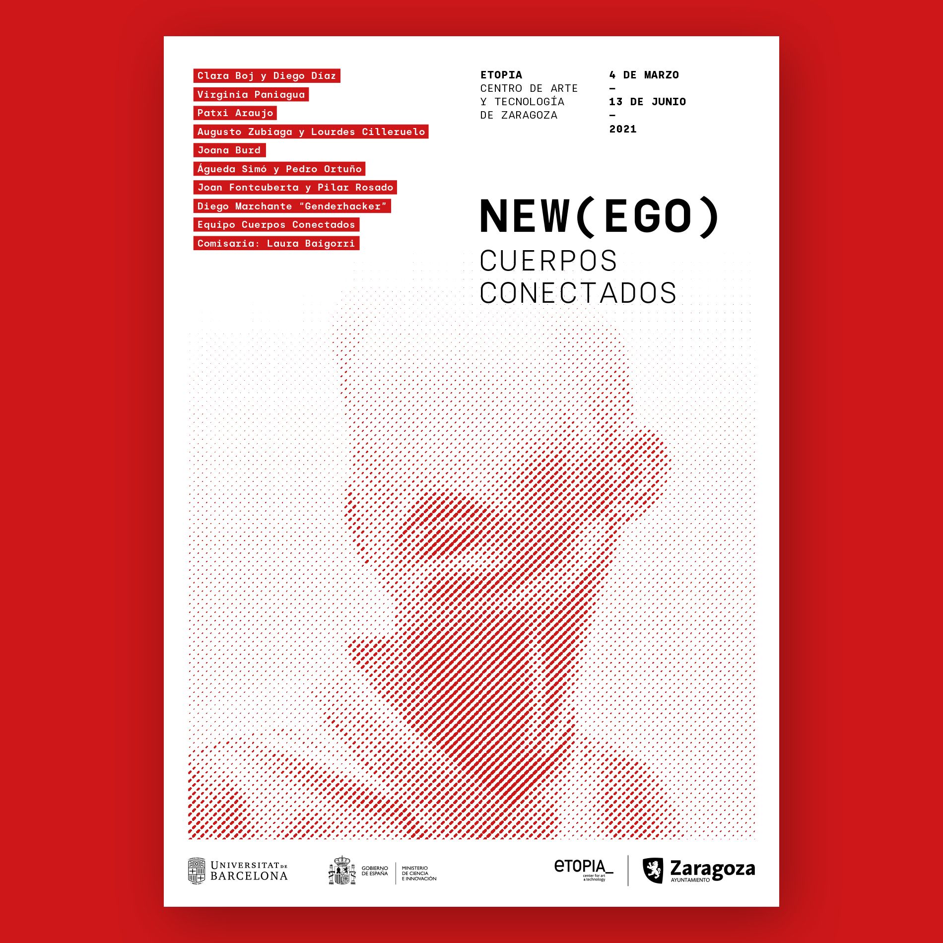 Gráfica expositiva para New (Ego) Cuerpo conectados. Esta exposición es el resultado de un proceso de investigación artística sobre el cuerpo y la construcción identitaria mediados por la tecnología. La imagen del cartel es un ser andrógino sin rostro creado a través de una trama en degradado.