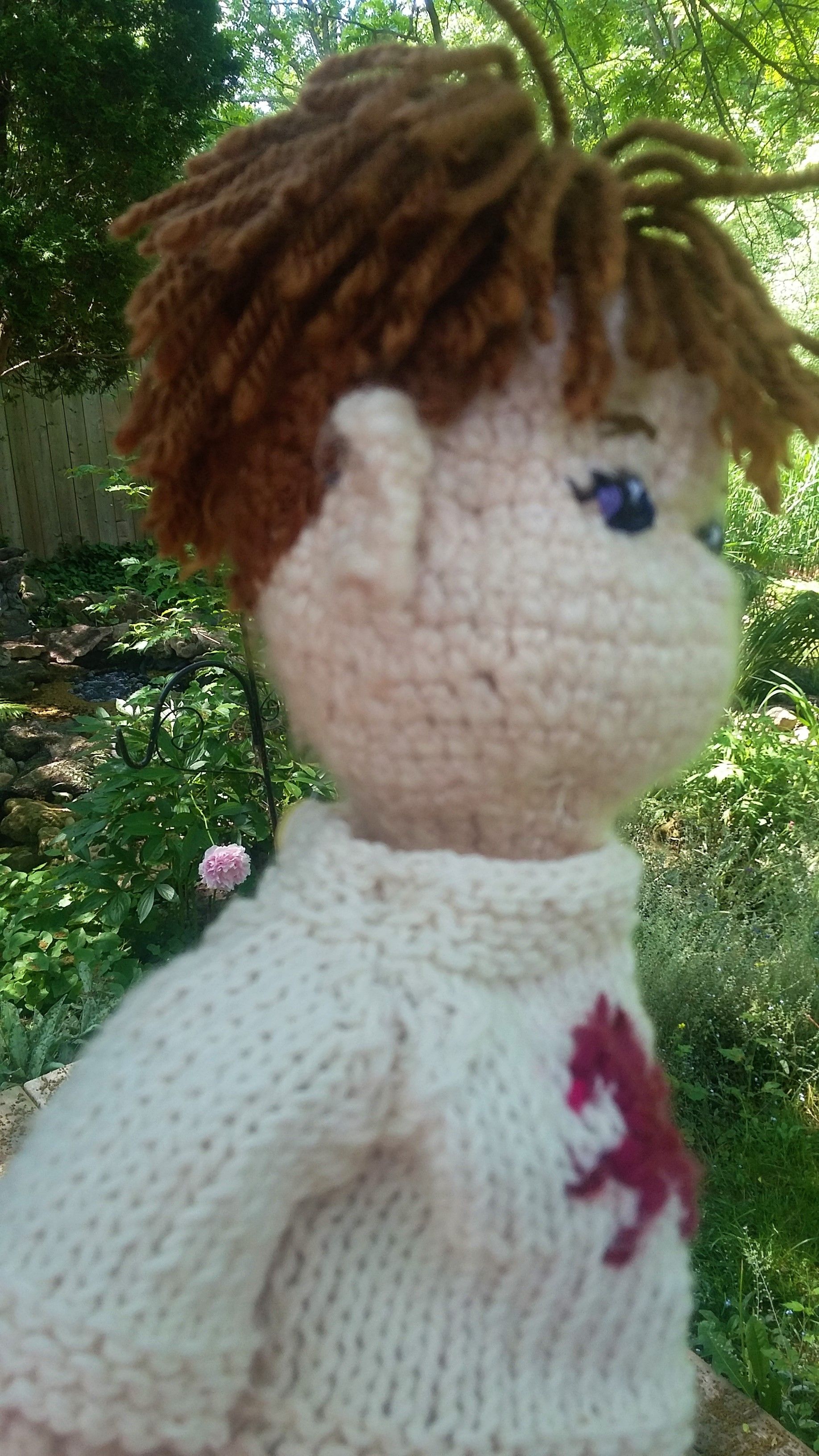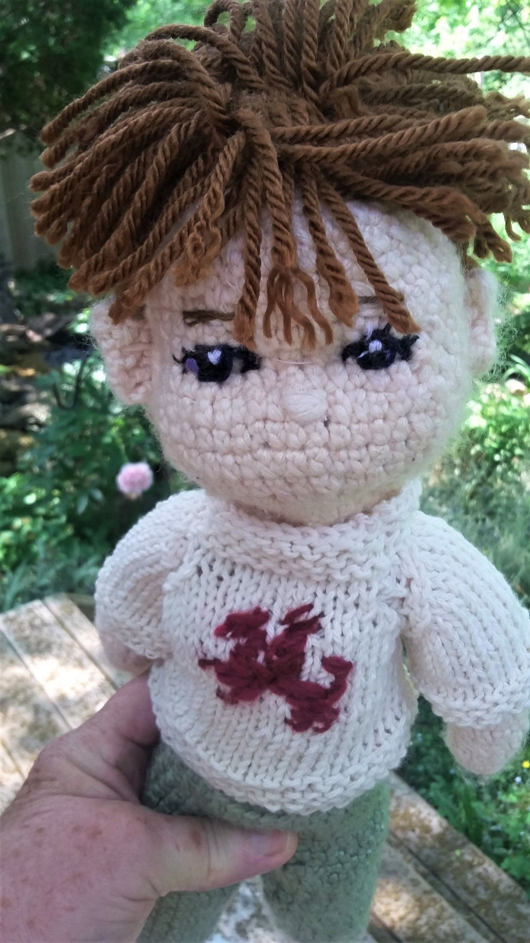 Ik heb de trui gebreid omdat ik tijdelijk mijn haaknaald kwijt was (onder de rugleuning van mijn stoel !) maar ben van plan om de jongen een rode gehaakte trui en wat laarzen te maken. Deze cursus is een geweldige starter in de wereld van gehaakte poppen, bedankt.
