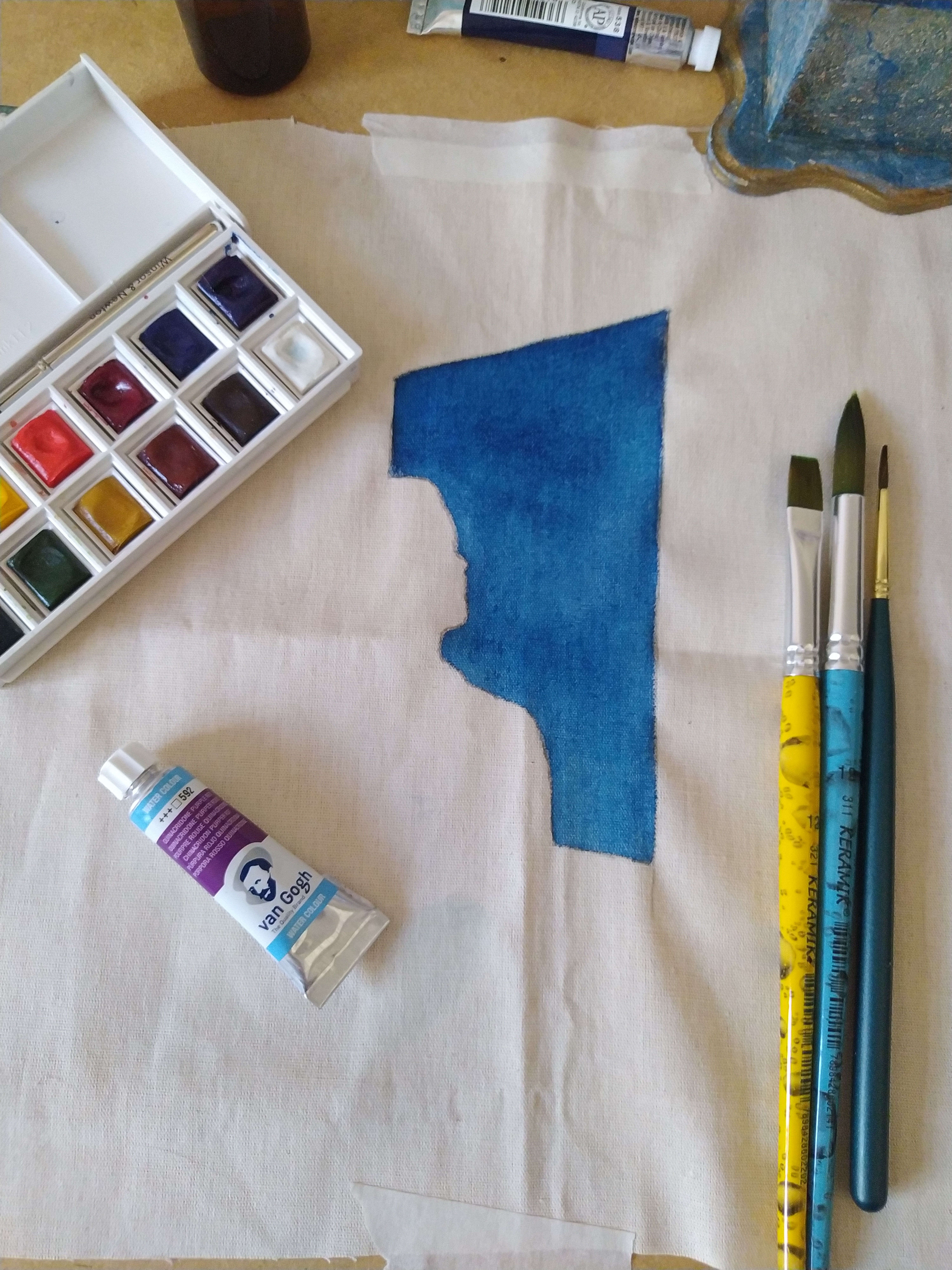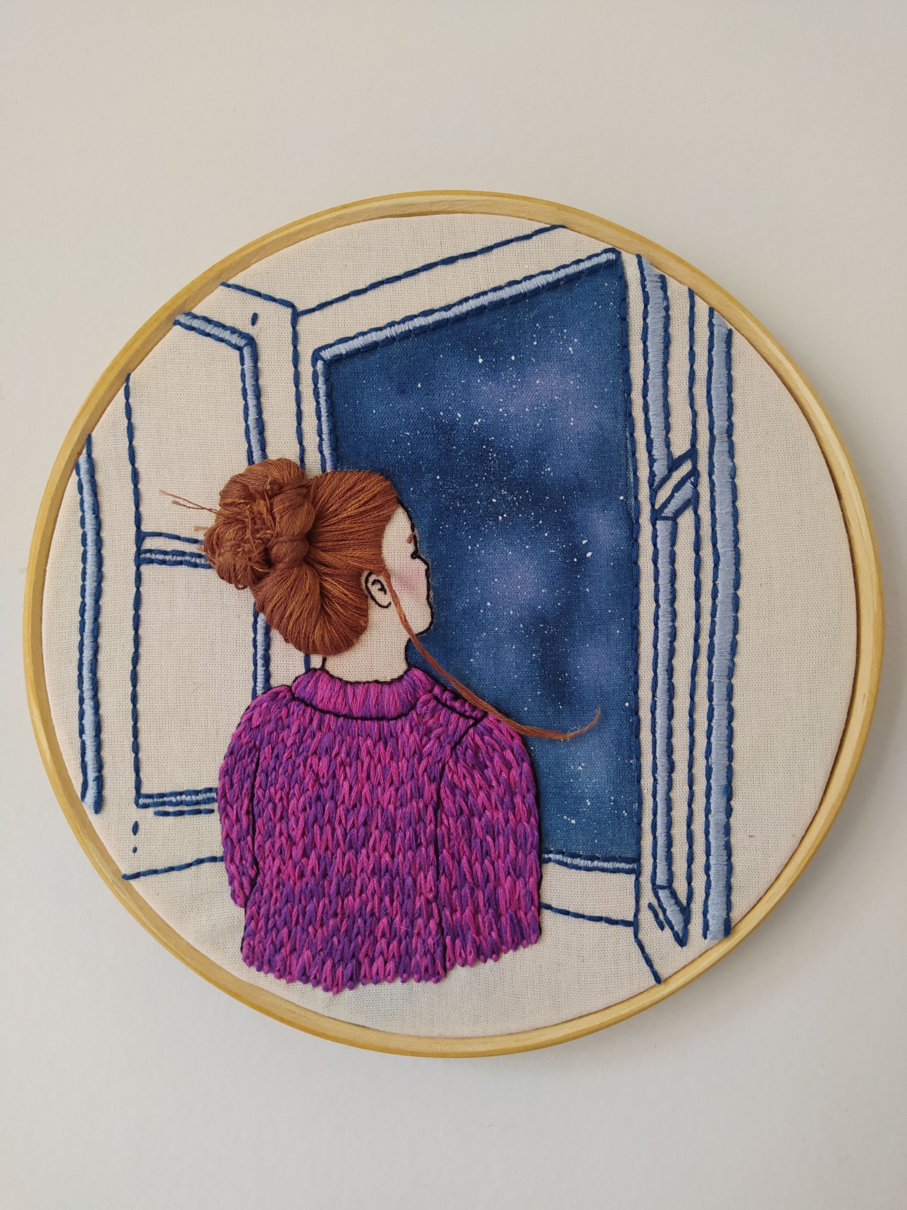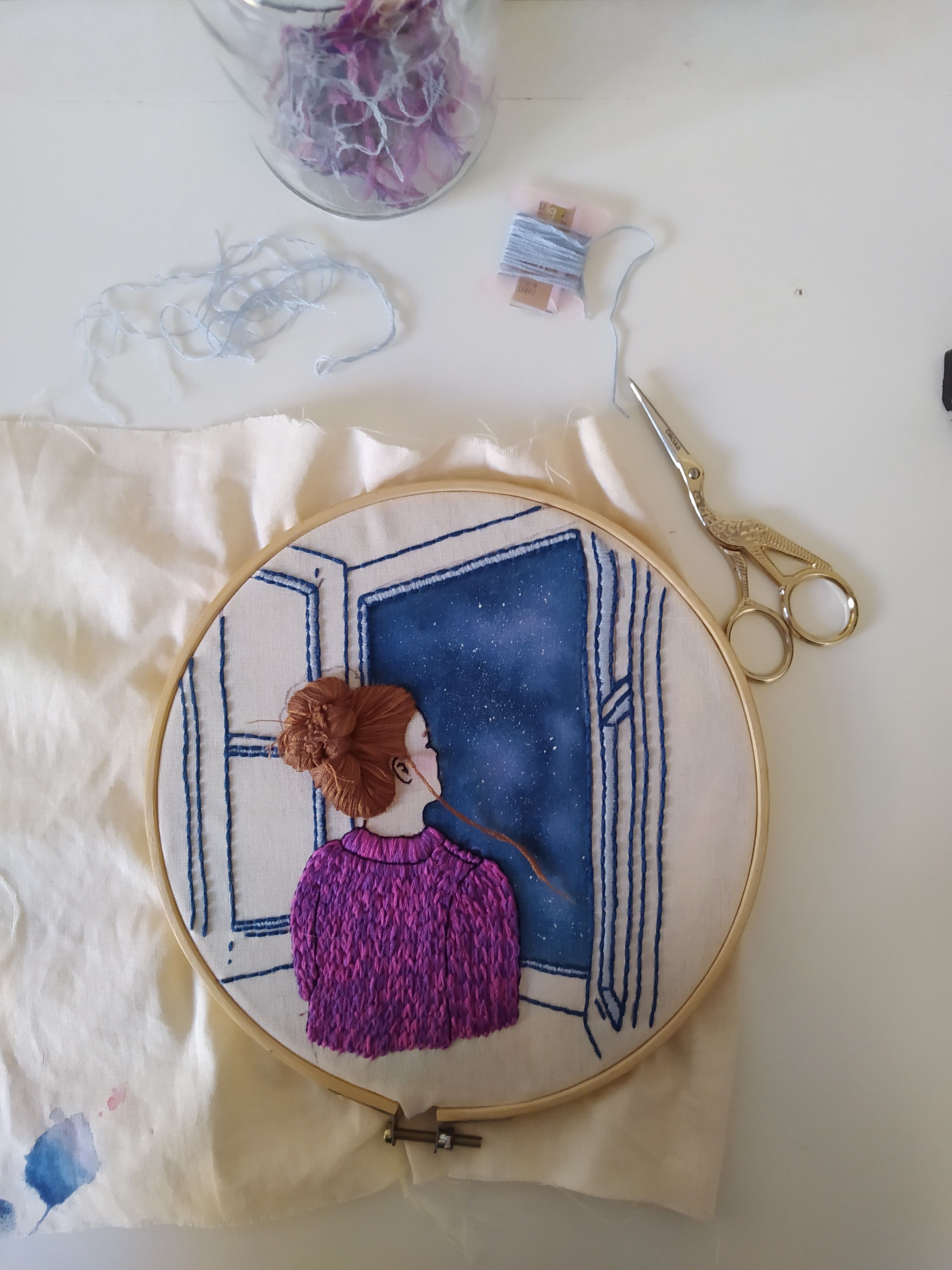 Projeto Final: Ângela na JanelaPrimeira Etapa: Pintura em AquarelaSegunda Etapa: Passar o desenho para o tecido após a pintura em aquarelaProjeto quase finalizado.
