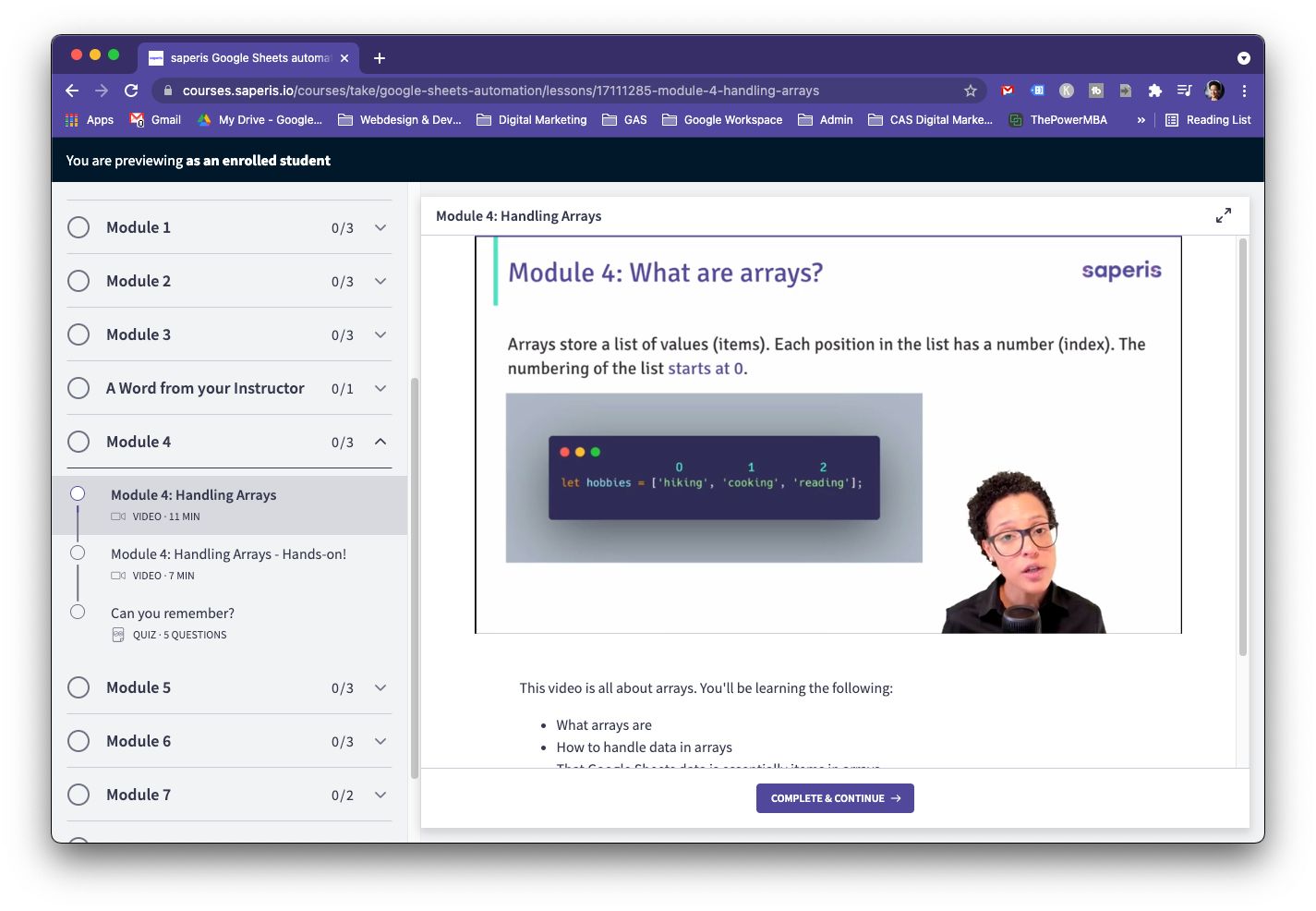 We offer our own Apps Script online courses that are easy to follow along. Chanel, as the instructor of the course, explains basic coding concepts and demonstrates how to put them to practice.