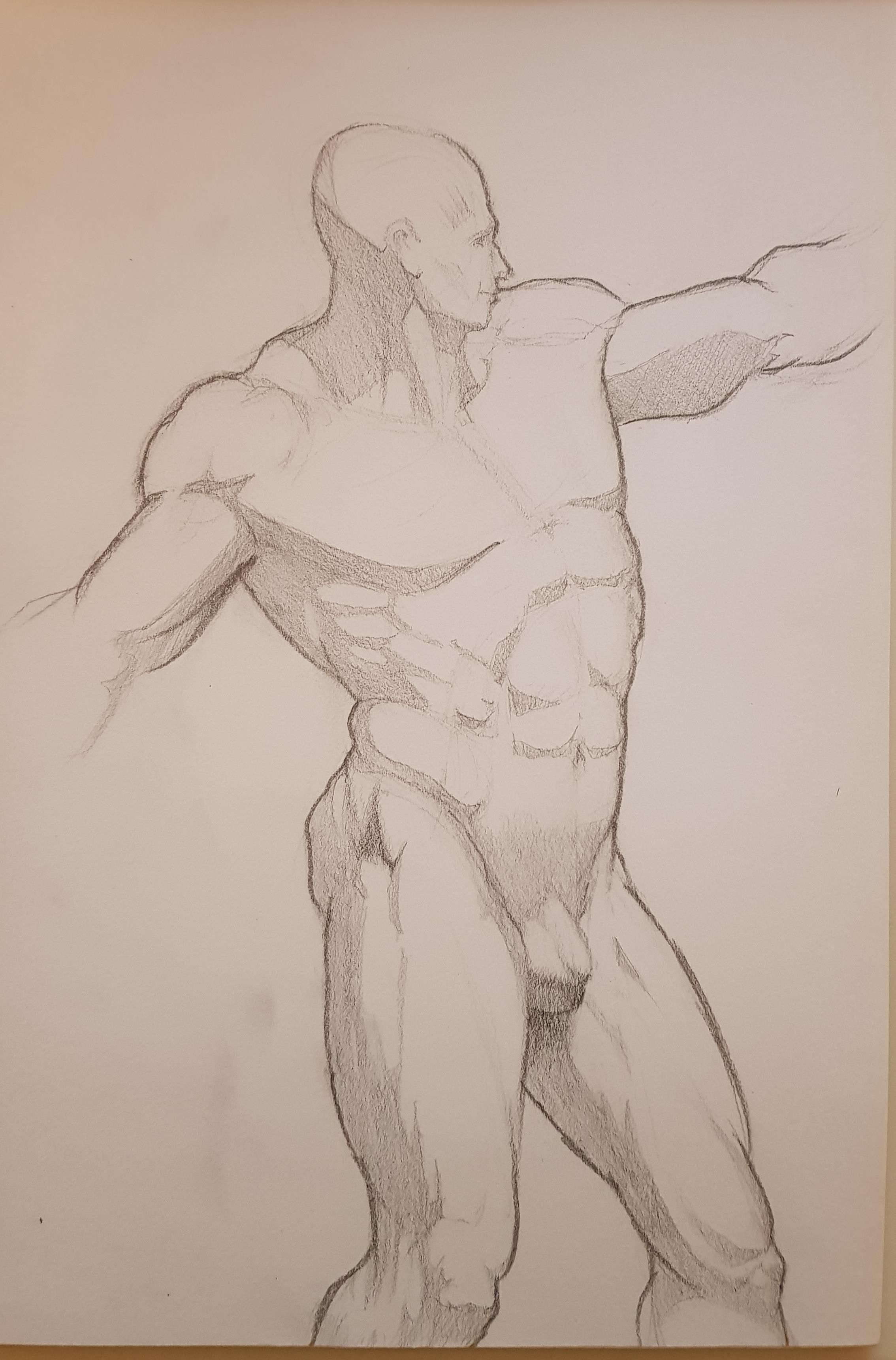 Ik begin meestal met commentaar op de verhoudingen, want dat is het eerste dat vanaf het begin echt goed gaat. Voor je zeer robuuste figuur is het belangrijkste dat het hoofd veel te klein is. Hoewel ik een paar mannen met een zeer grote borst heb gezien, is zijn ribbenkast hier erg breed in vergelijking met zijn bekken. Ik kan me voorstellen dat zo'n ribbenkast een groter bekken zou hebben (of omgekeerd), en ook de armen zouden dikker zijn (vooral de deltaspier). De humerus op beide armen is ook te kort (het ellebooggewricht moet verder van de romp staan).