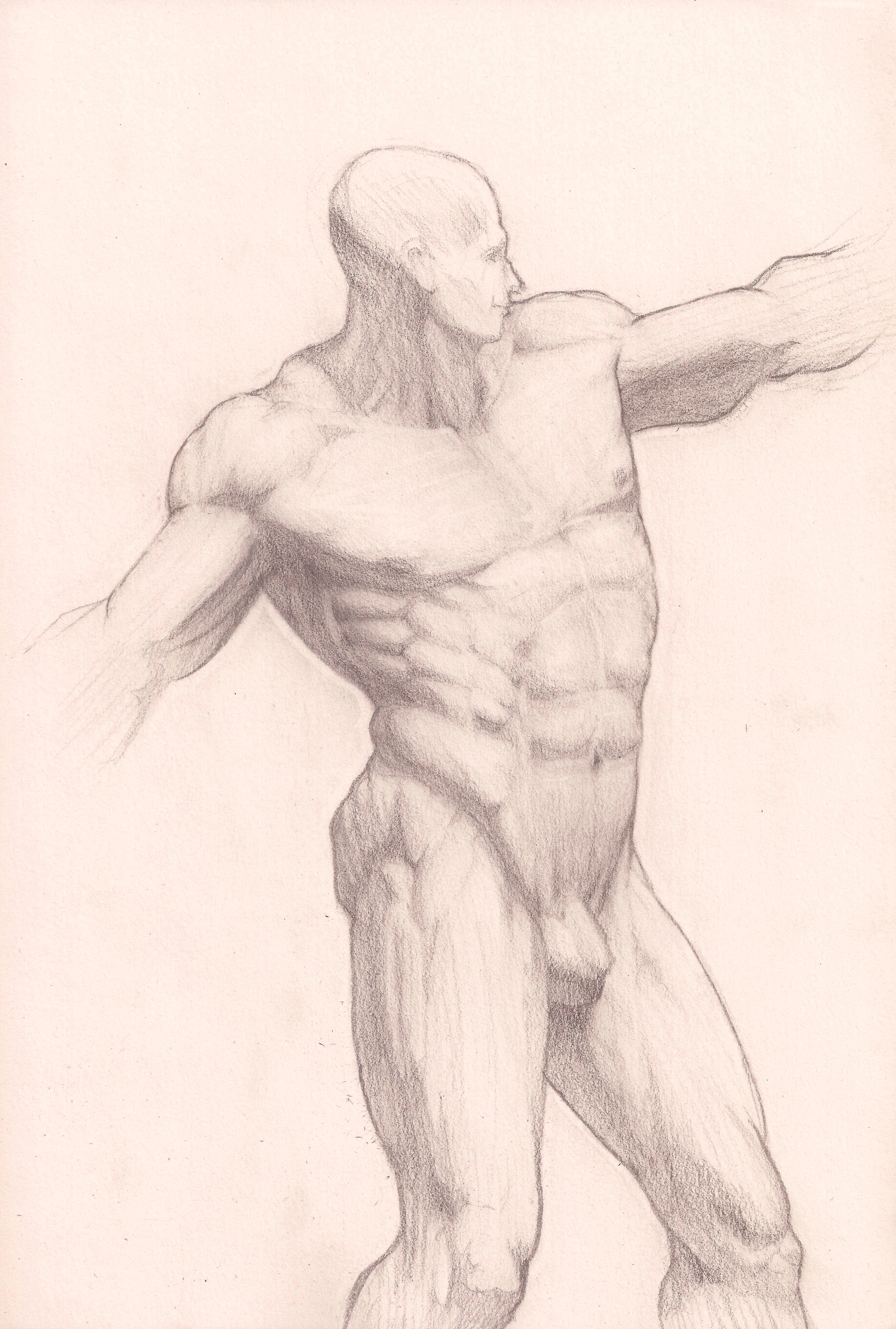 Je bent ook aardig en attent op zijn contouren; Ik zie dat je aandacht schenkt aan wat er aan zijn randen gebeurt. Voel je vrij om te experimenteren met misschien het verzachten van de rand van een deel dat zich achter een ander bevindt: bijvoorbeeld de rechter triceps als deze achter de romp gaat, of de ribbenkast aan de linkerkant als deze onder de linkerarm schuift, enz. Dit is niet een regel natuurlijk, maar iets dat nog meer diepte aan je werk kan geven.
