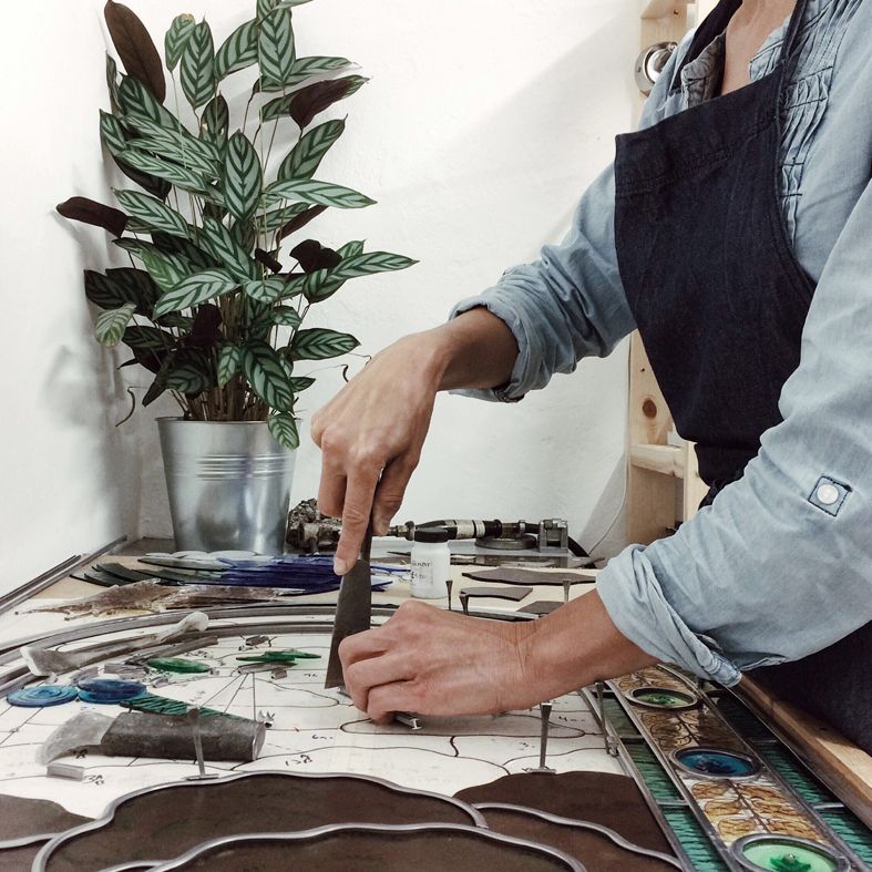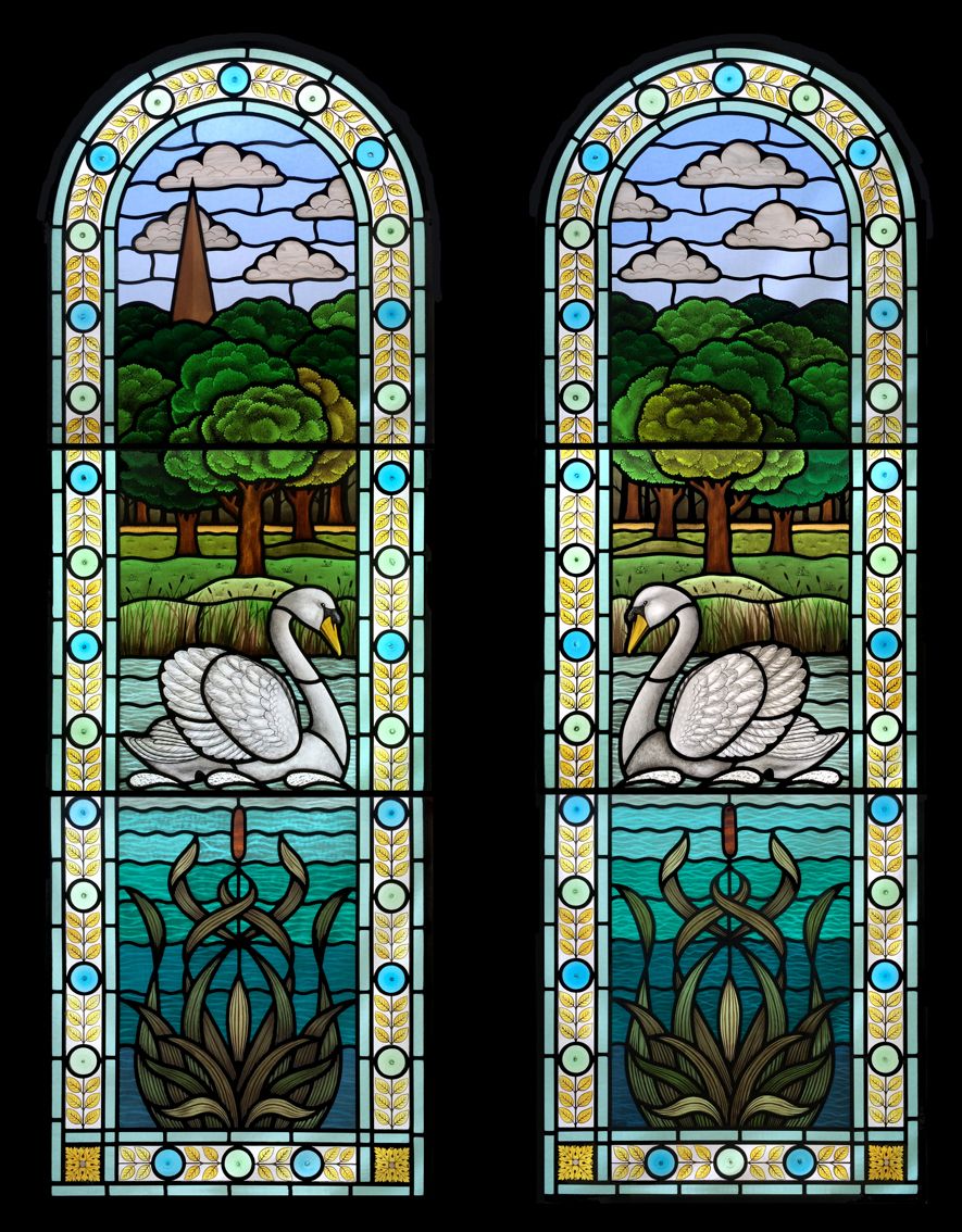 A pair of stained glass windows for sliding doors in a London house that overlooks Hampstead Heath ponds, with gliding swans and stylised bullrushes. This design was influenced by William Morris and the Arts and Crafts movement, as it was for a period property.