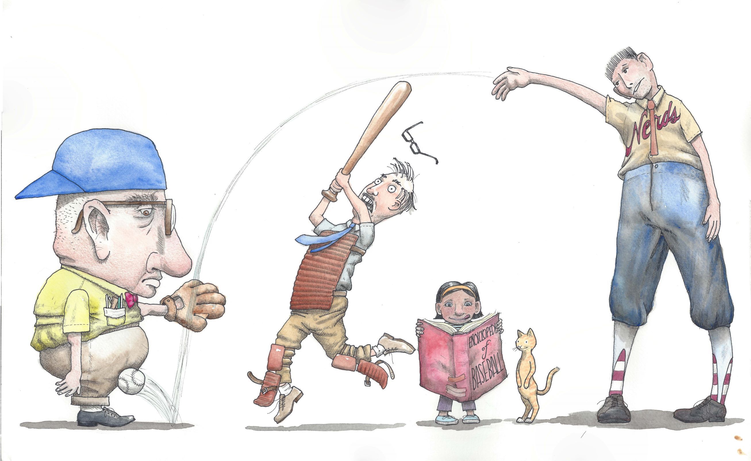 I chose baseball players instead of footballers, because I am more of a baseball fan. It occurred to me that there would technically be two types of baseball nerds--nerds who played baseball, and people, like me, who are really into baseball but don't actually play, so I chose to do tribute to both. The little girl's cat gets to also be a baseball nerd, because my cats watch baseball with me, and I liked the little cat when I sketched him. My sketches before the final illustration are hardly worth including, (I hope this does not affect my grade ;) ) and a couple of them got lost, (again, I have cats, and they tend to enjoy stray pieces of paper...) but I included one picture, anyway.