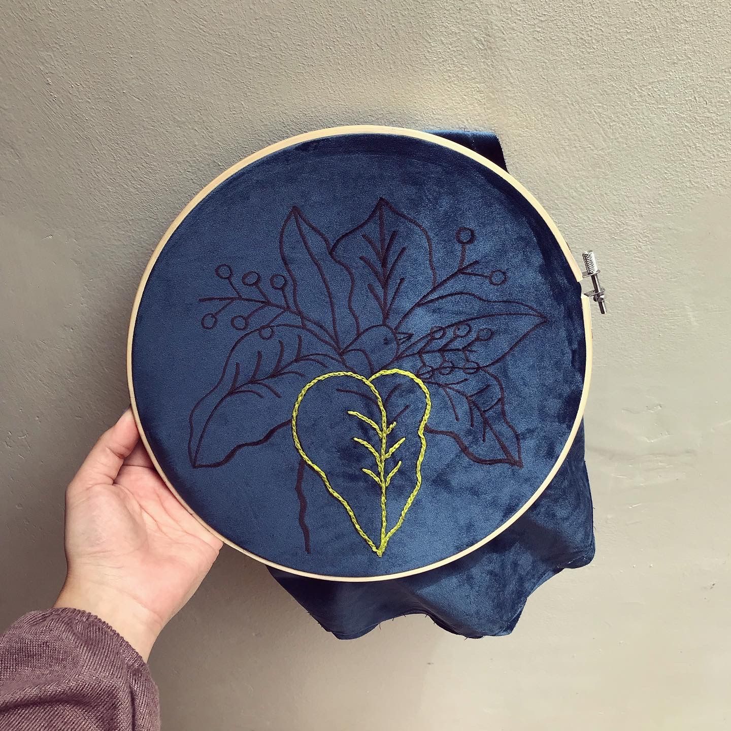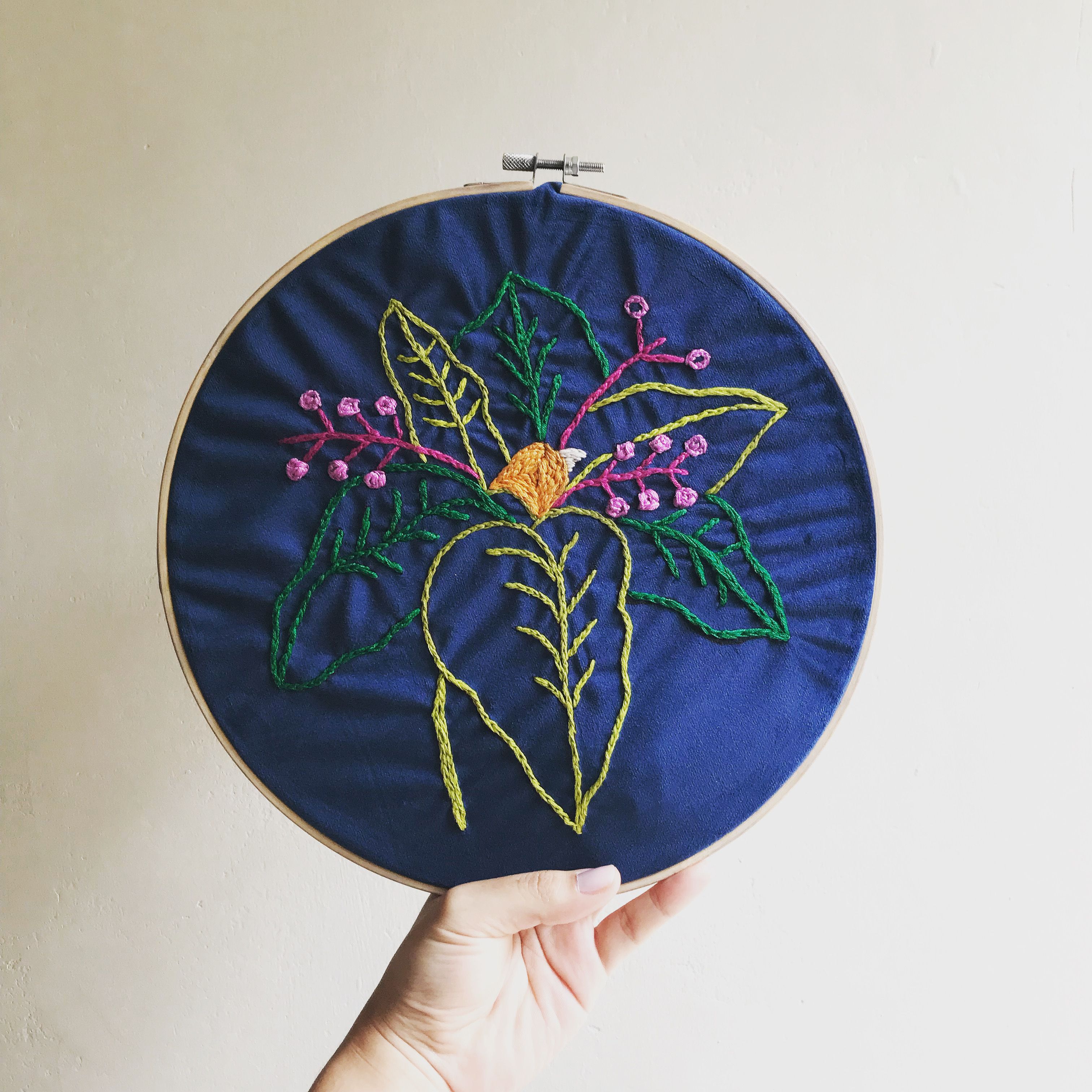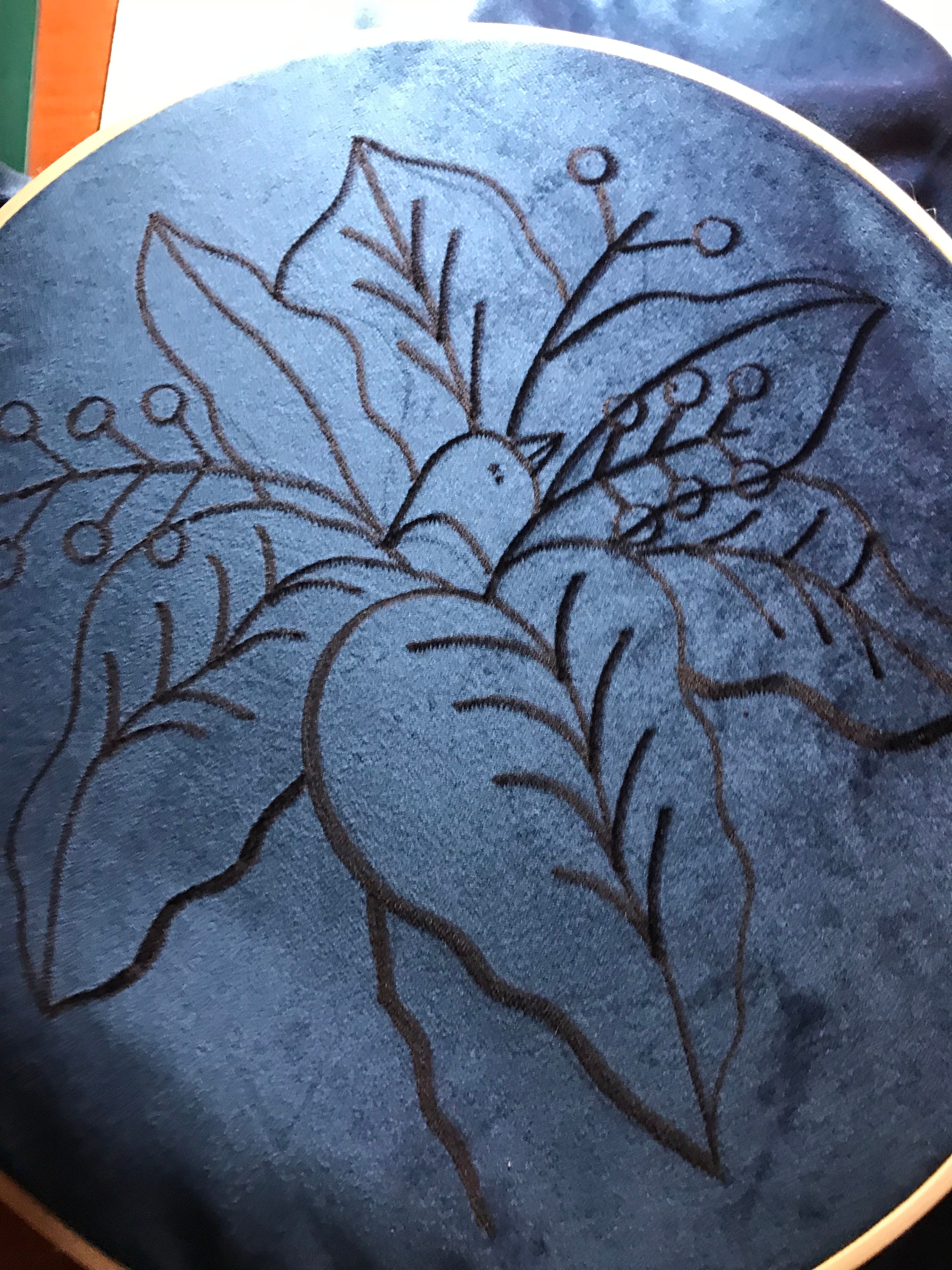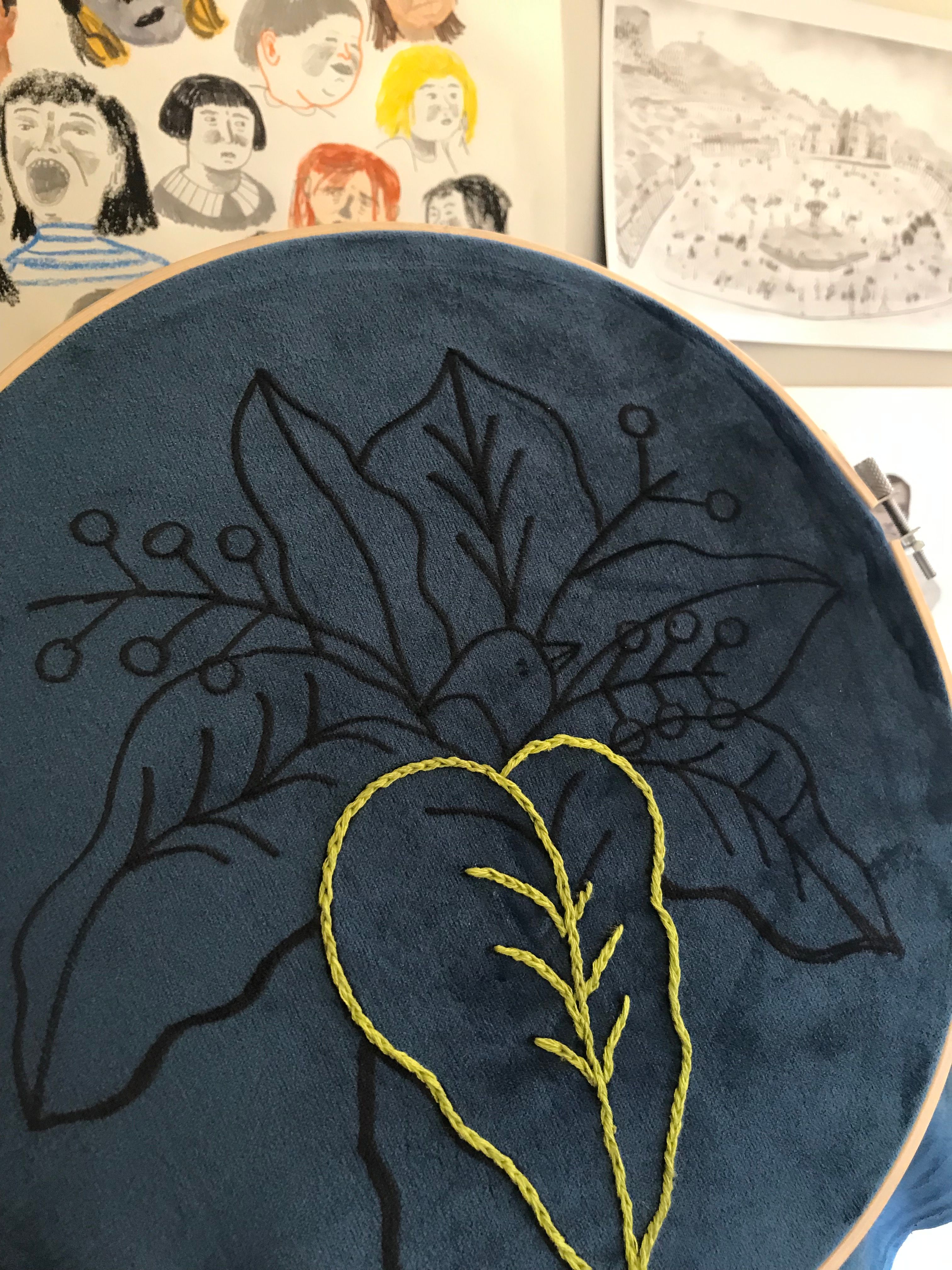 Un cojín nuevo para bordar. Tenía un dibujo que esperaba en mi bitácora hace mucho y decidí traspasarlo a la tela. Escogí los colores más parecidos al boceto pero que también contrasten bien con la tela azul aterciopelada. El resultado me gustó mucho y espero usar otra tela para combinar la ilustración y el bordado como técnicas creativas e inspiradoras.