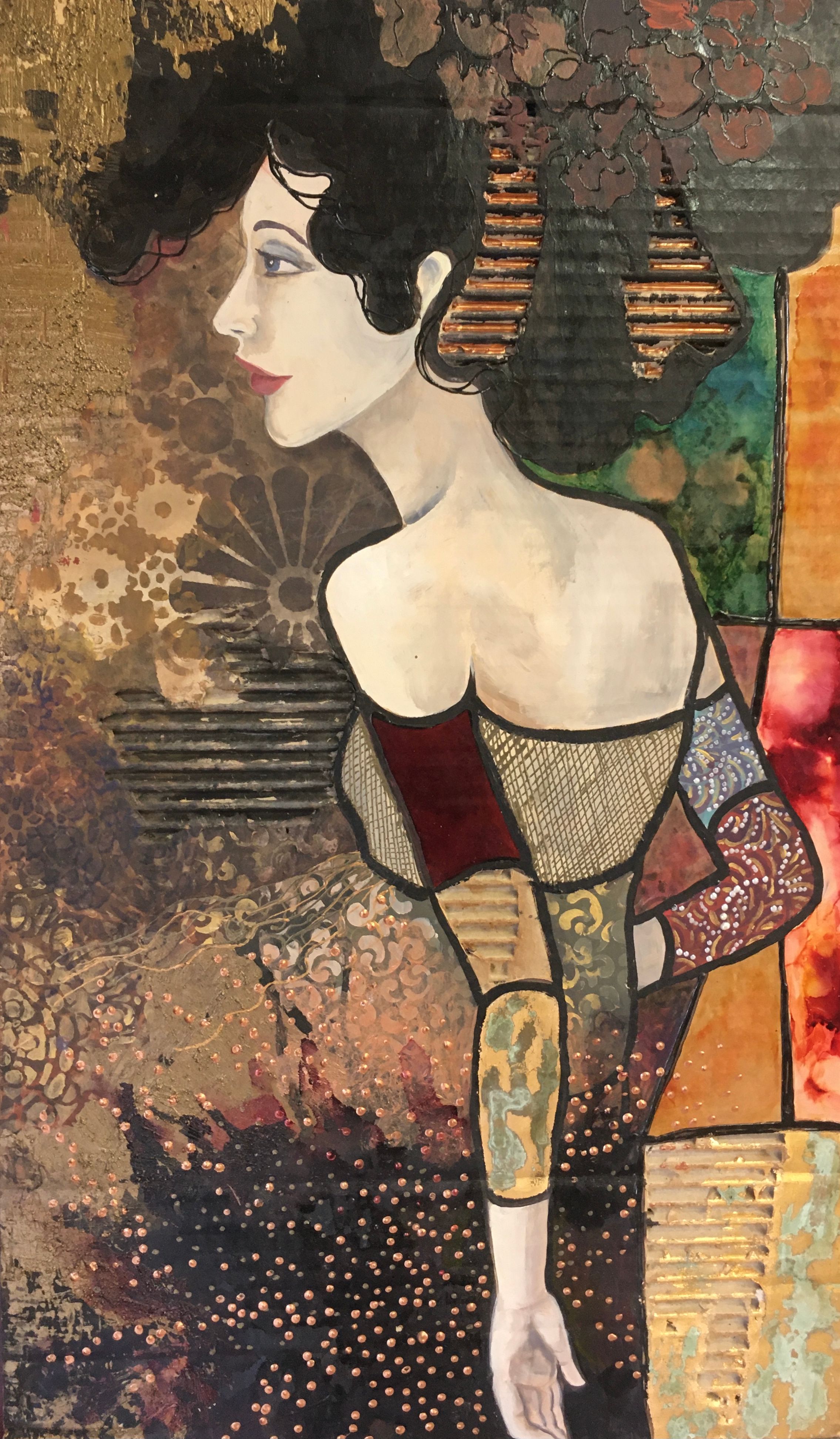Dit project, gemaakt op verpakkingskarton, gebruikt de golven onder het Havana-oppervlak voor decoratieve doeleinden. Ik heb verschillende technieken en materialen toegepast, krassen, glazuren, spatel- en stencilpassages. Sommige delen bevatten alcoholinkt en bladgoud vergulding met oxidatie verkregen met het gebruik van bepaalde media.