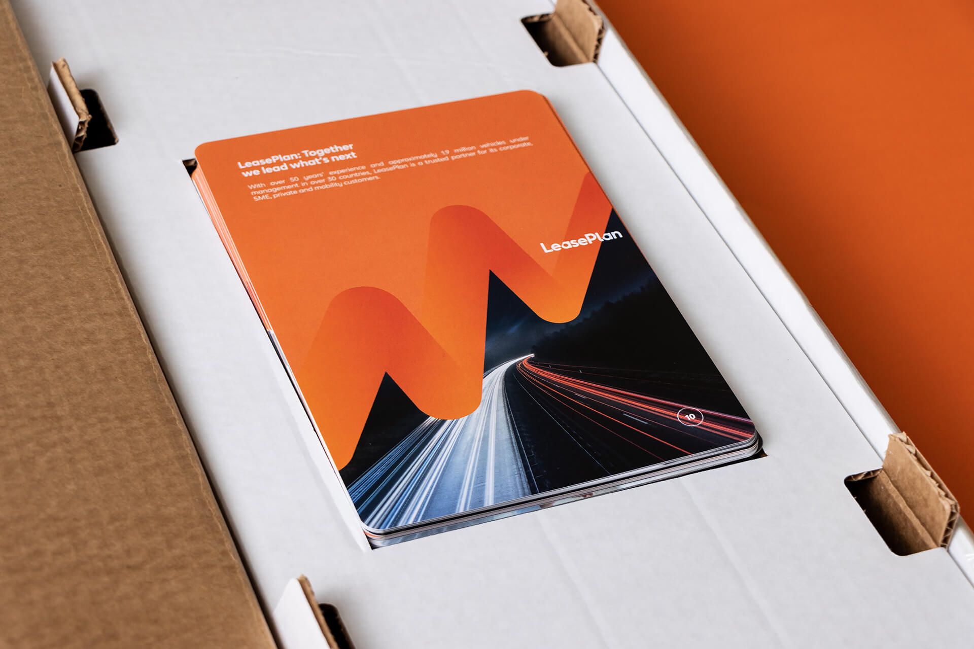 When asked by the client, one of the world’s leading car leasing companies, to design their executive summary of 2020, we deployed Boo Republic’s passion and understanding for unique materials that can bring a brand’s essence to life.This project’s grand guest is the asphalt cloth, a rubbery cloth-like material, used primarily for insulation on rooftops and other surfaces as well as minor road repairs, which resembles closely the look of asphalt. Here it was used to dress the top front of the executive summary’s custom designed cardboard container. It was cut, modified and glued on, all carefully performed by hand, in order for the finished product to look polished and feel durable. Visually, it creates a grungy contrast to the brand’s dynamic orange colours and clean graphics, offering an eccentric interpretation to a service widely considered mundane and corporate. The connotation of the road, via this tactile design choice is not only pleasing to the eye and the touch, but also tells a story in a simple second.