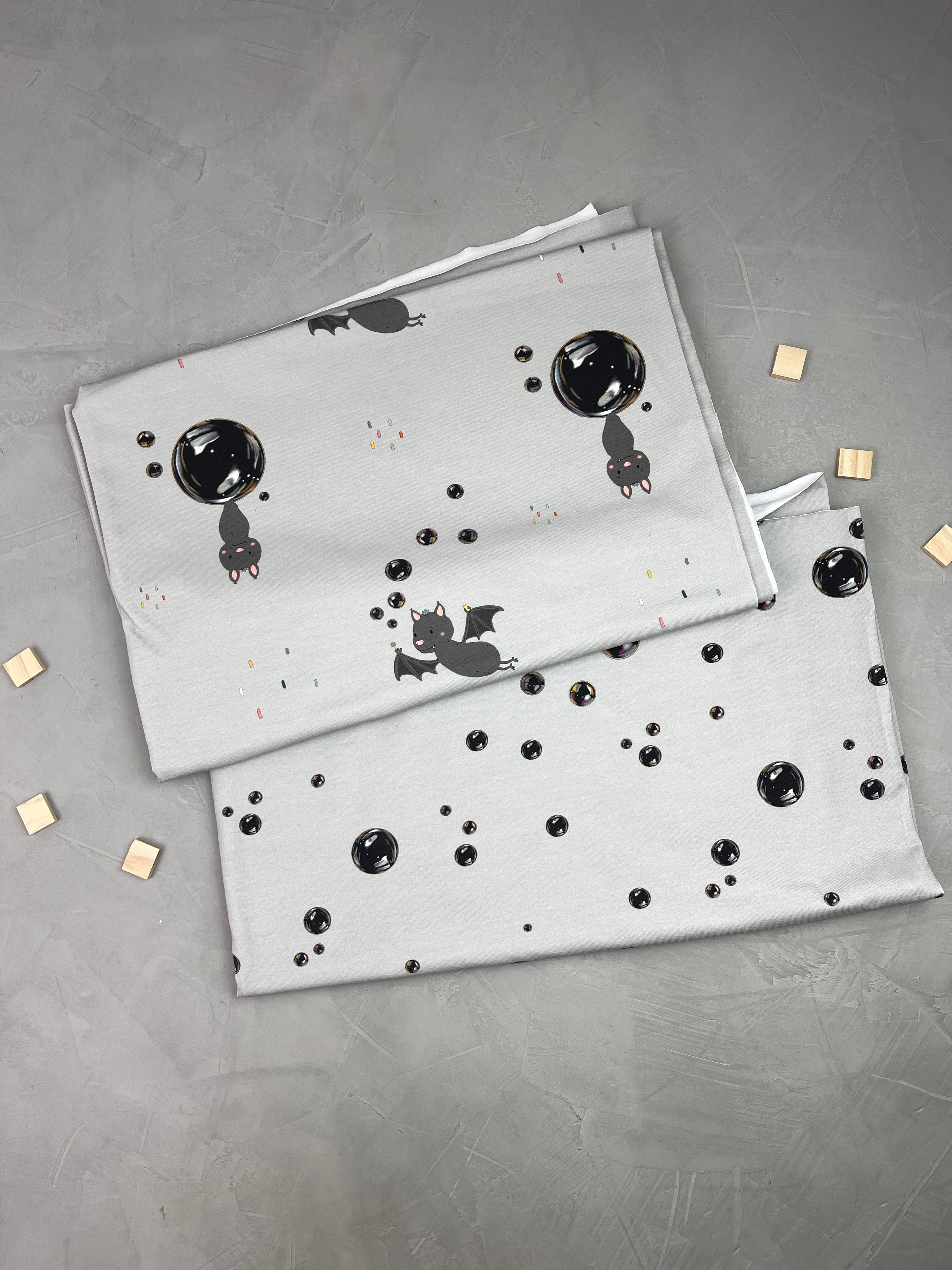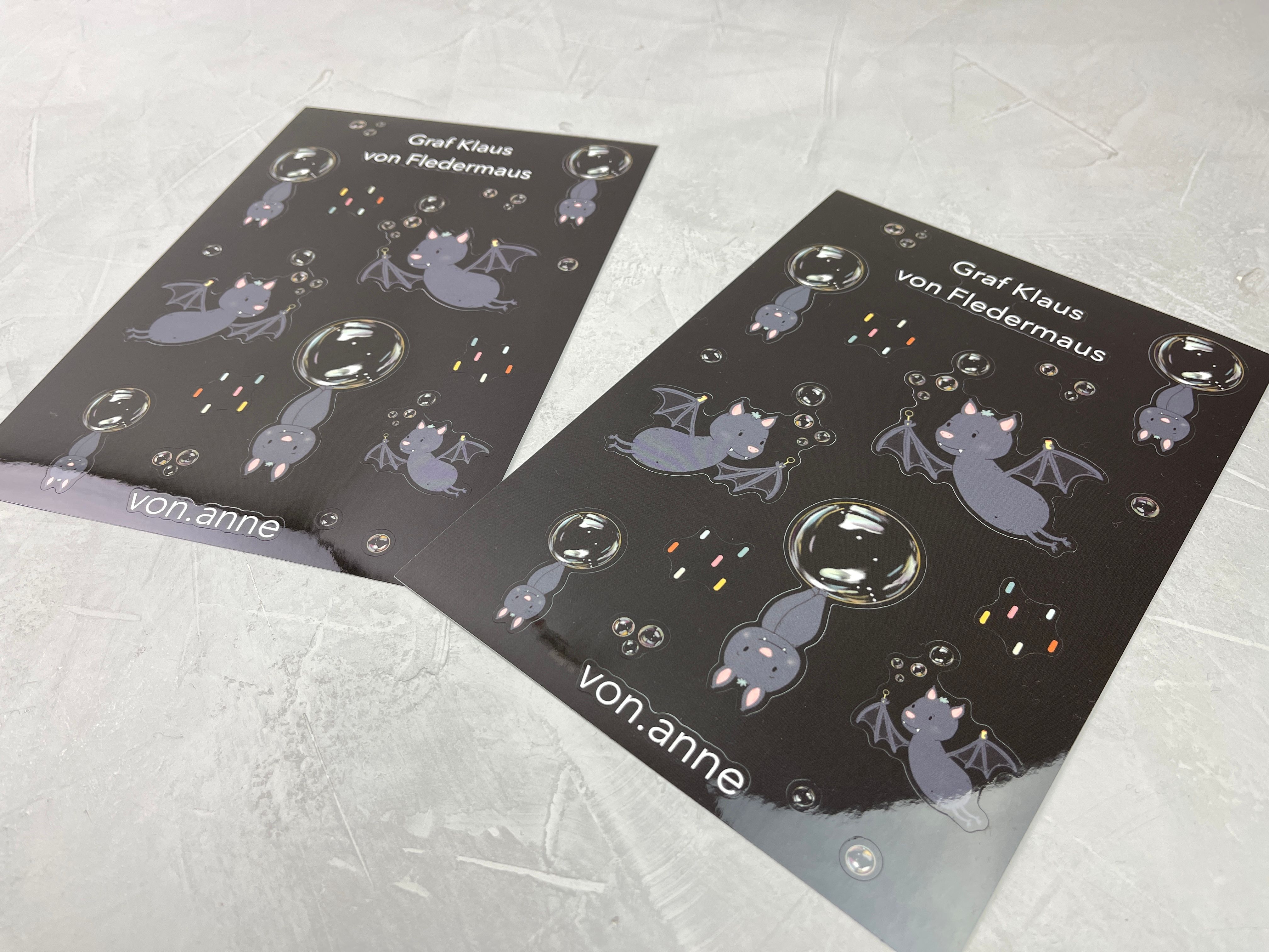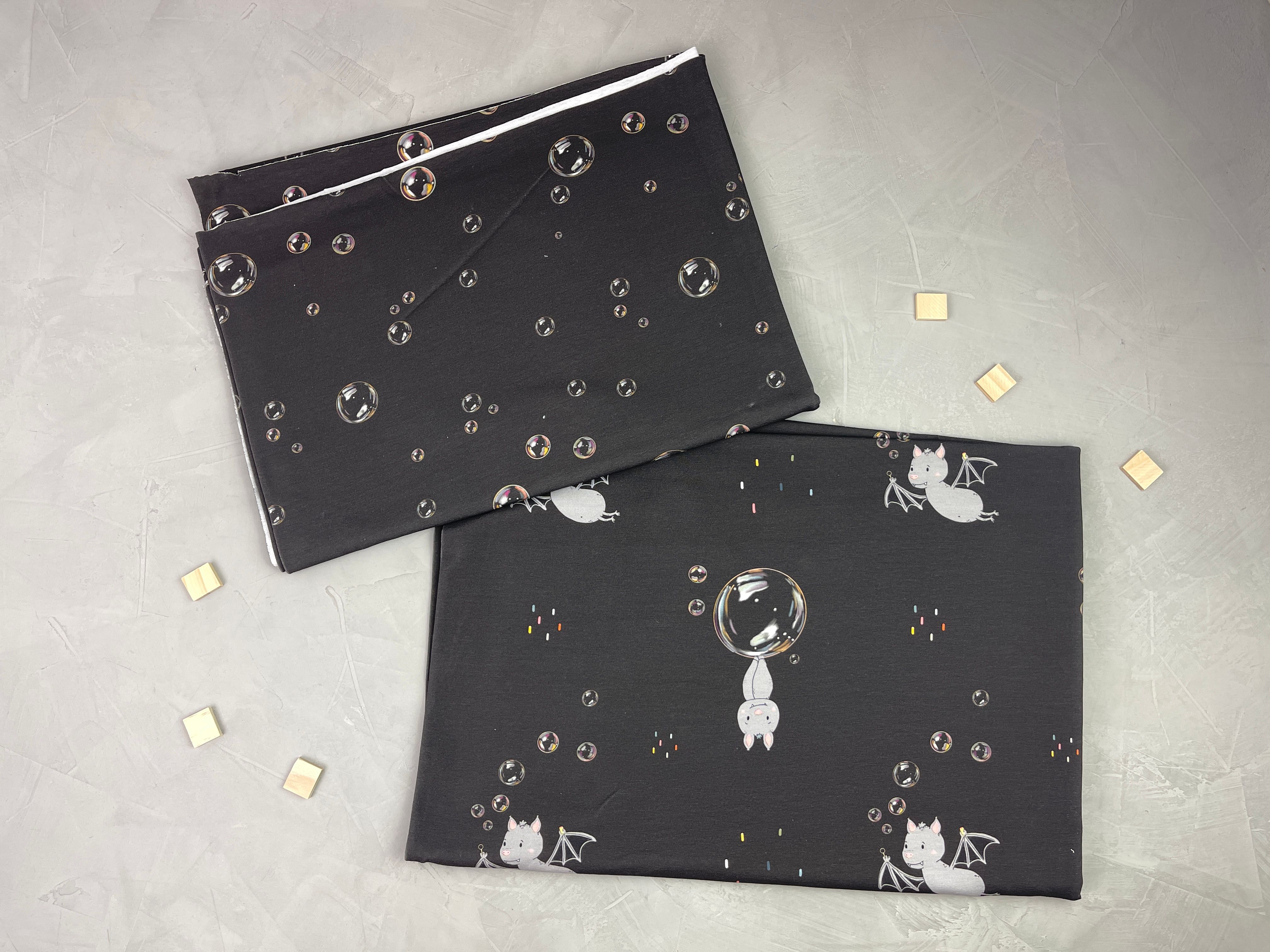 Die realistisch gemalten Seifenblasen stehen im Gegensatz zur Fledermaus im Comic-Stil. Der absolute Bestseller in meinem Onlineshop!