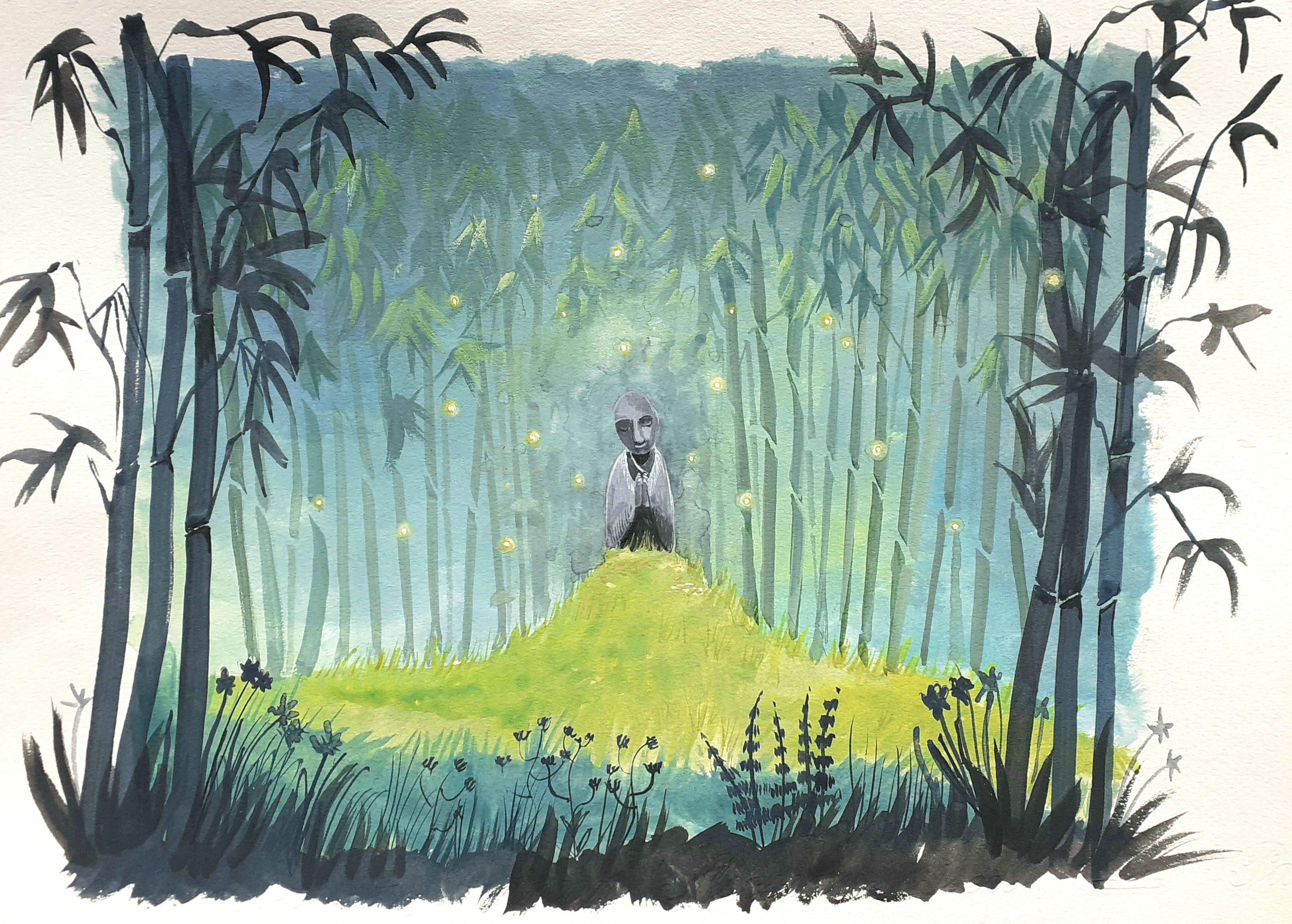 Ah wat heerlijk om het hele tafereel te zien! Ik kan zien hoe de animatie-achtergronden je schilderij hebben geïnspireerd - en je hebt de stemming en het gevoel perfect vastgelegd! De kleuren en de details die je hebt toegevoegd zorgen voor een heerlijk gevoel van diepte. Heel erg bedankt voor het delen van dit - ik hoop dat je blijft schilderen met gouache!