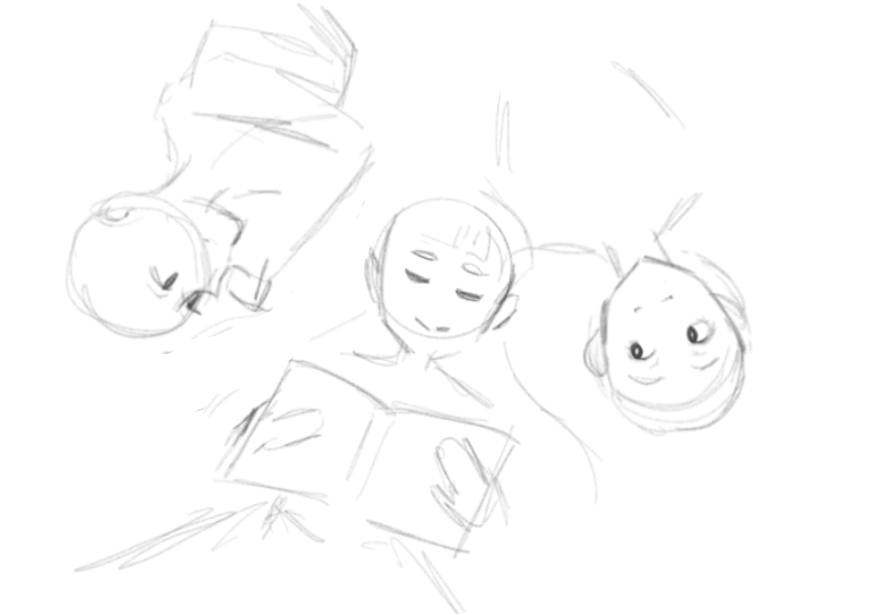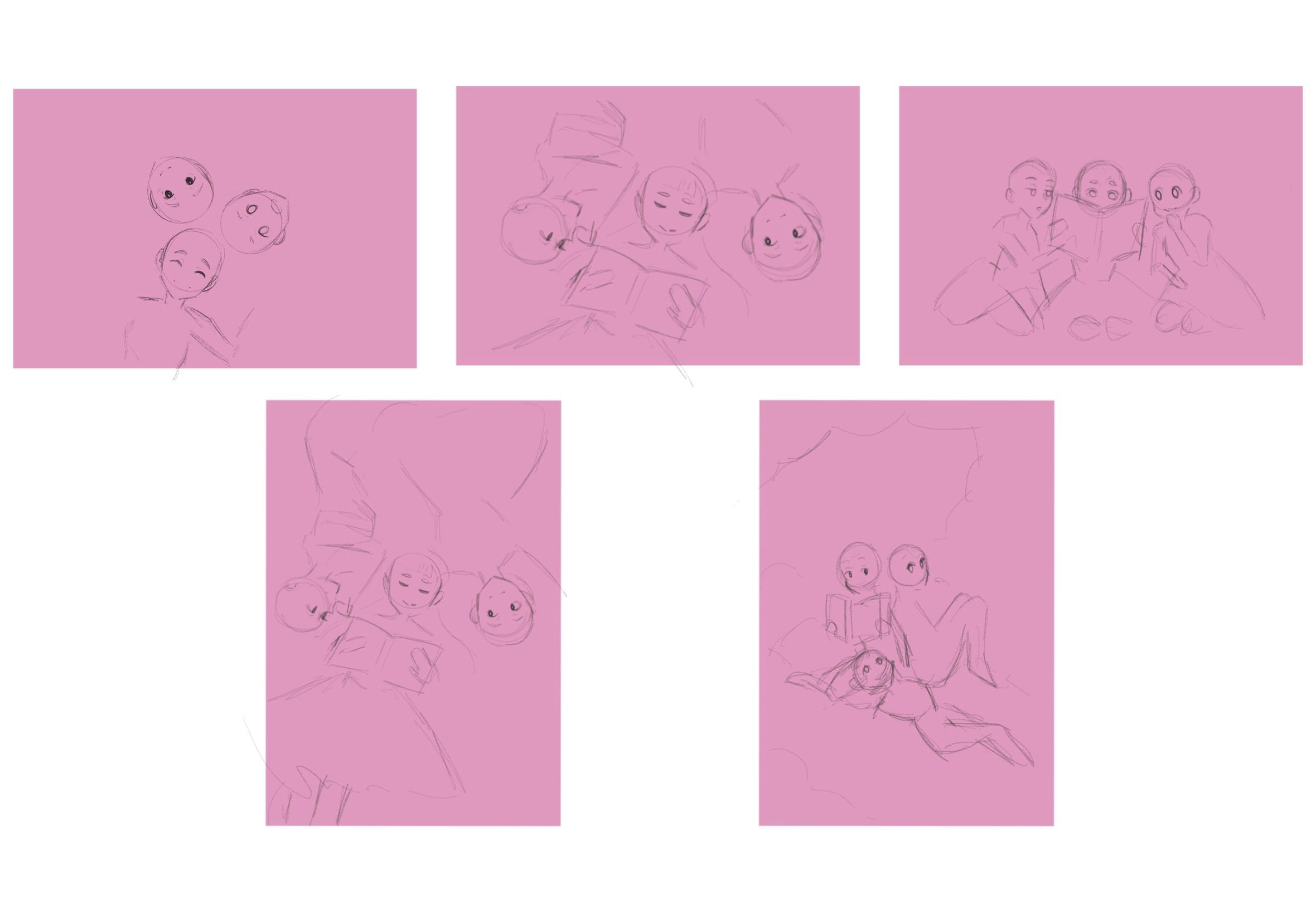 Quería mostrar un momento donde se sintiera cercanía, por lo que terminé descartando aquellos bocetos en donde la imagen se viera desde la vista de una tercera persona y terminé eligiendo aquella que enfocaba a los personajes más de cerca, mostrando sus expresiones con más claridad.