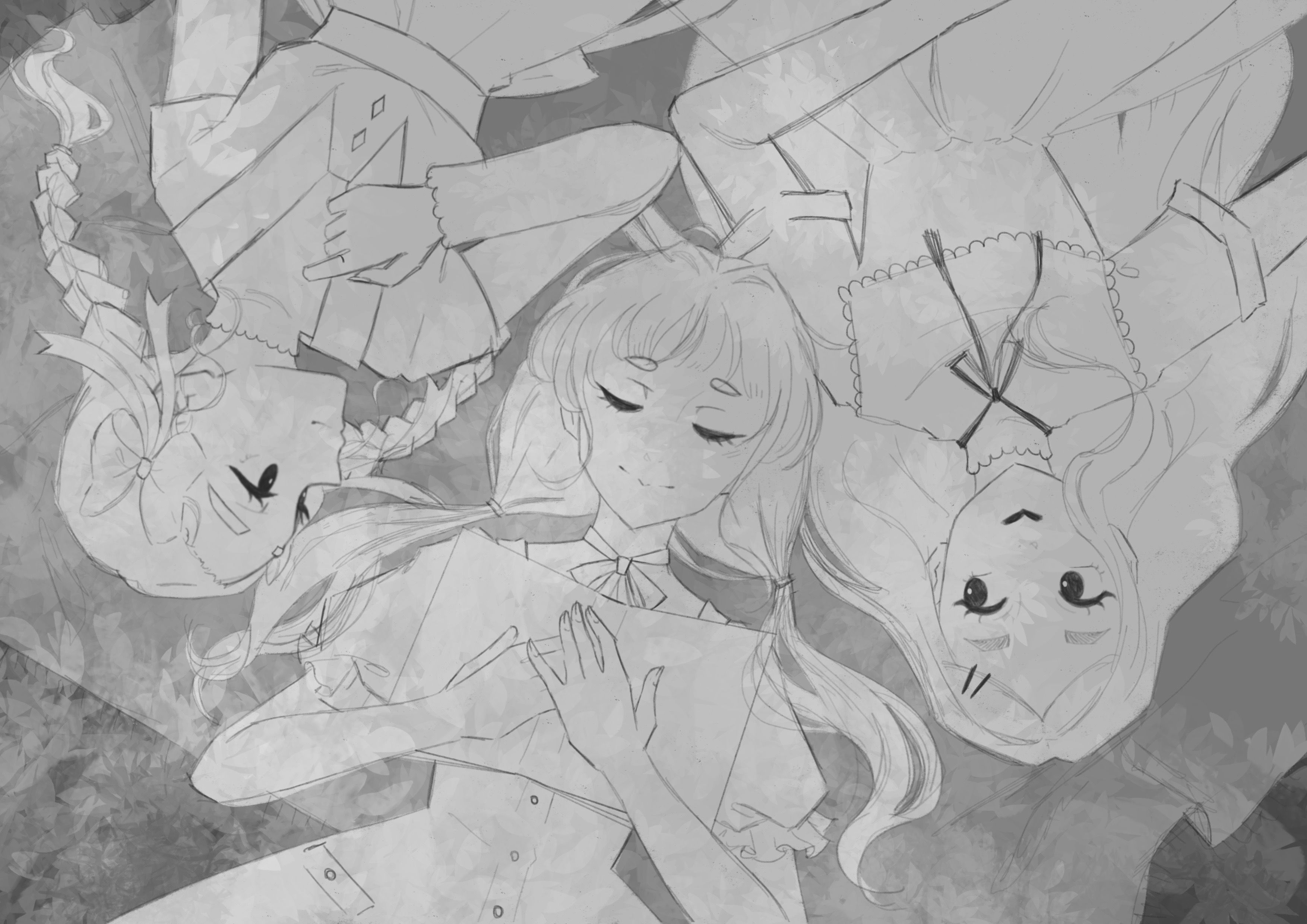 Aquí con la ayuda de 3 grises de distintas tonalidades fui seleccionando los distintos niveles que compondrían mi pieza final. Con el gris más claro seleccioné mi foco dentro del dibujo y luego con los otros 2 quise diferenciar el mantel sobre el que los personajes se recuestan del pasto, que es lo que se encuentra más al fondo.