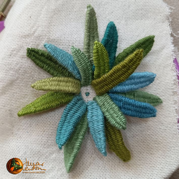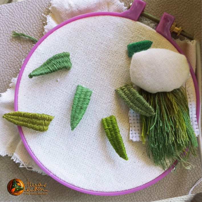 Un intento de stumpwork, el primero. Después de las hojitas sueltas hice la palmera gracias a un video tutorial de Youtube. La especie de nube con lluvia verde es un "aplique" que aún no he conseguido ubicar en ningún lugar, así como las palmeritas en sí.