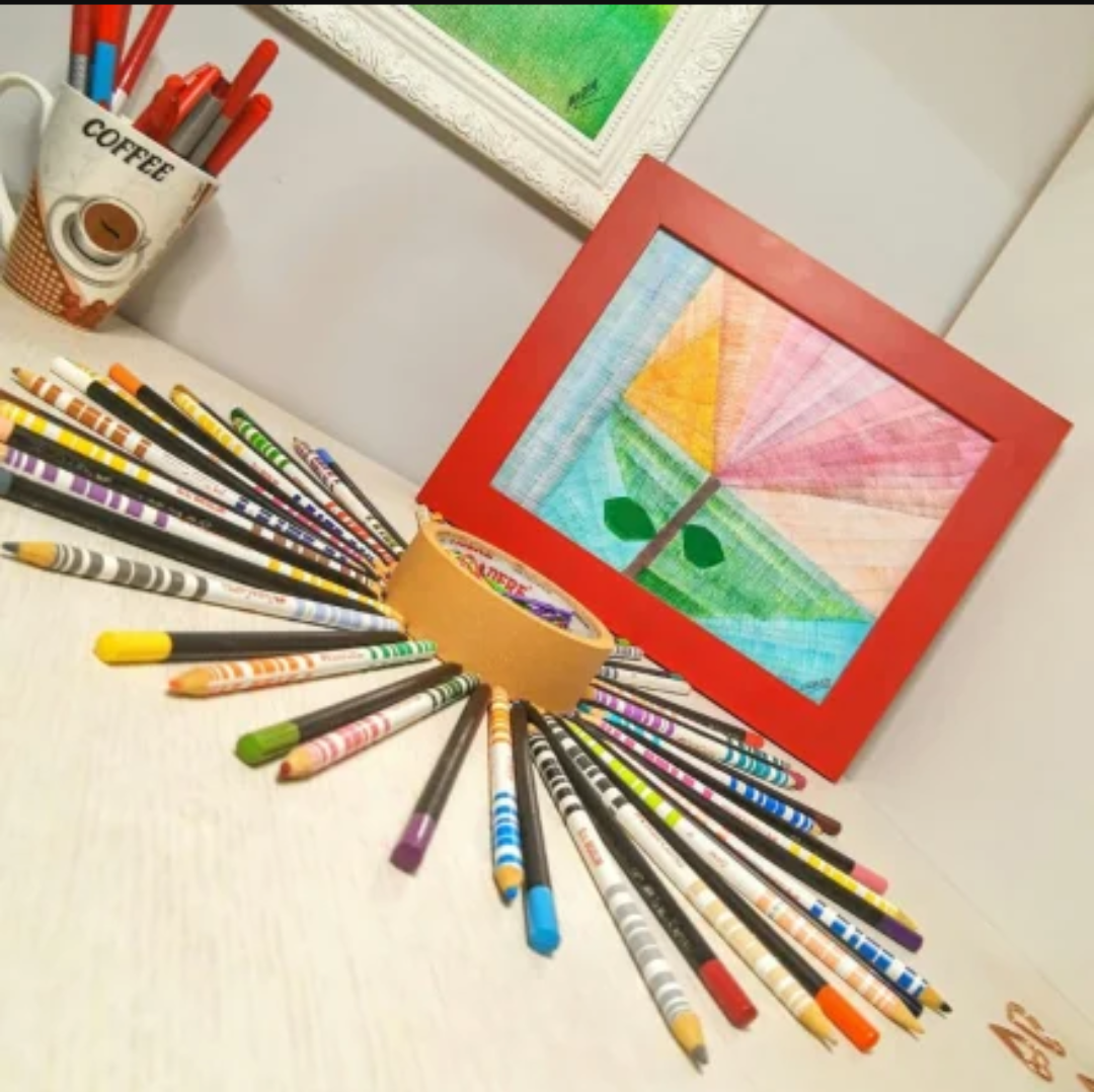 Expresso as "cores com o lápis de cor, como um mosaico ou vitral..."