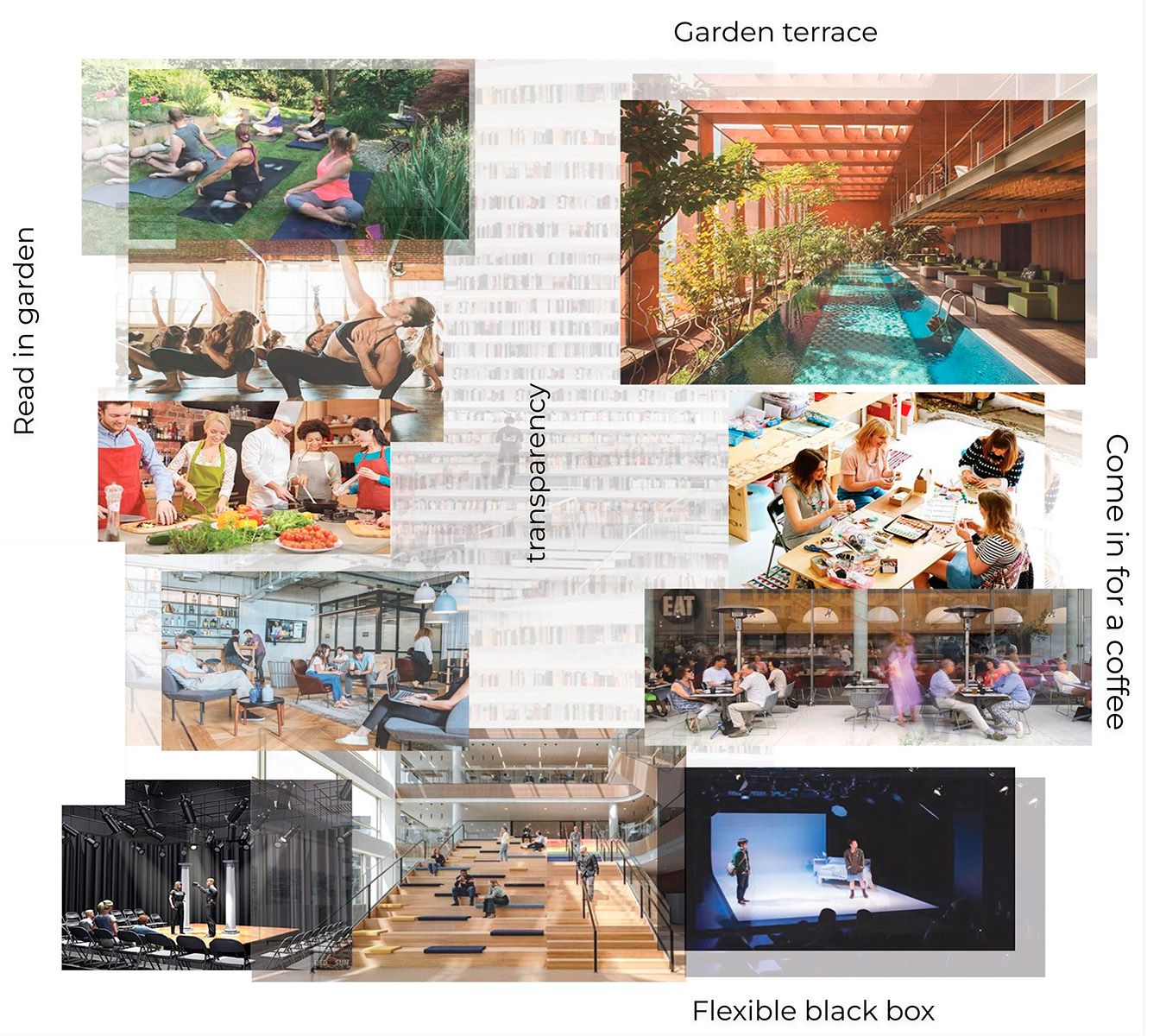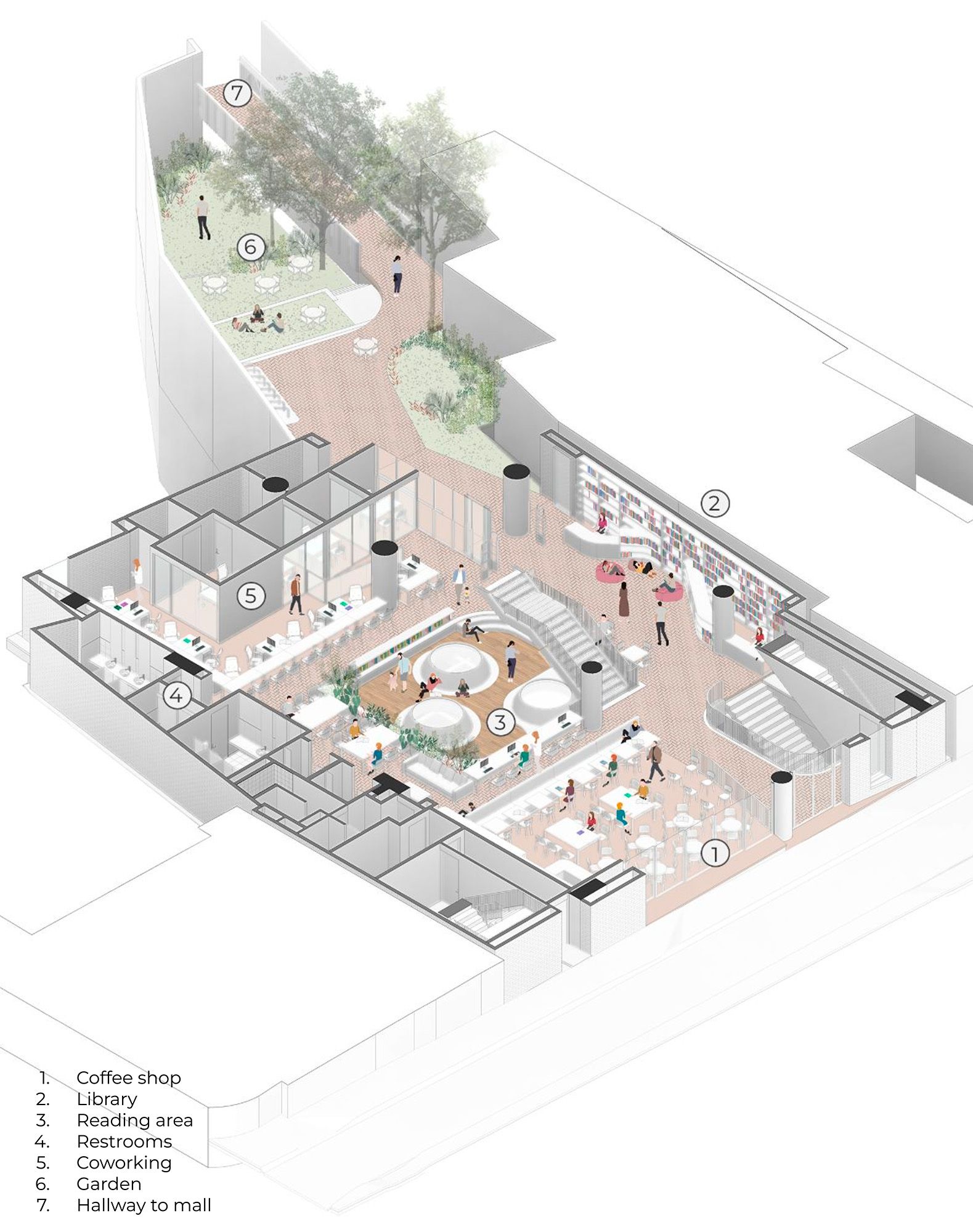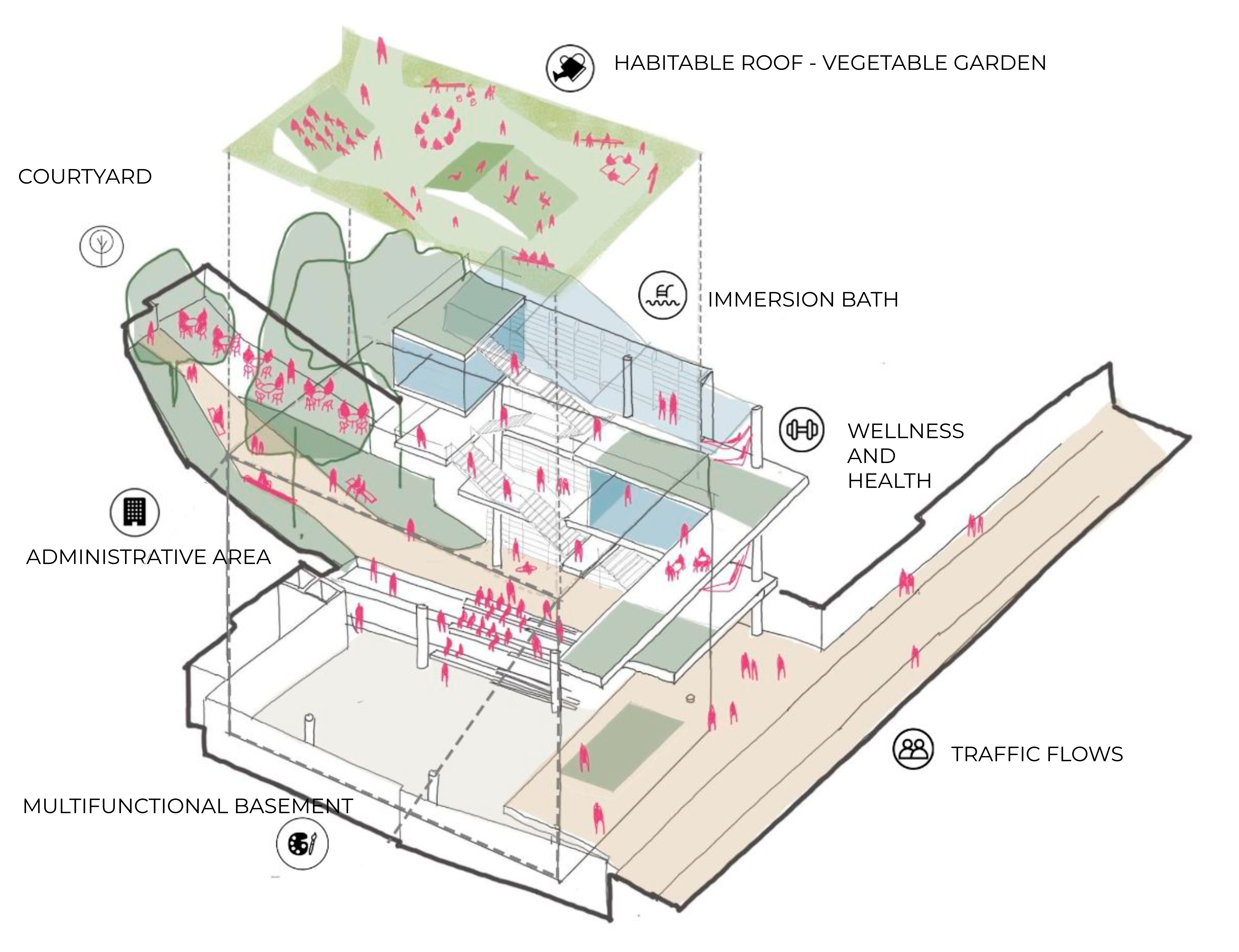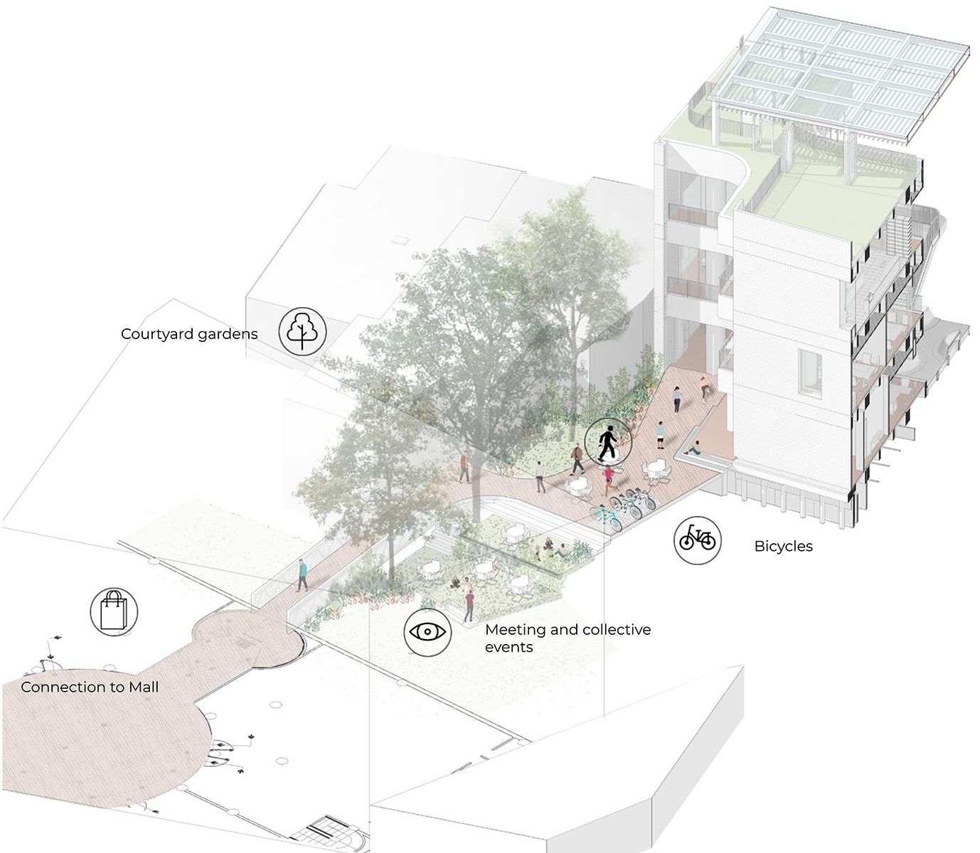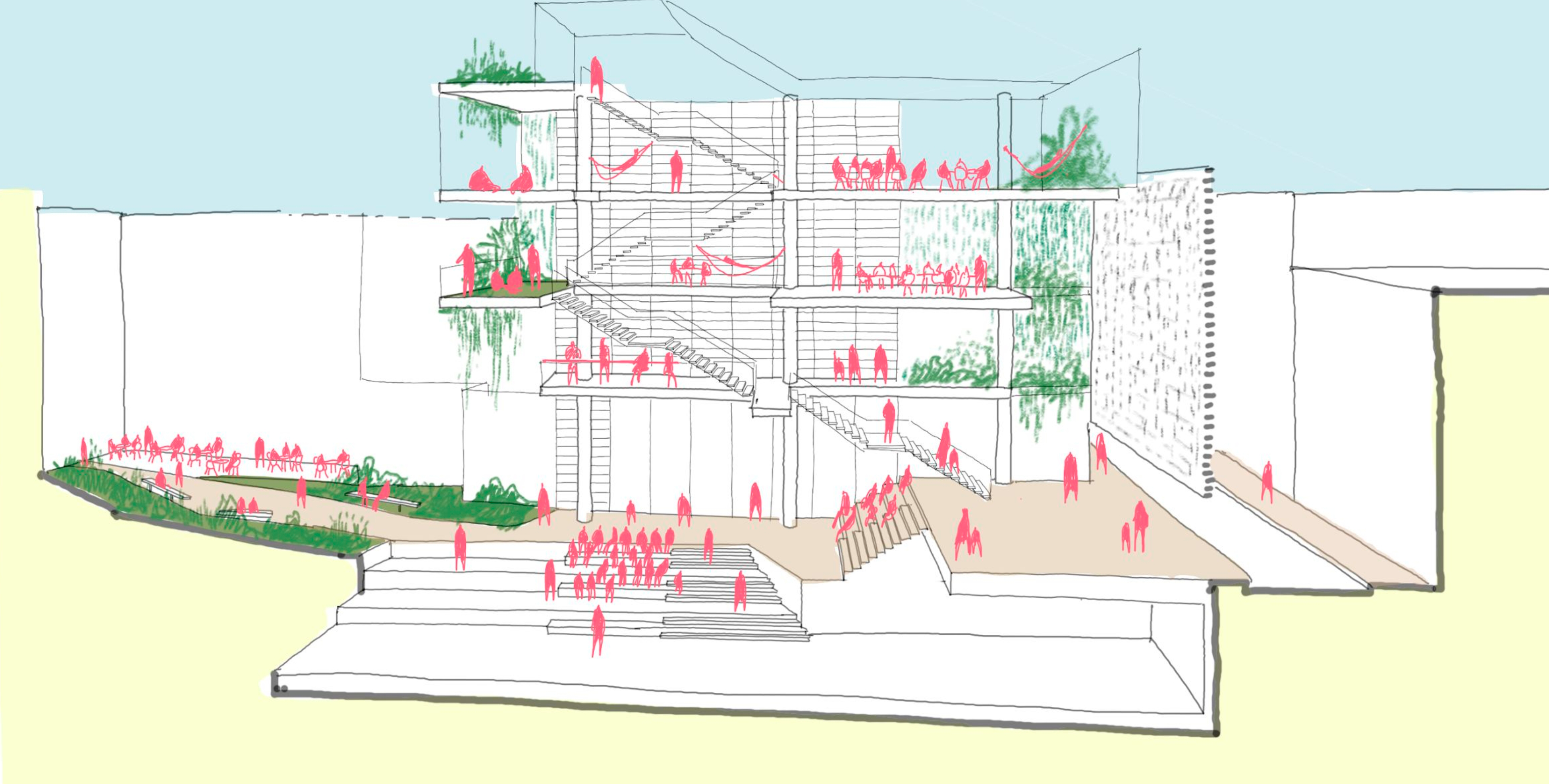 El edificio se articula a través de un patio central que evoca las construcciones tradicionales del periodo colonial y permite el cruce visual de los demás elementos del programa destinados a bibliotecas, talleres, oficinas y espacios para la cultura y el bienestar. Los últimos niveles conectan una serie de terrazas ajardinadas que captan la luz y se abren a las visuales del centro histórico.