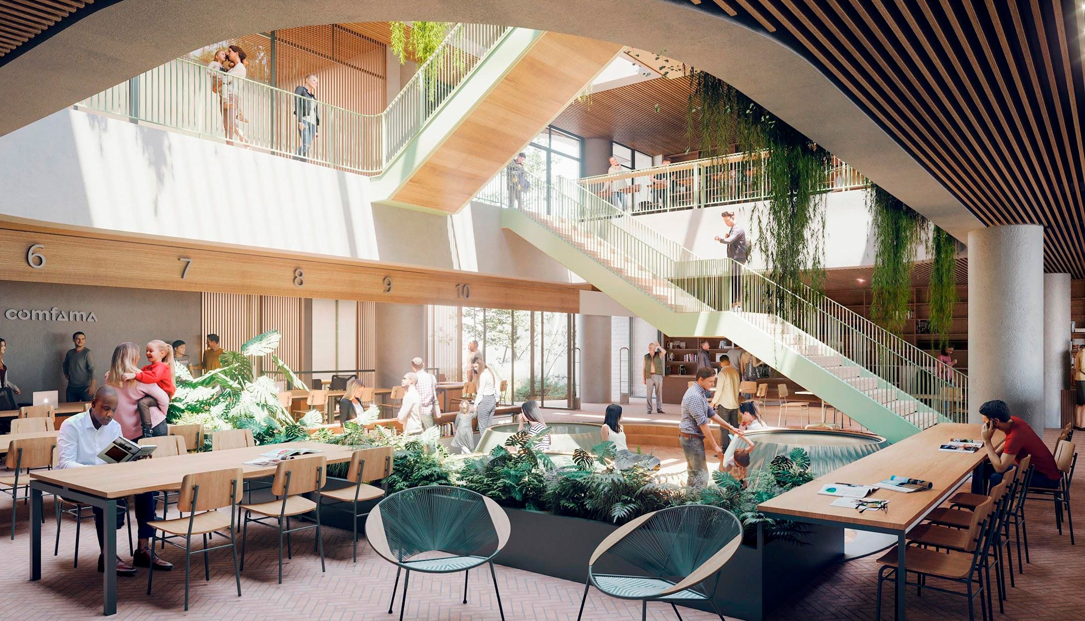 La nueva sede de Comfama Rionegro, es un equipamiento que contribuye al proceso de revitalización del centro histórico de la ciudad con un programa de servicios, educación y bienestar que se desarrolla en 3 niveles y un sótano, abiertos a la calle como continuidad del espacio público. El primer piso plantea una conexión con el interior de la manzana y los vecinos edificios públicos y comerciales ampliando la capilaridad peatonal.