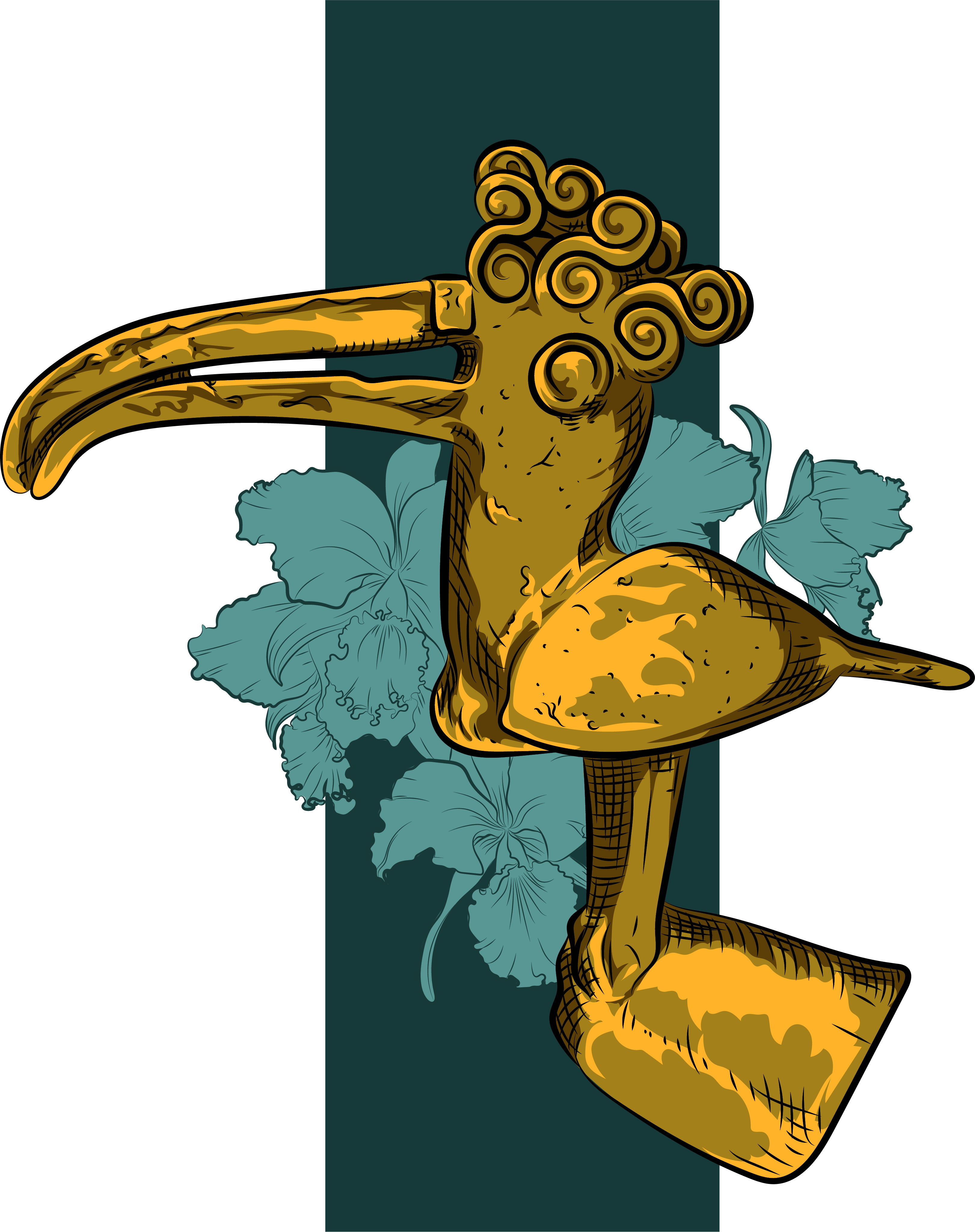 Ilustración inspirada en elemento precolombino, atrás se observan unas orquídeas, la flor nacional de Colombia