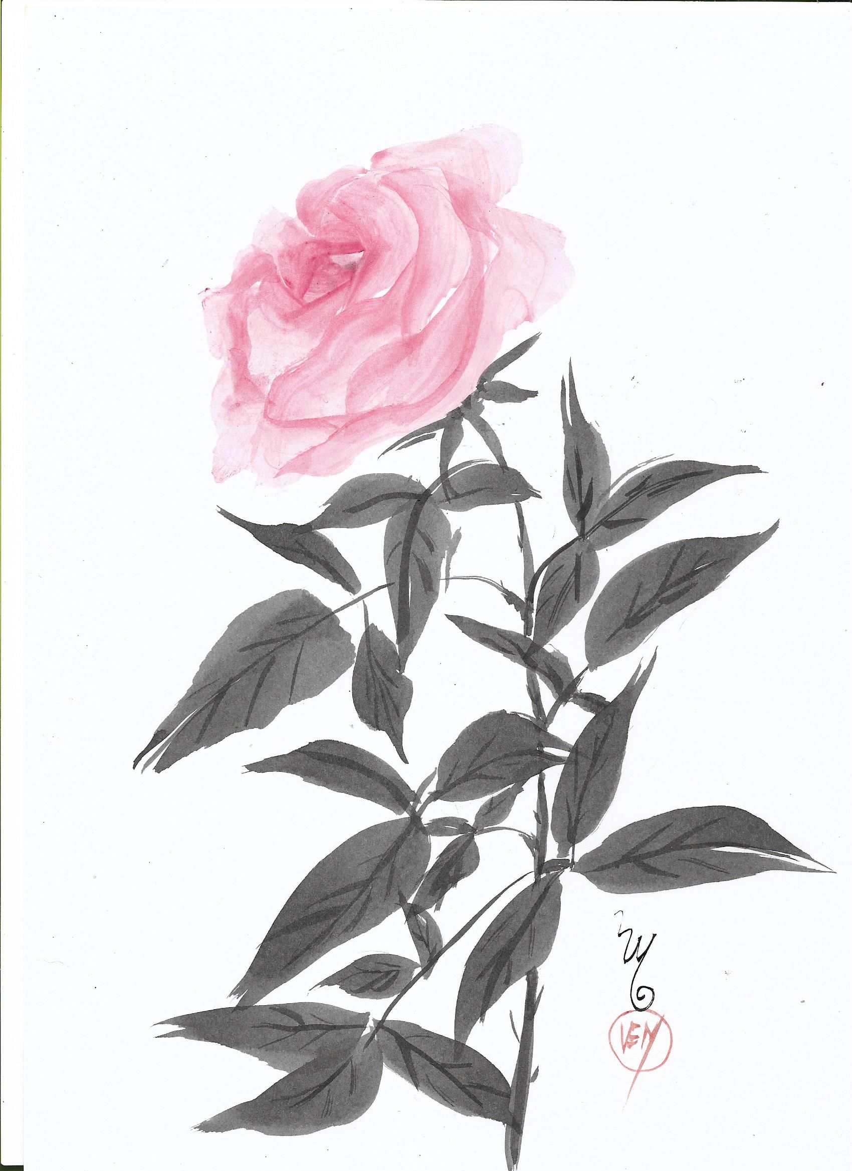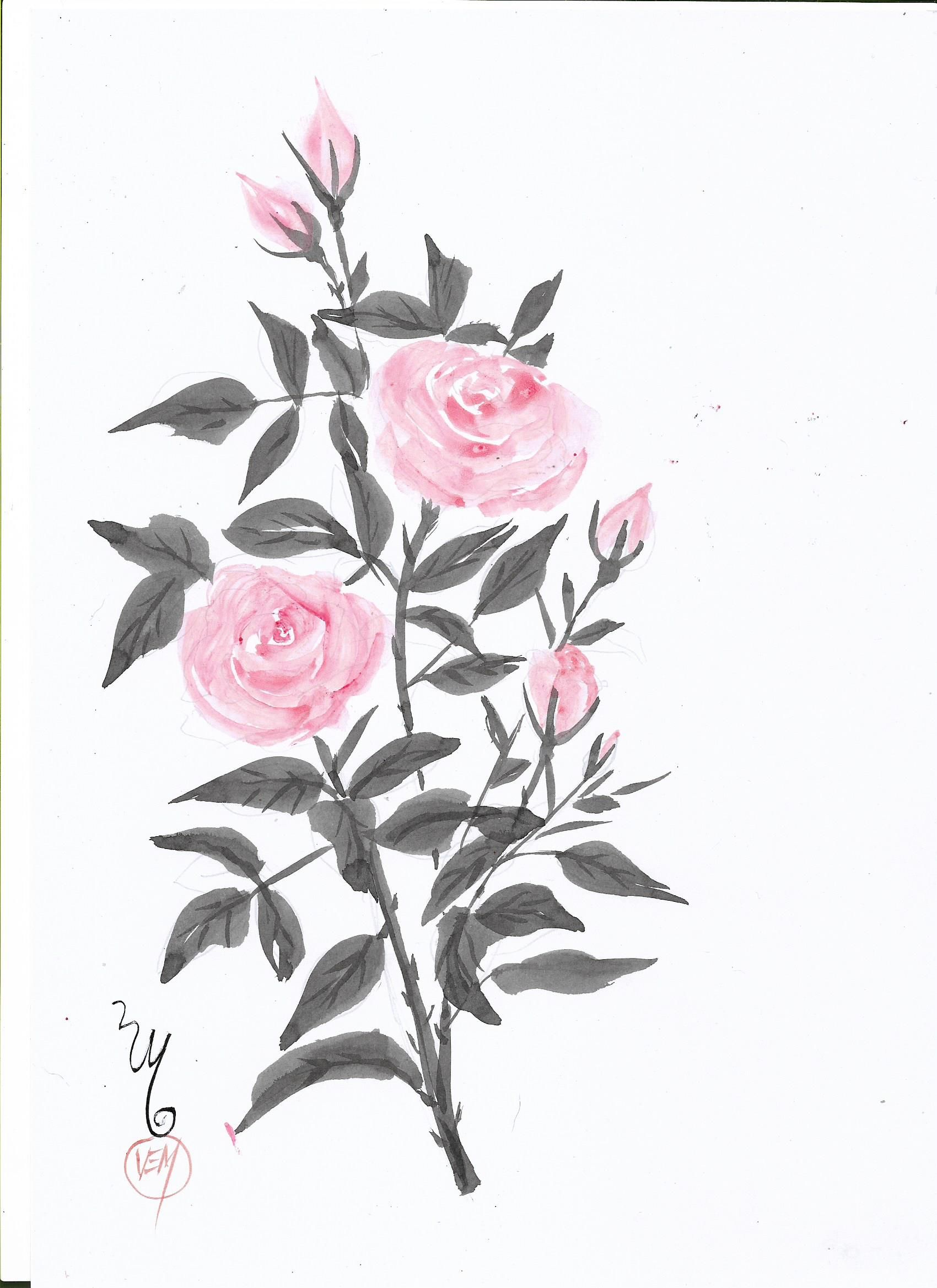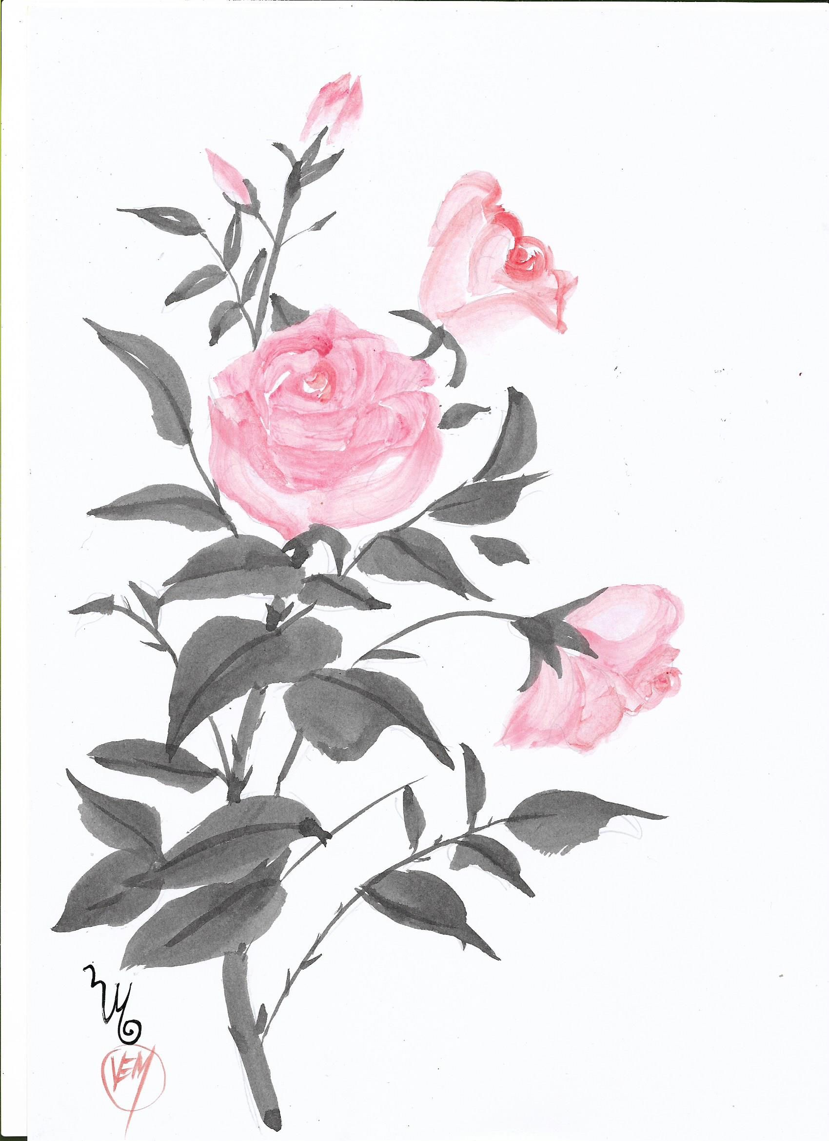 Foram várias técnicas aprendidas envolvendo tons, gradação de tinta, controle de velocidade e ritmo! Precisei praticar muito, foram muitas folhas em branco com exercícios para conquistar a leveza e fluência. Escolhi rosas para criar composições diferentes. Quanto ao selo não tenho ainda, então usei as iniciais do meu nome com pincel. Foi uma experiência muito mágica trabalhar com a mente conectada! Tive dificuldade com algumas técnicas, talvez com pinceis melhores possa dominar melhor! Gostei muito das técnicas, tanto do primeiro curso como este, e estou ansiosa para o curso de paisagens que Koshu já anunciou que será o próximo.